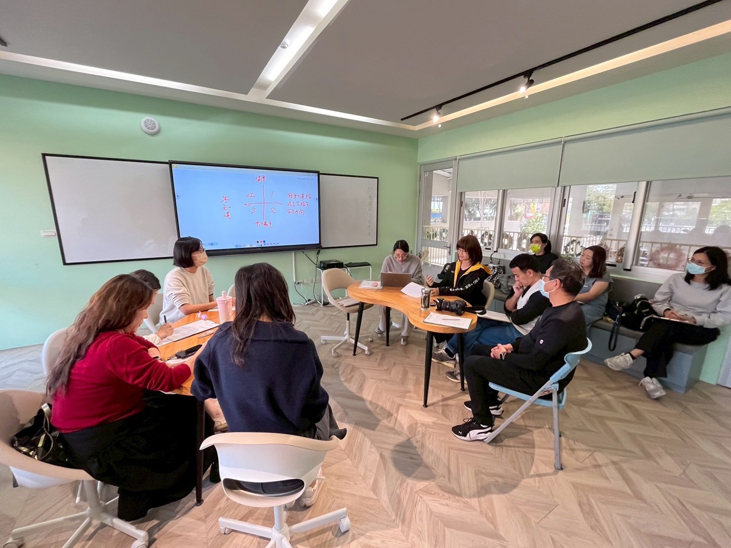 學生們積極投入課堂活動,雖偶有偏離主軸,但明娟老師以溫柔且精準的引導,透過適時提醒和提問,協助學生重新聚焦,讓討論再次回到核心,落實團隊合作。