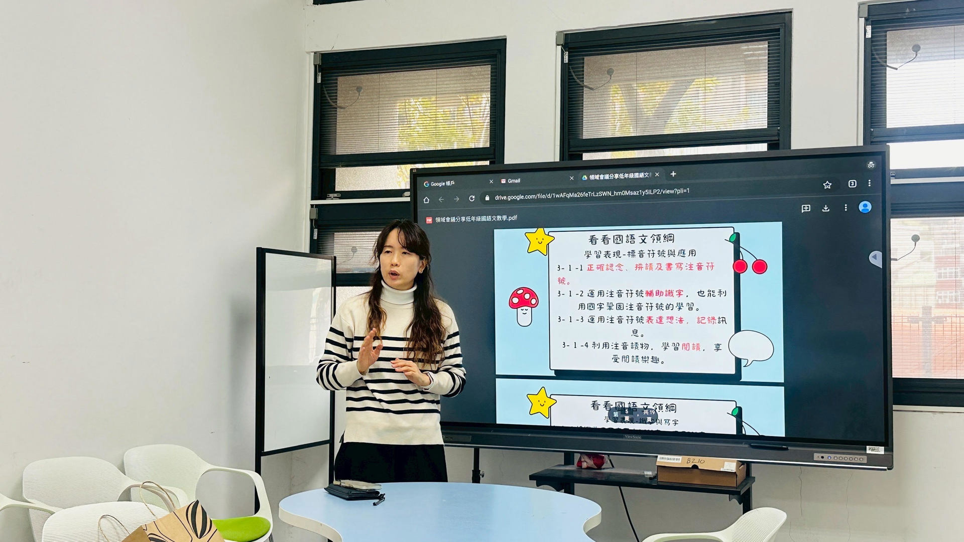 注音教學部分,分享聲母、韻母、聲調混合教學,以有意義語詞與看圖說詞建立符號與發音連結,同時整理易混淆的字形、聲韻與結合韻,搭配發音辨識練習。
