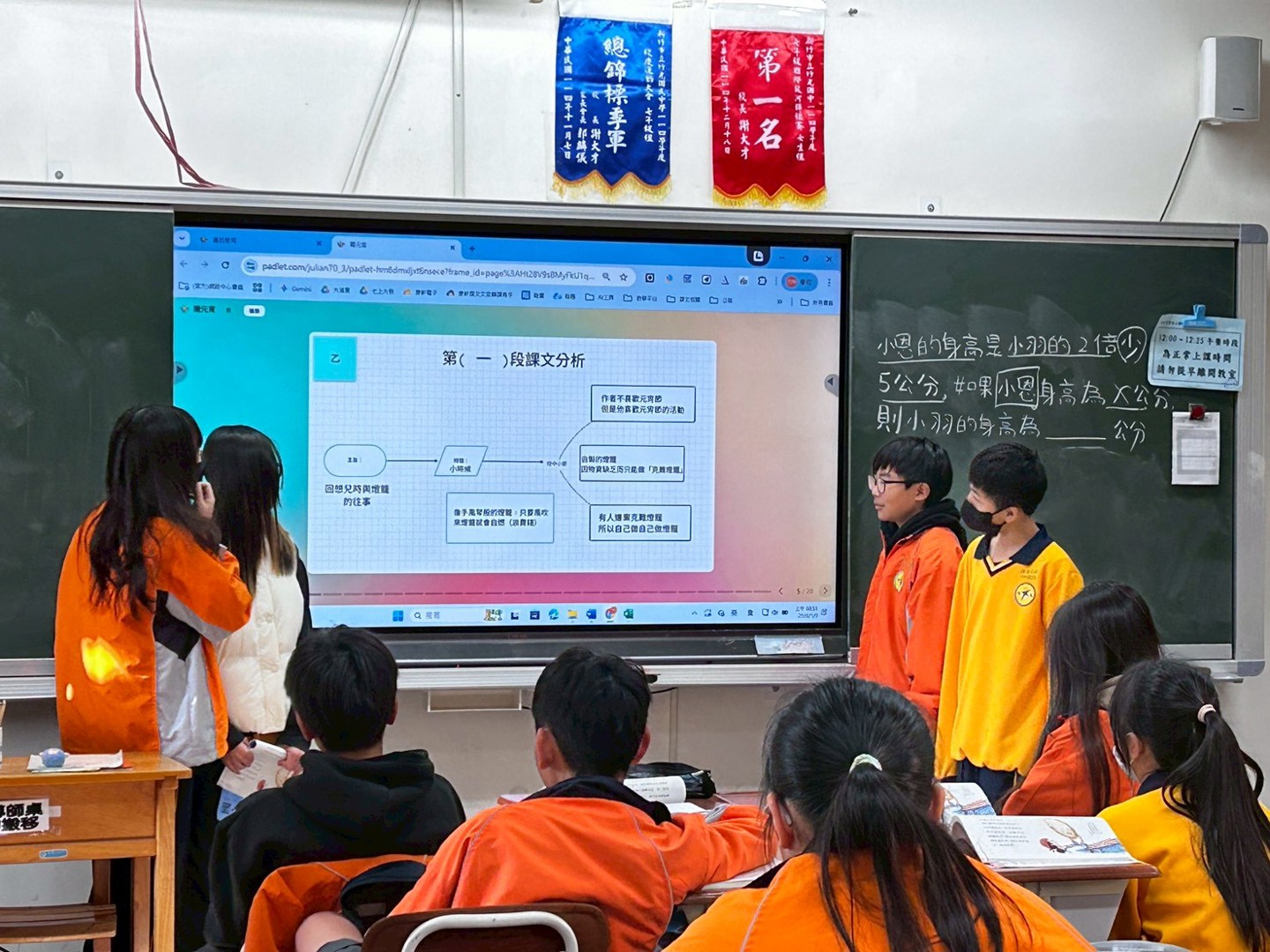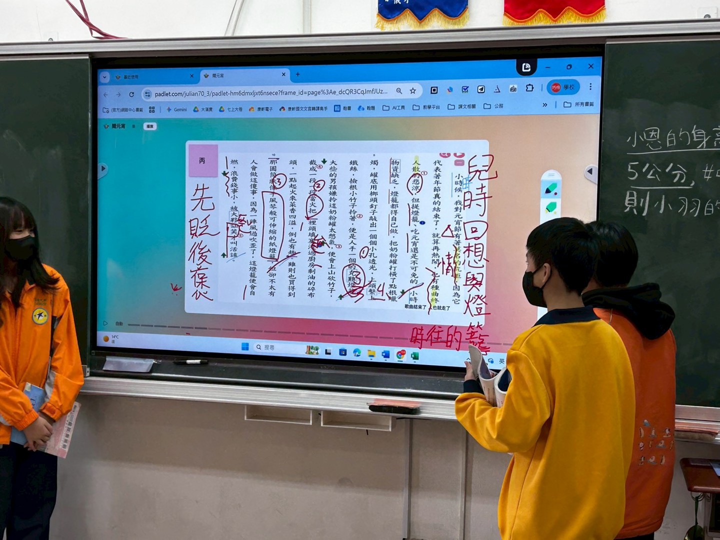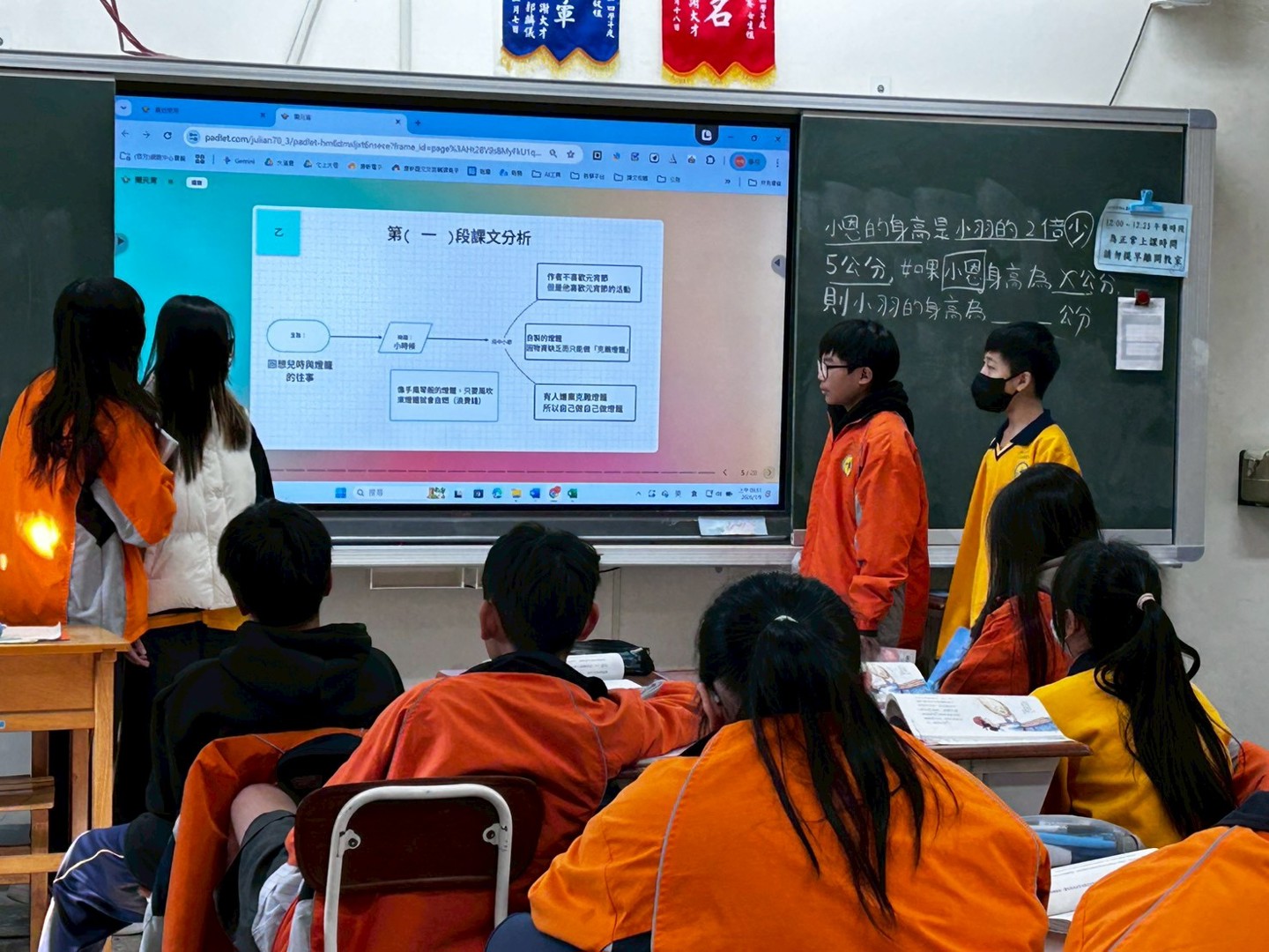 課堂開始,各組依據先前在 Padlet 模板中整理的內容,重新分工準備上台報告。報告內容涵蓋課文重點摘要、寫作手法分析,以及元宵節相關的節慶文化補充。學生嘗試運用關鍵詞、例句與圖像輔助說明,讓聽眾更容易理解文本重點,也訓練如何將閱讀理解轉化為口頭說明。