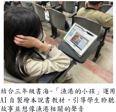結合三年級書海文本《漁港的小孩》,教師運用 AI 自製繪本說書教材,引導學生在故事中想像漁港的聲音風景,並透過因材網課程包進行聆聽與自學,讓學習不受時間與空間限制。