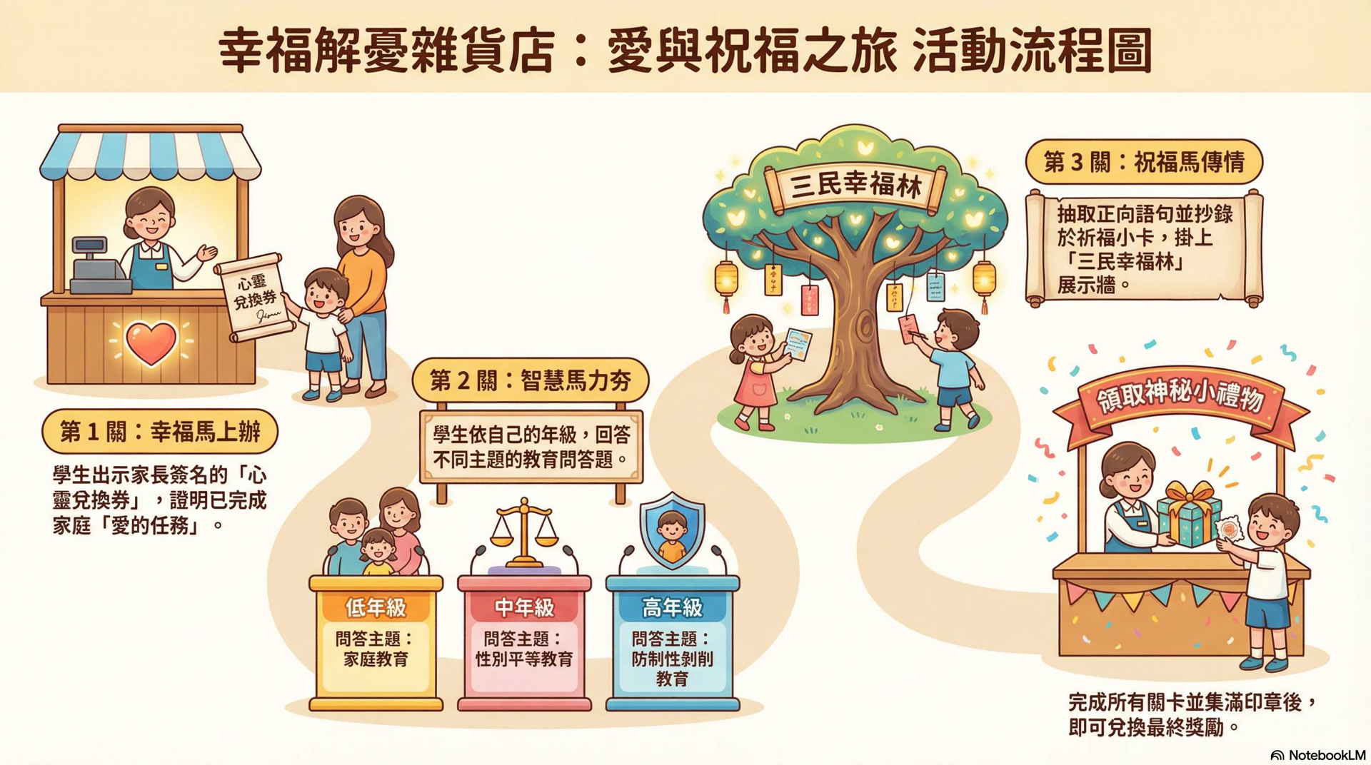 活動在兌換「神祕小禮物」的高潮中劃下完美句點,每位學生都帶著滿滿的收穫與燦爛的笑容離開 。這次活動是三民國小推動正向管教與家庭教育的重要一環,透過「幸福存摺」制度,讓孩子學會惜物、惜情,並把愛帶回家。