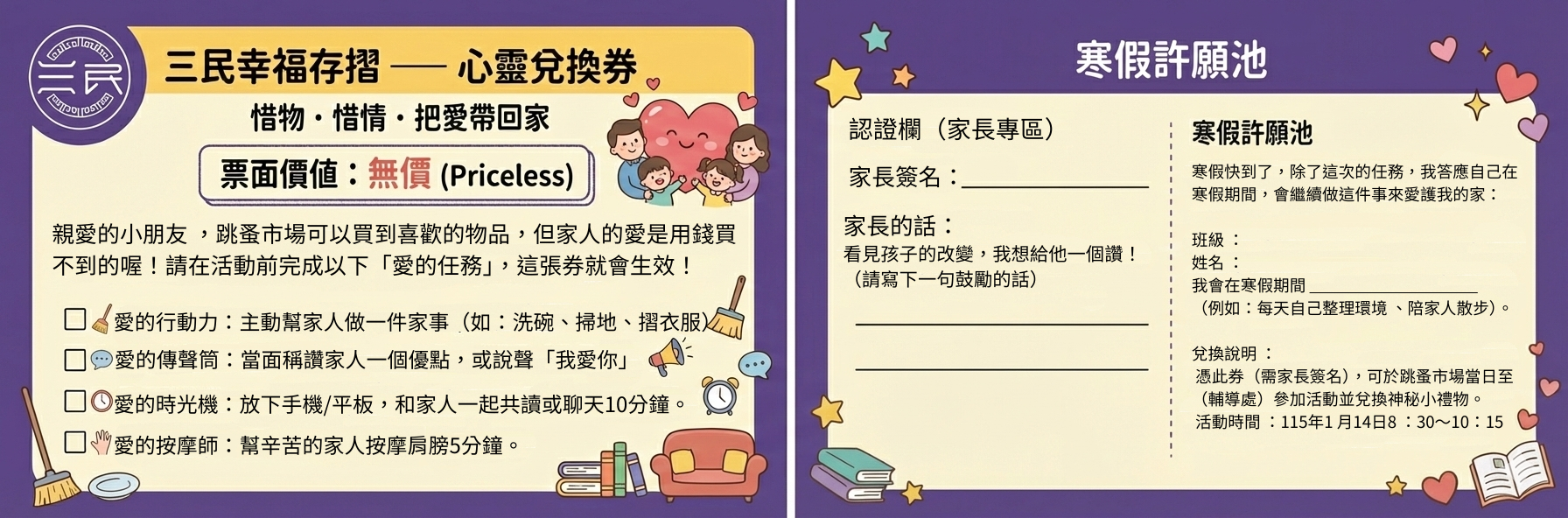 值得注意的是,這份幸福並未隨著活動結束而終止。兌換券背面的「寒假許願池」已預告了下一階段的任務,鼓勵學生在寒假期間繼續守護家庭,讓這份溫暖的循環在每個家庭中持續發酵。這場成功的「幸福的解憂之旅」,期待暖暖的冬日讓三民的校園充滿正向的氣氛與連結。