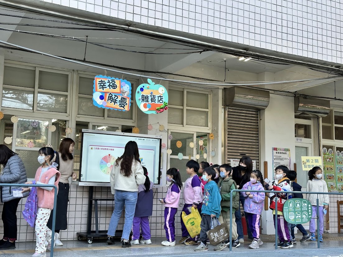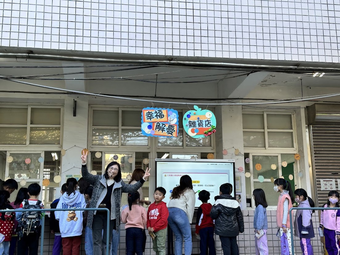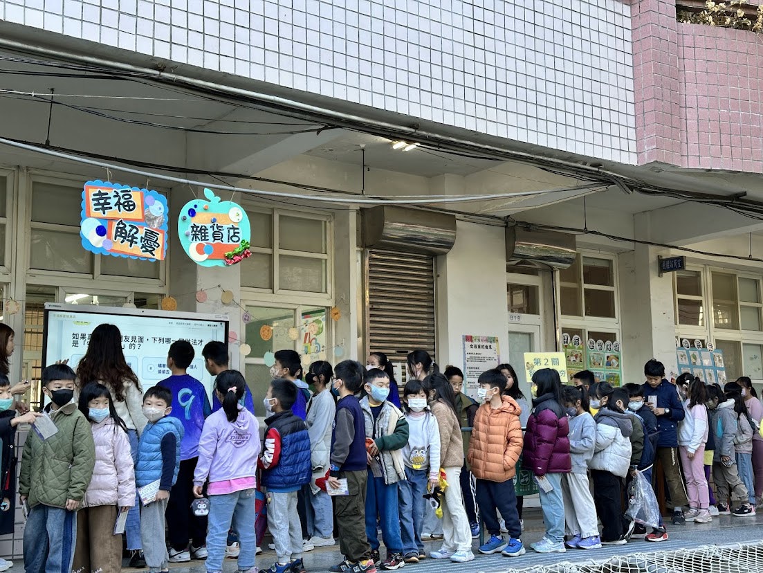 1 月 14 日一早,三民國小校園內洋溢著溫暖且熱絡的氣息。由輔導處精心策劃的「幸福解憂雜貨店:愛與祝福之旅」活動正式開張 。趁著冬日難得的晴朗好天氣,結合跳蚤市場的活動,大批學生手持完成任務的「三民幸福存摺—心靈兌換券」,迫不急待地湧入輔導處前方空間,讓原本平靜的走廊與川堂瞬間化身為充滿歡笑與知性的教育樂園。
