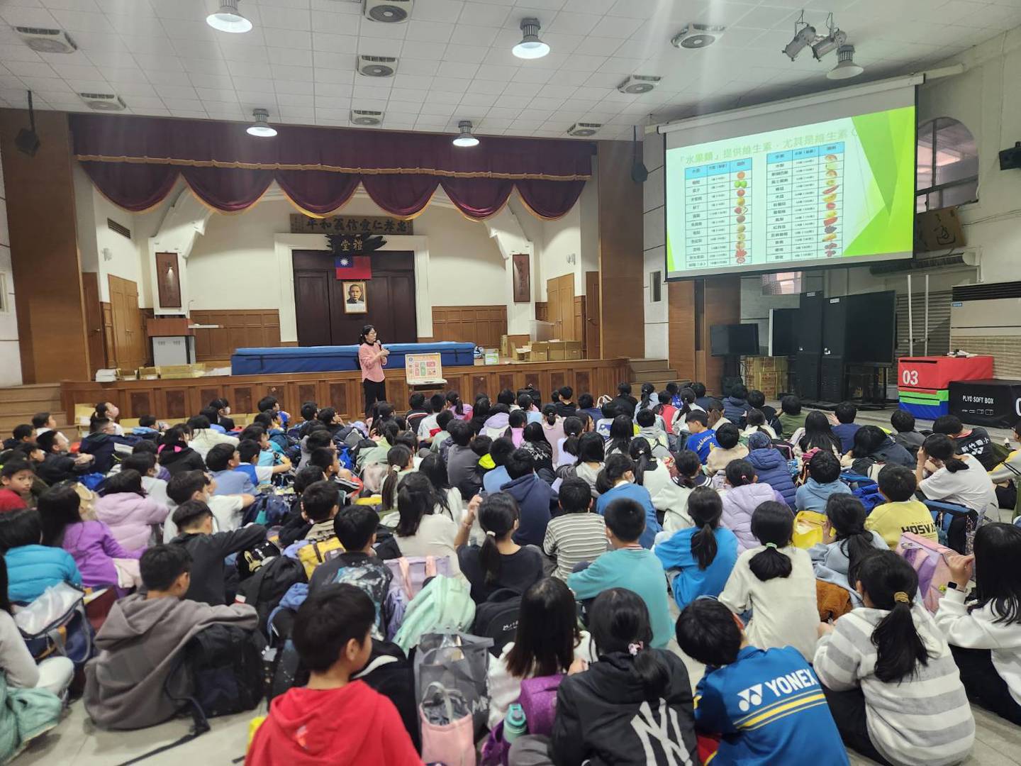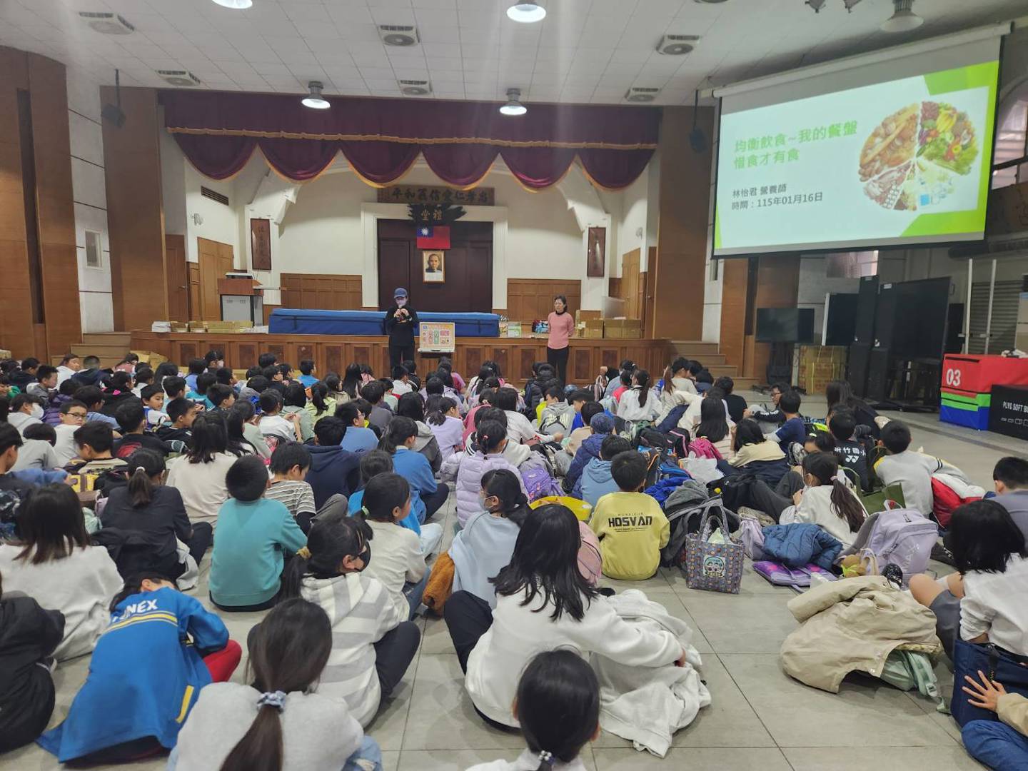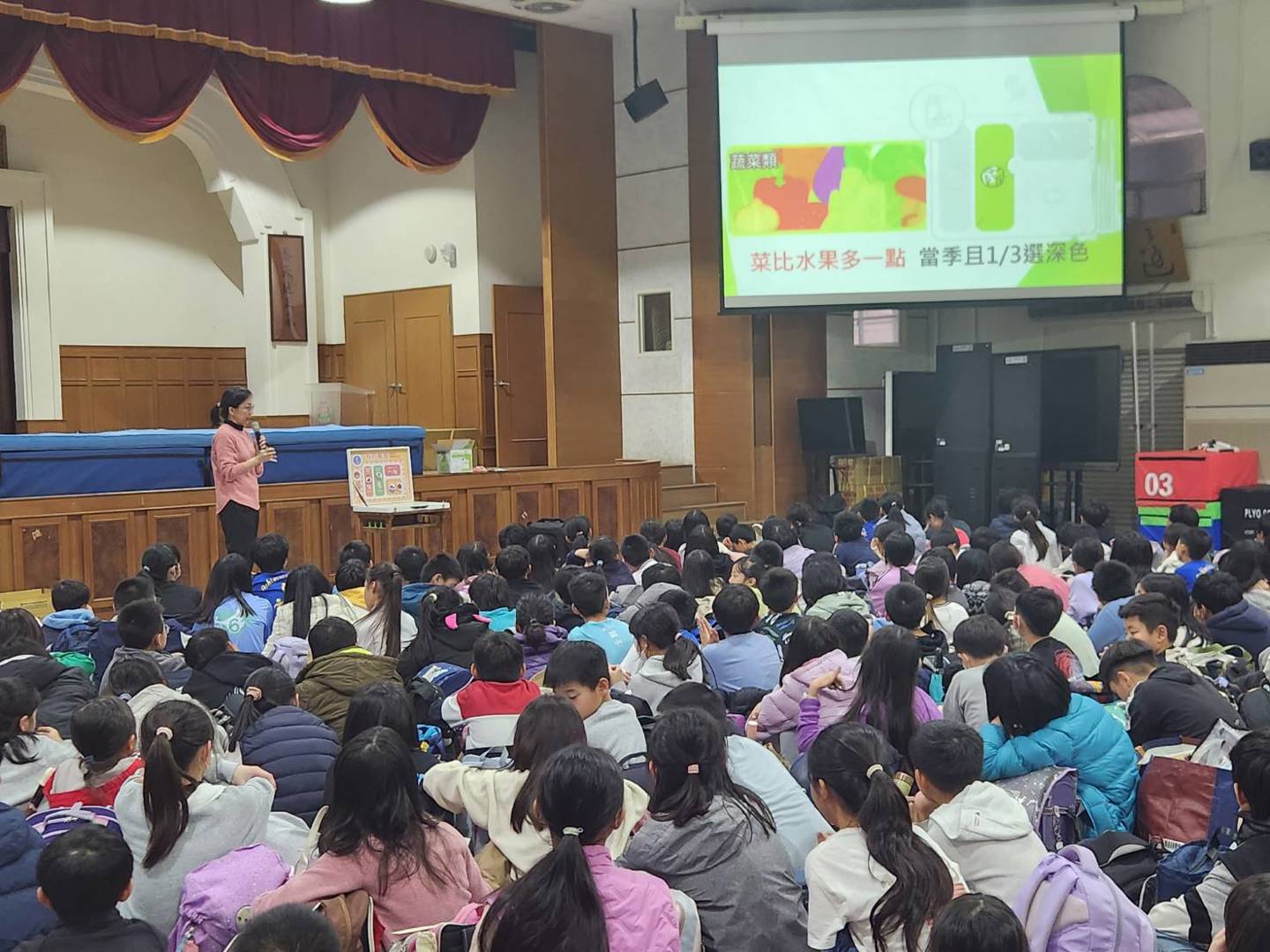今天下午,林怡君營養師為五年級學生進行營養教育宣導。宣導內容涵蓋「健康餐盤」的均衡概念、學校營養午餐的設計理念,以及日常生活中的健康食物選擇方式,幫助學生建立正確的飲食觀念。