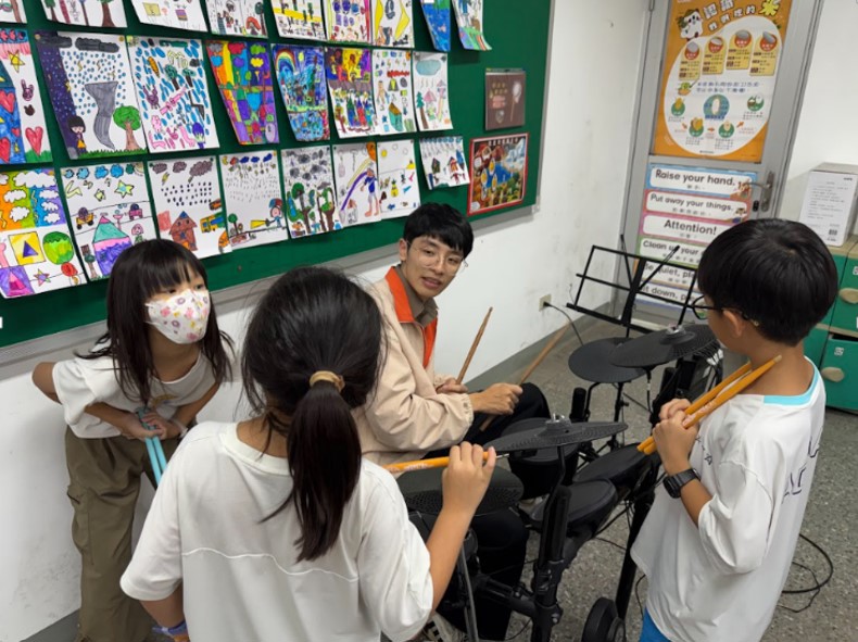 課程初期,老師帶領學生從認識鼓組開始,並透過趣味的節奏遊戲,將枯燥的基本練習轉化為互動比賽。孩子們在「敲一敲、玩一玩」的過程中,自然而然地掌握了拍點的準確度。