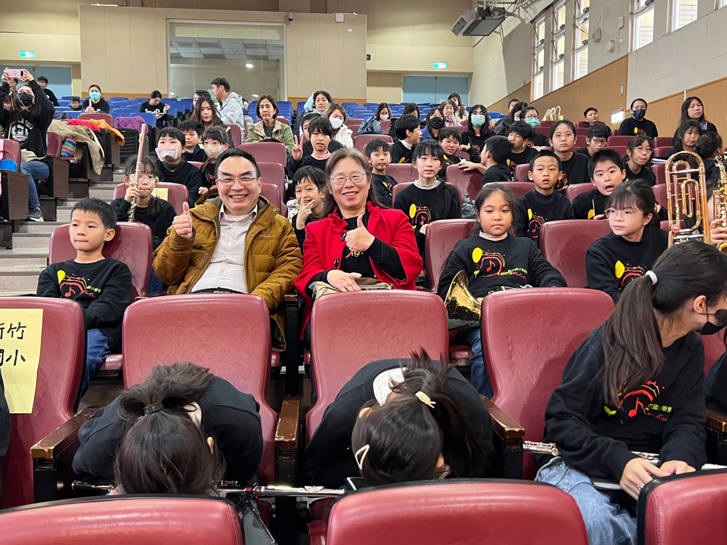暨1月20日邀請許瀞心教授現場指導後,第二天管樂團立即出發至新北市新板特區與當地海山國小管樂團進行交流活動。這場音樂盛會不僅增進了兩校師生的技藝,更培養團員見賢思齊的包容與欣賞。 促成這場難能可貴的交流,首先要感謝曉慧老師長達半年多來的不斷溝通與協調,不僅讓竹小學生拓展了視野,也增進了兩校師生的友誼。如茵校長表示:「音樂無國界,透過這場盛會我們看到了學生全方為的學習與配合,相信未來能創造更多機會讓兩校師生互動交流。」海山國小校長謝治平也認為,此次演出不僅展現了學生的音樂造詣,更重要的是培養他們欣賞不同團隊的視野。