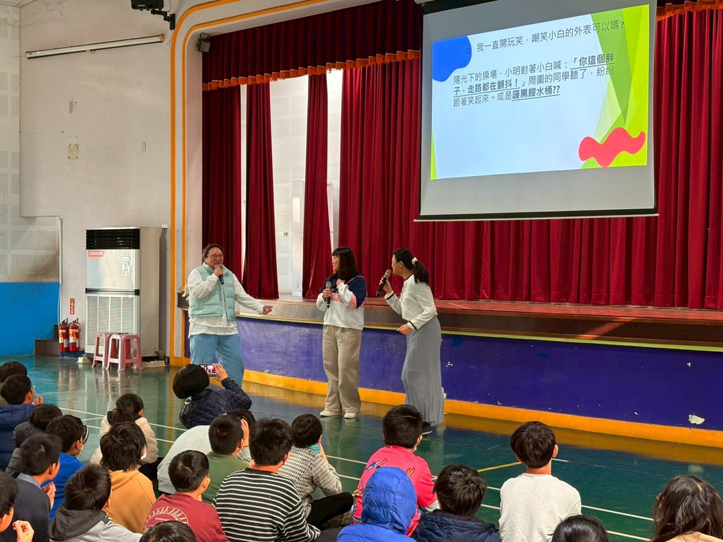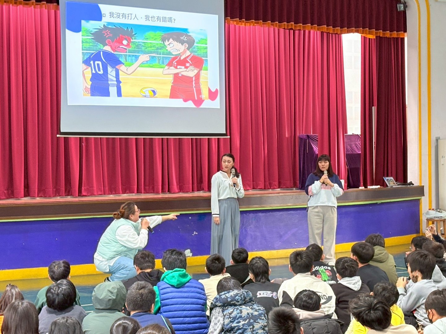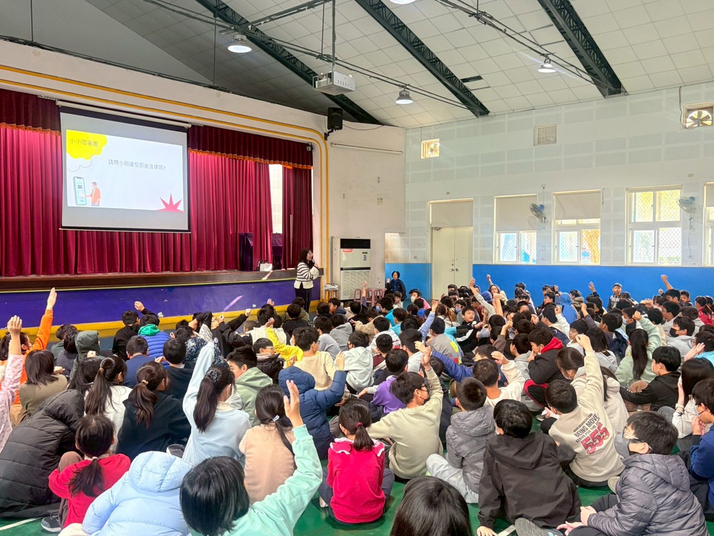 在放假前,學務處安排了一場防制霸凌、性騷擾的法治教育宣導,特別感謝南寮國小好鄰居-彭氏祖祠第17屆董事長彭培桐先生牽線,讓我們結識林妤芬律師及新竹市社區關懷法律服務協會,也非常幸運地在放假前順利約成本次宣導活動。由林律師帶領著協會夥伴一起到南寮國小,為高年級的孩子進行有關言論、網路、同儕互動的法律觀念案例分享。特別的是,律師的案例是由協會夥伴現場演繹的小劇場來呈現哦!非常貼近學生真實互動的劇情,在演繹時都可以聽到大南寮們感同身受的回應呢!