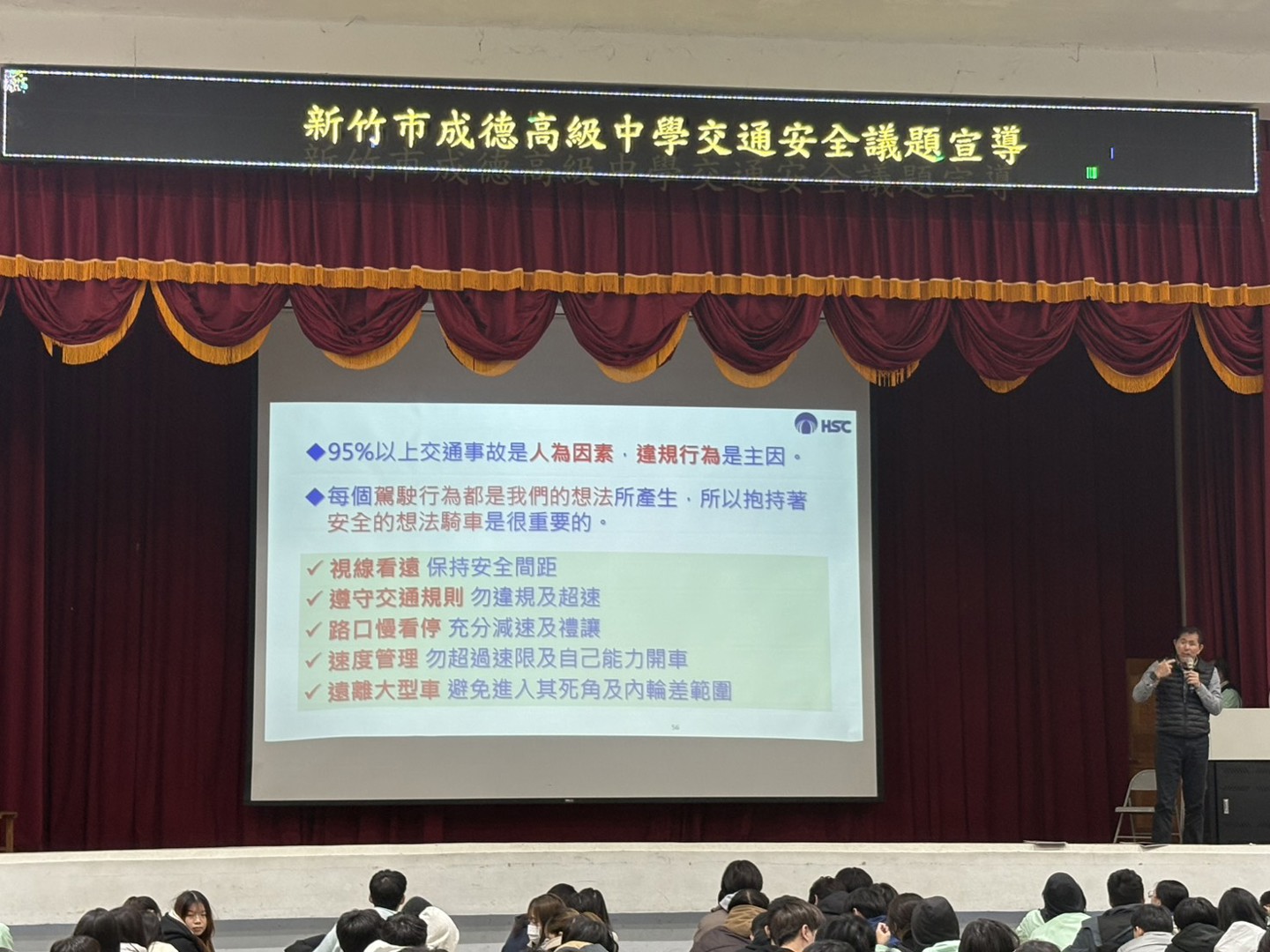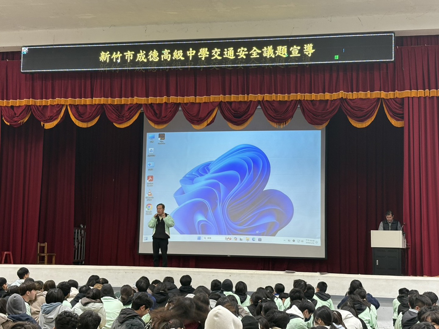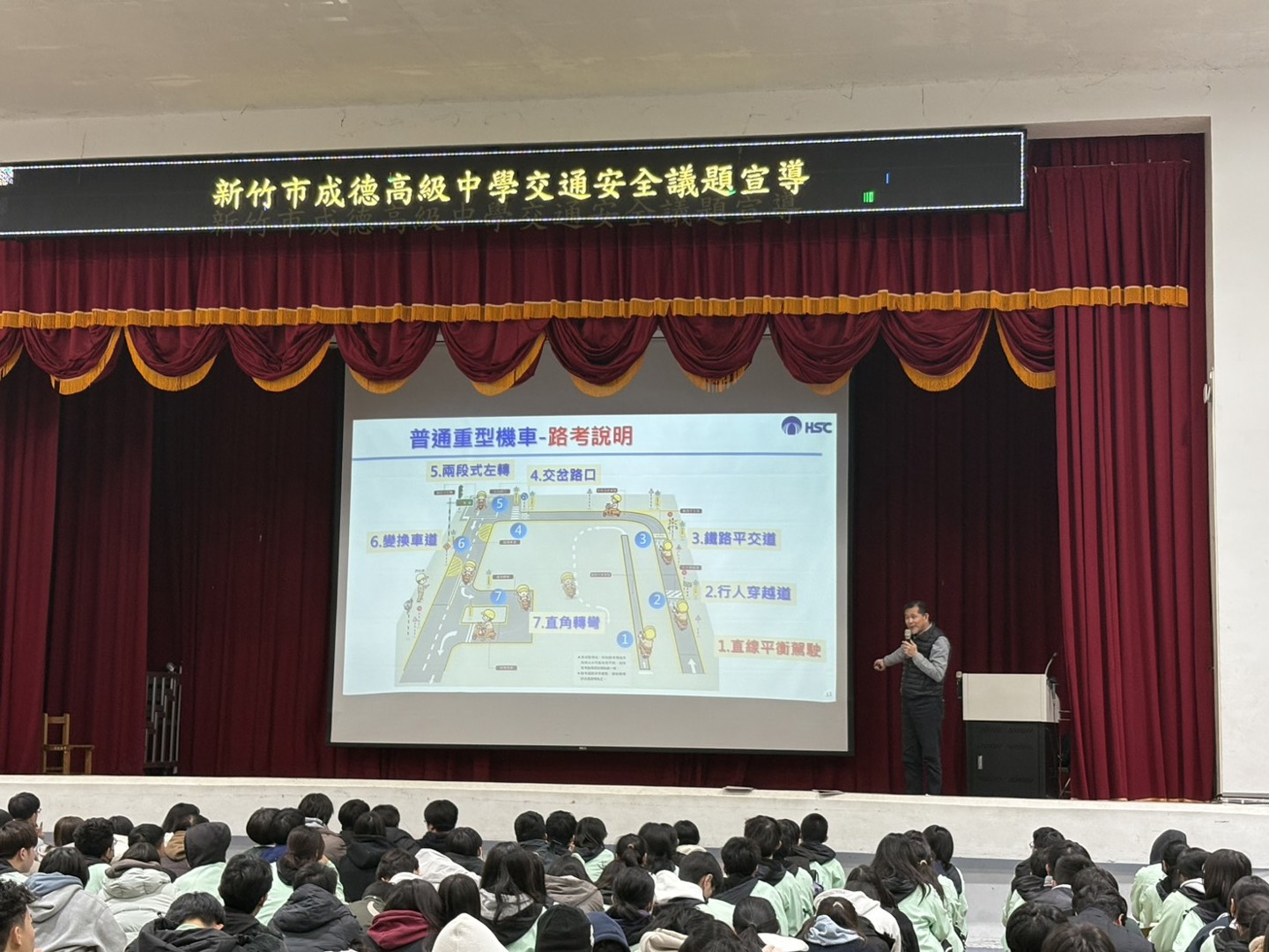 新竹市成德高中於1月21日舉辦「交通安全宣導」,邀請新竹安全駕駛教育中心的邱主任到校進行交通安全講習。並配合市政府加入非號誌化路口磁板及酒駕模擬眼鏡等創新教學方式,提升學生對交通法規與用路安全的認知。