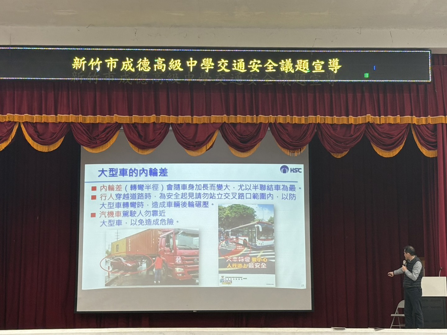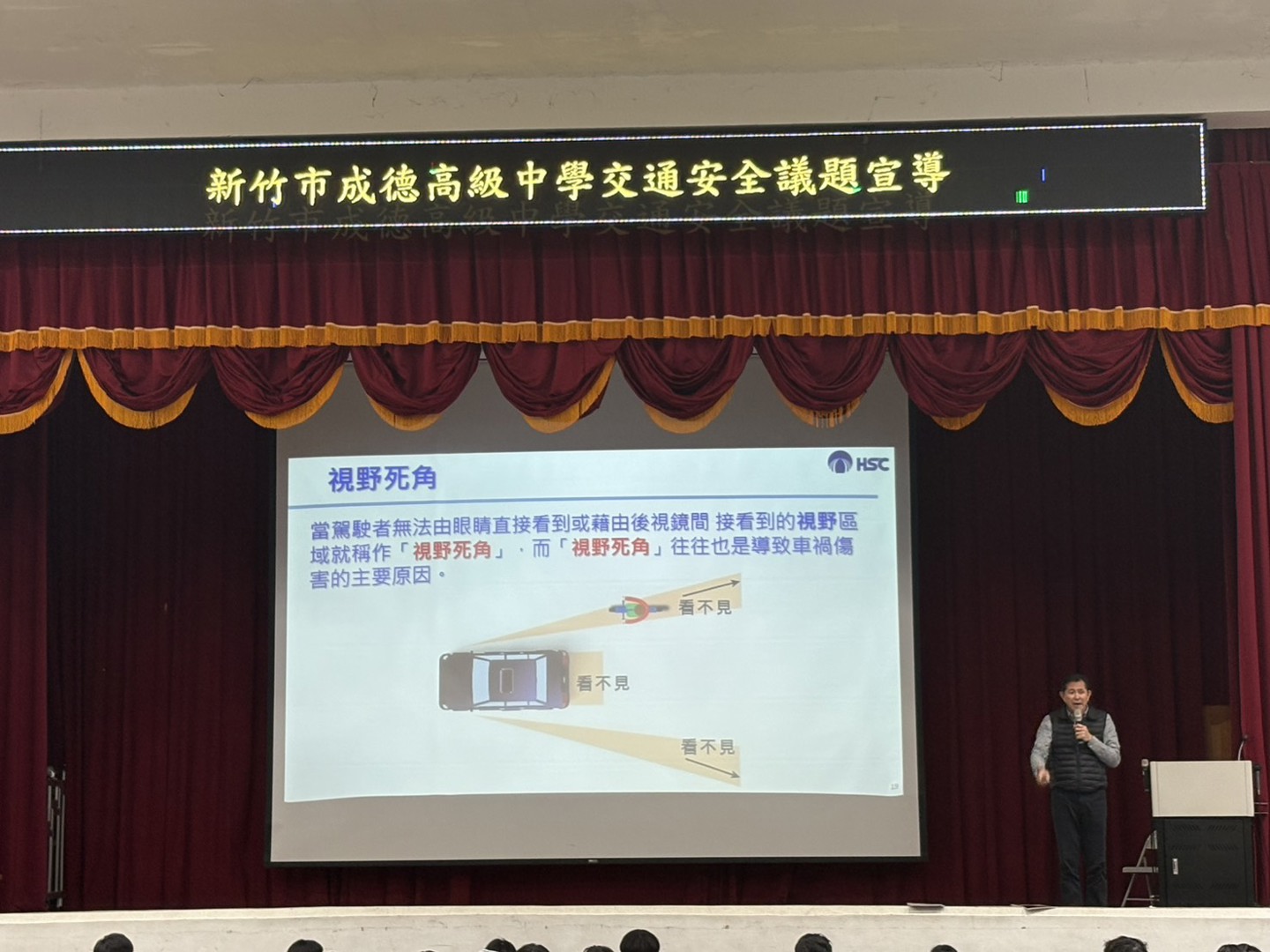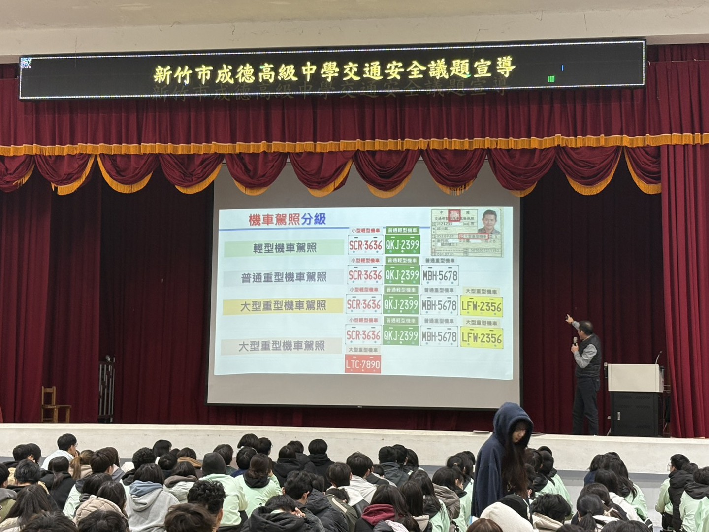 新竹市成德高中於1月21日舉辦「交通安全宣導」,邀請新竹安全駕駛教育中心的邱主任到校進行交通安全講習。並配合市政府加入非號誌化路口磁板及酒駕模擬眼鏡等創新教學方式,提升學生對交通法規與用路安全的認知。