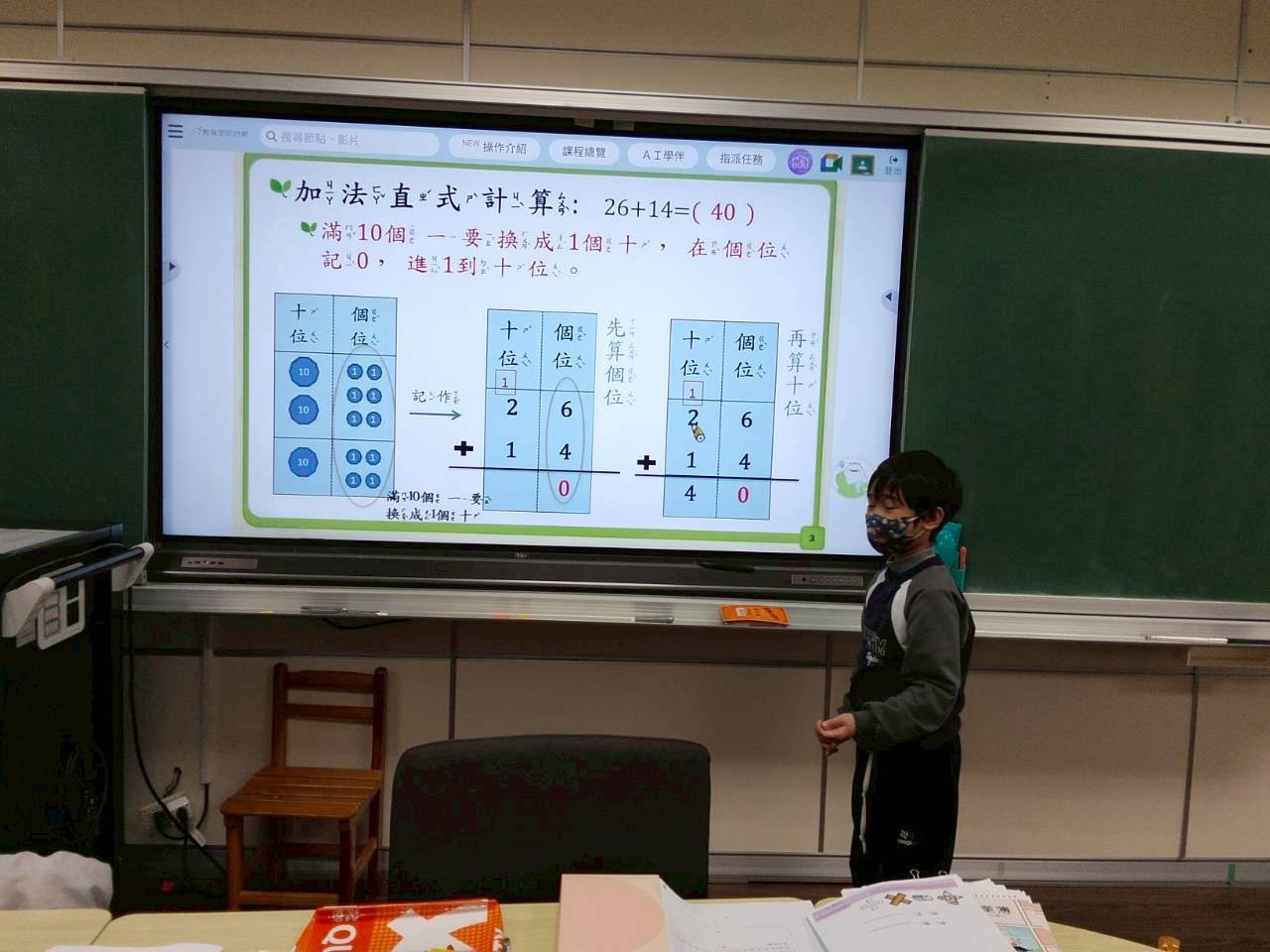 在課程中,學生們運用平板電腦進行線上測驗與互動練習,不僅即時獲得回饋,也清楚掌握自身的學習盲點。同時,老師安排小白板進行計算練習,使學生能即時展現解題思路並獲得指導,增加專注度與參與感。此外,課程還融入數學小遊戲,將枯燥的演算轉化為有趣的挑戰,培養學生的解題能力與團隊精神。