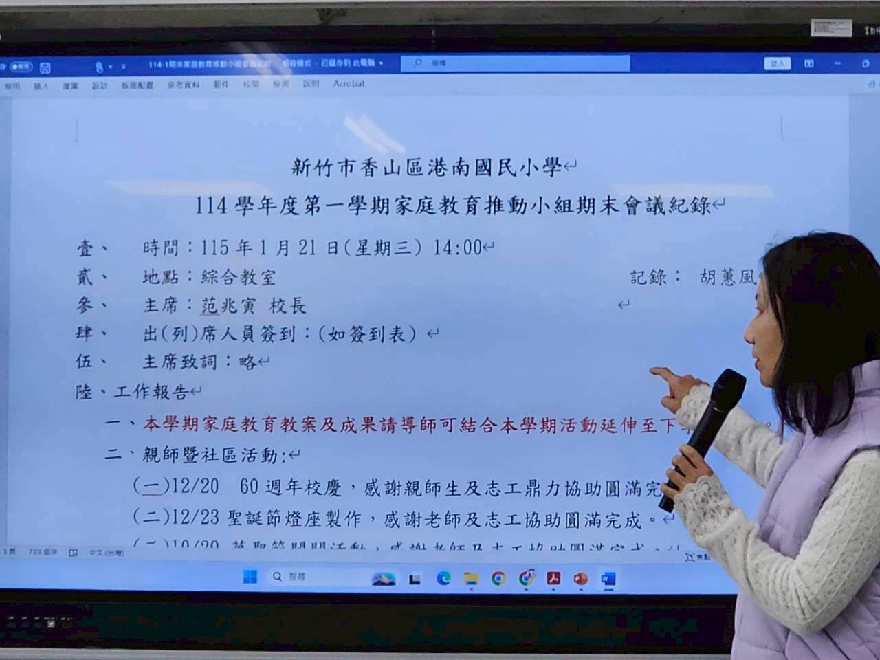 115.01.21 會議由學務處靜怡主任進行報告,說明家庭教育於校園之推動計畫、執行情形與推動進度,並就相關業務進行整體說明。靜怡主任報告內容包括: