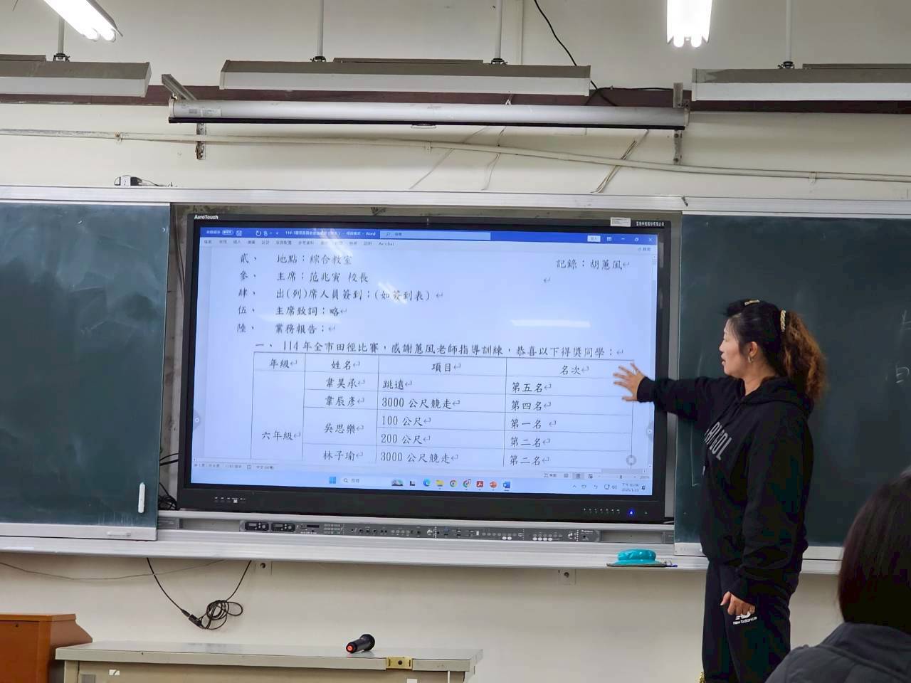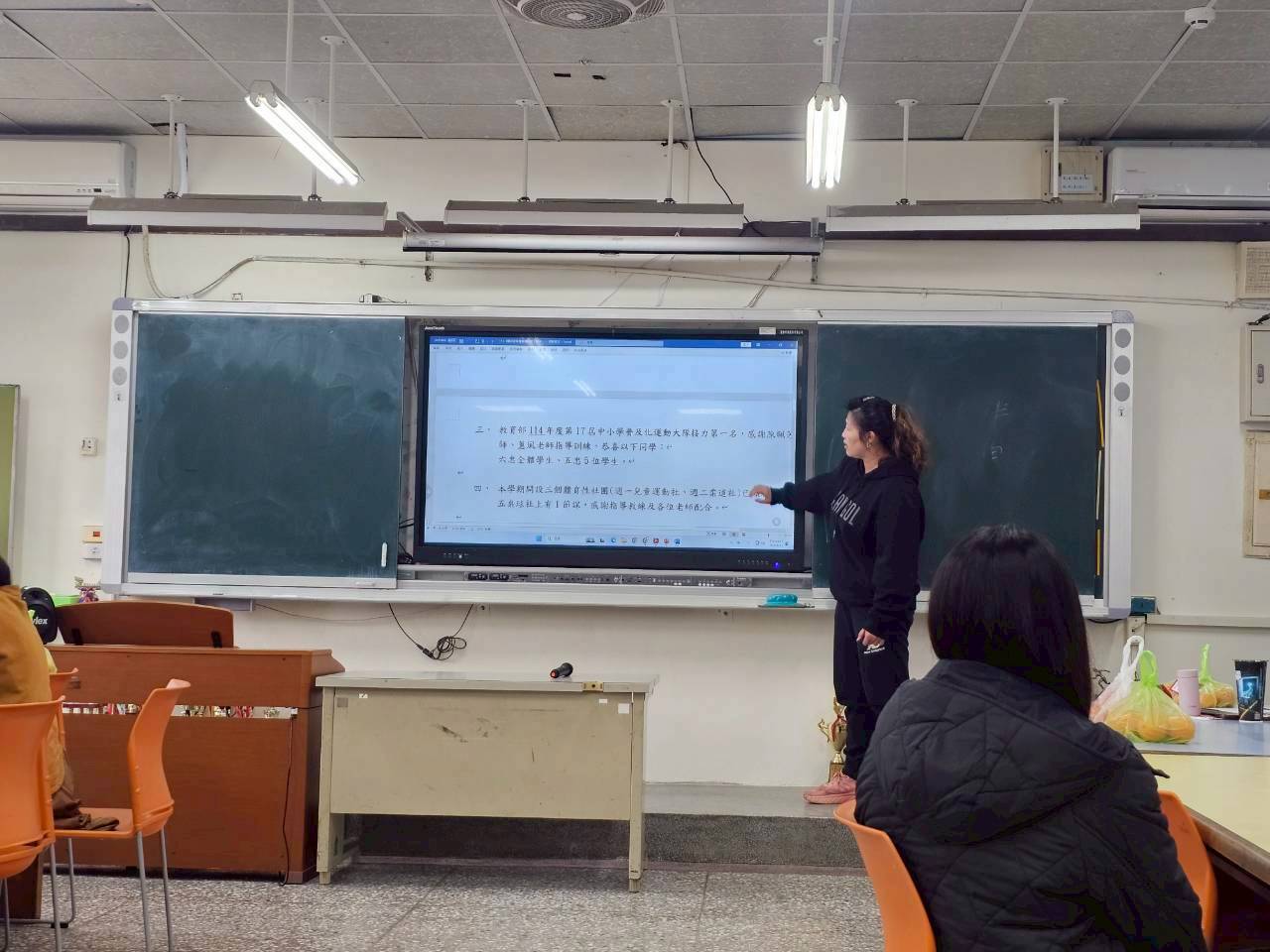 114學年度第一學期體育委員會期末會議中,由學務處蕙風老師就校內各項體育活動之推動情形、執行成果與未來規劃進行說明,讓與會人員更全面了解校園體育發展方向。