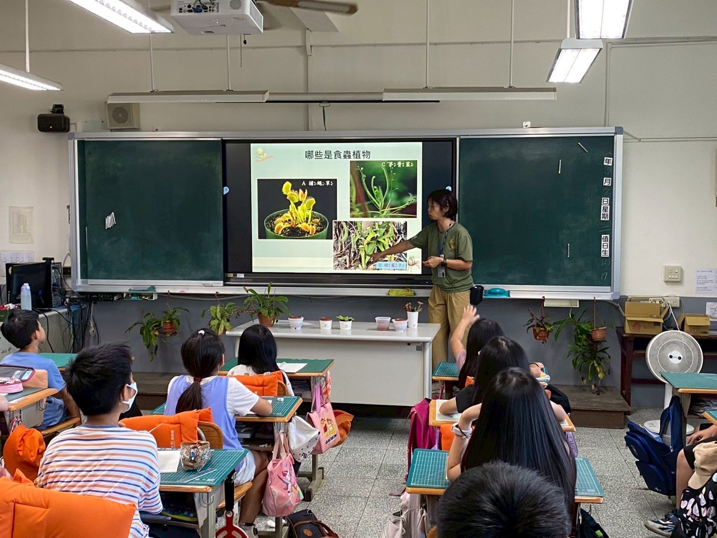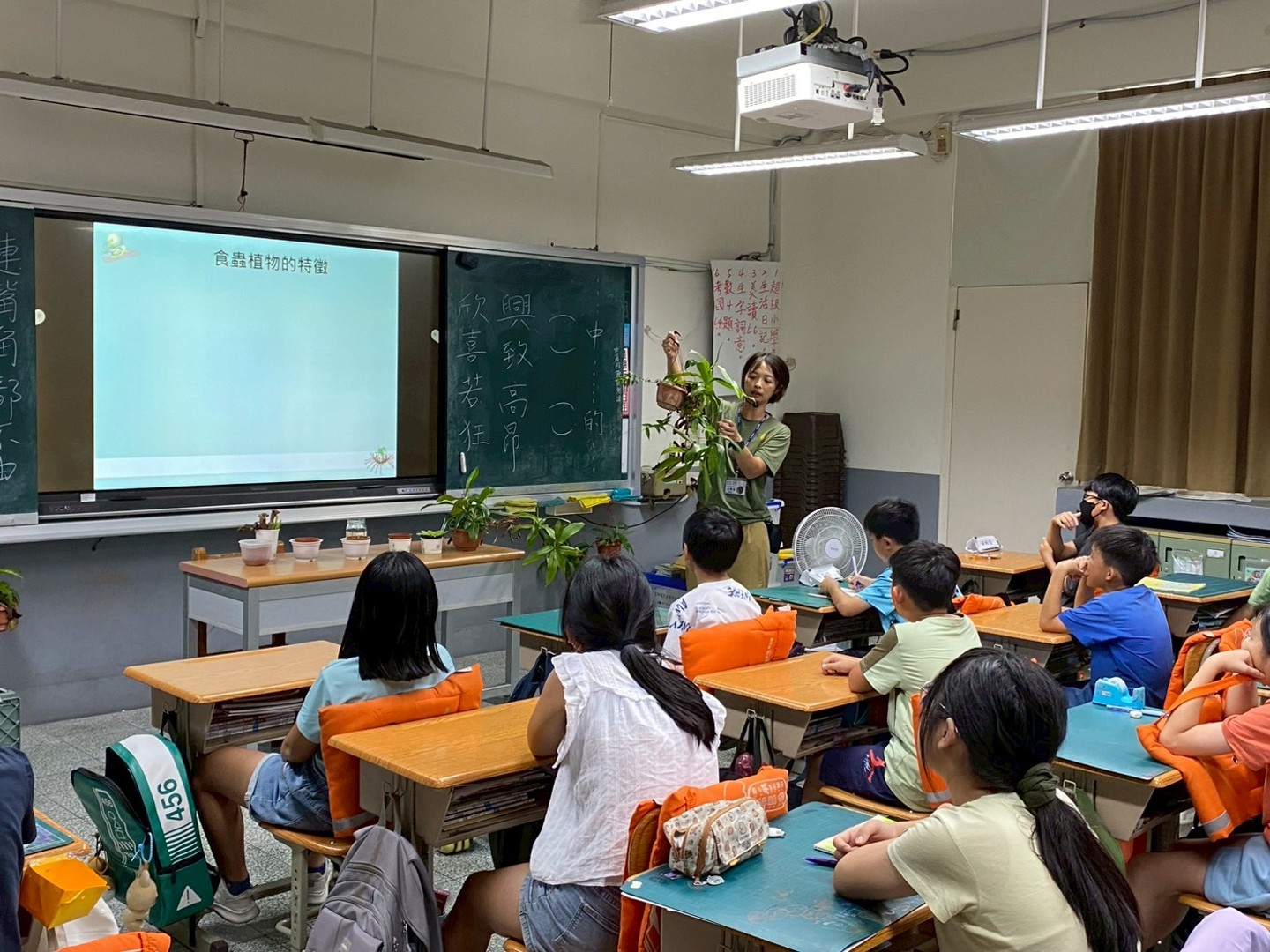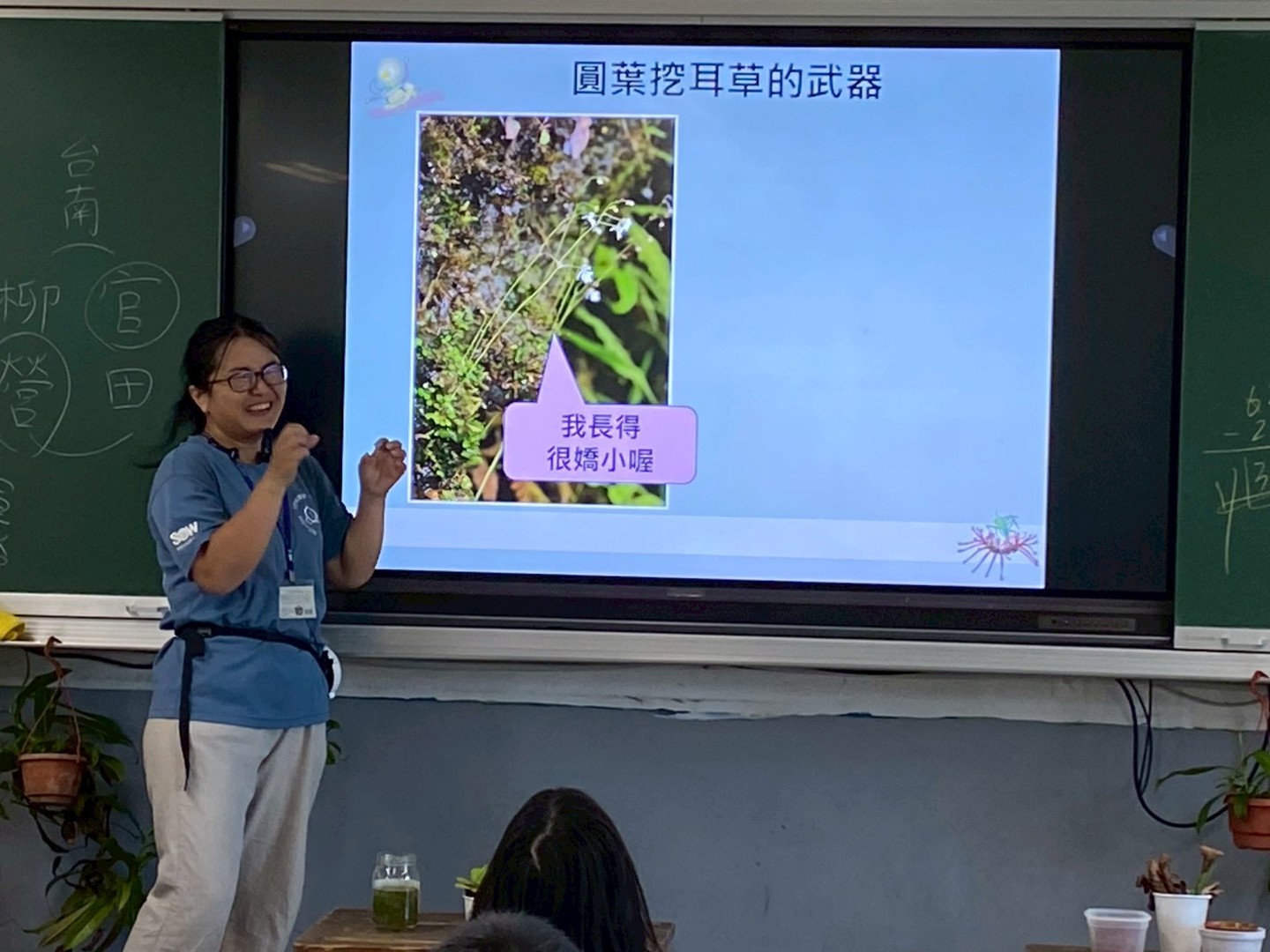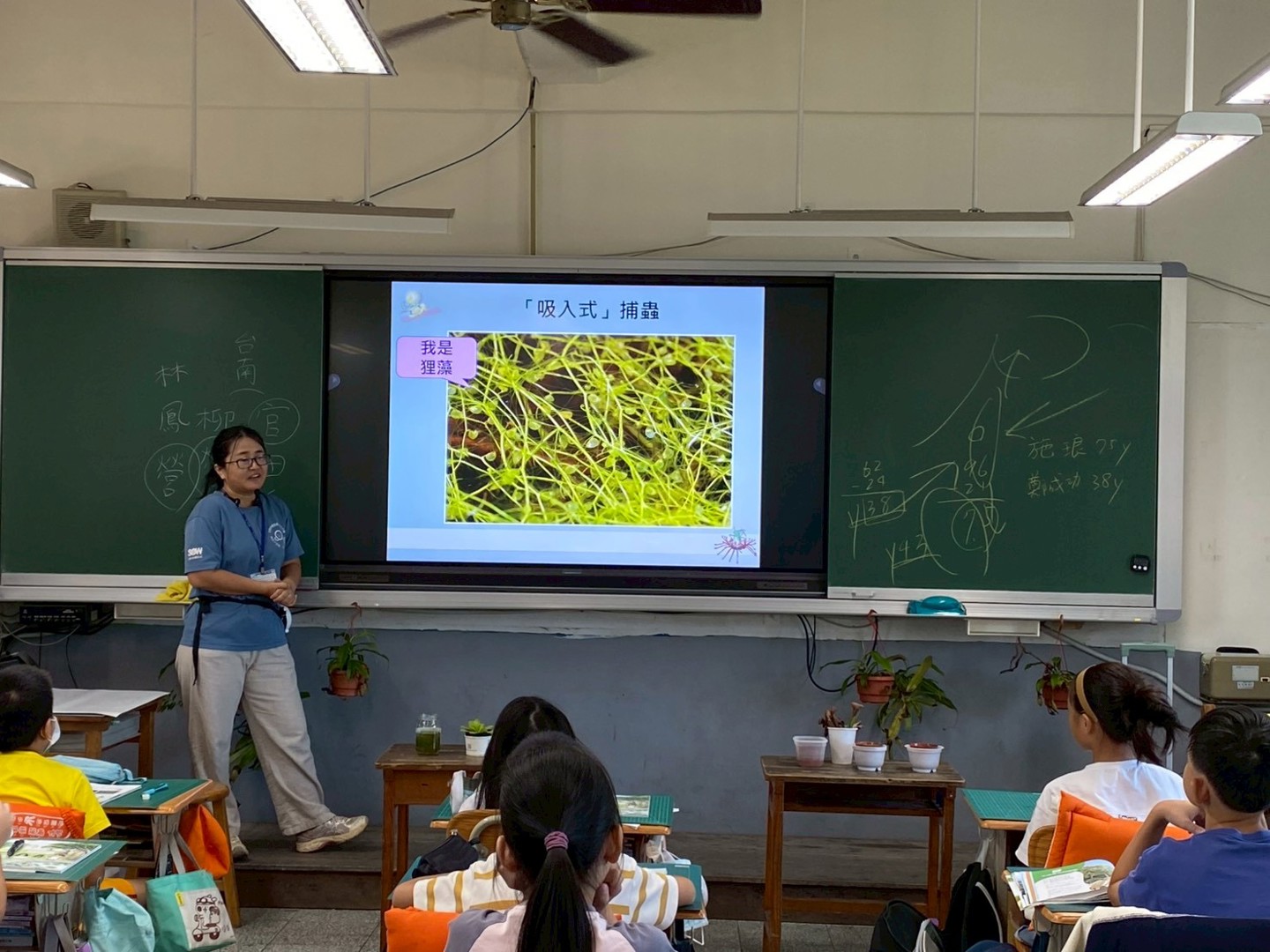 課程一開始,五年級同學透過投影片認識常見的食蟲植物種類,如捕蠅草、狸藻與豬籠草,並觀看捕蠅草迅速閉合捕捉昆蟲的影片,驚呼聲此起彼落。講師進一步解說其生長於貧瘠環境,需透過捕捉昆蟲補充養分,讓學生理解其生態意義。