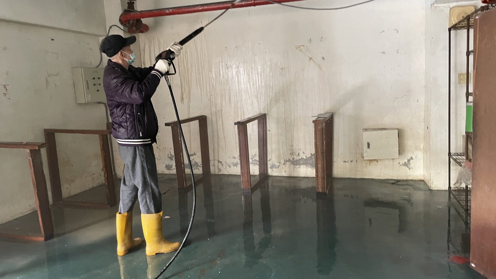 在警衛鍾先生高壓水柱的助攻下,從天花板到地面,每一處角落都被仔細沖洗,原本覆蓋在地板上的厚重泥土,被一點一滴刷去,回收室逐漸露出久違的清爽面貌,真可說是煥然一新。水花飛濺中,不只是灰塵被帶走,也洗去了長久以來的苟且。