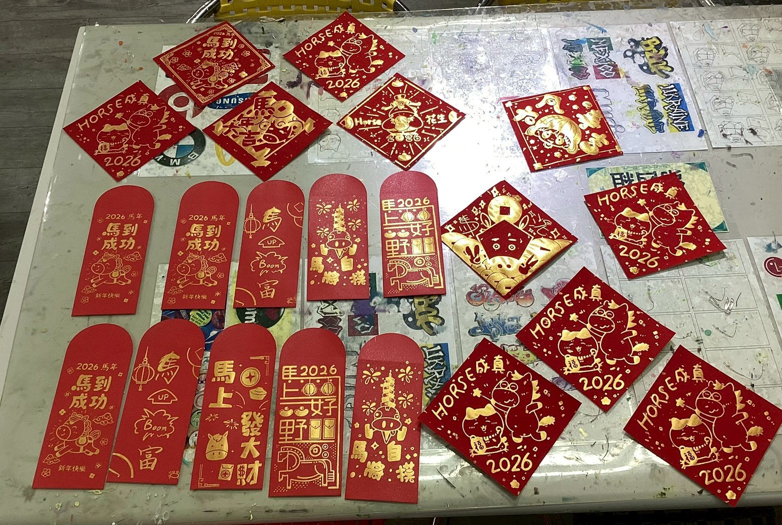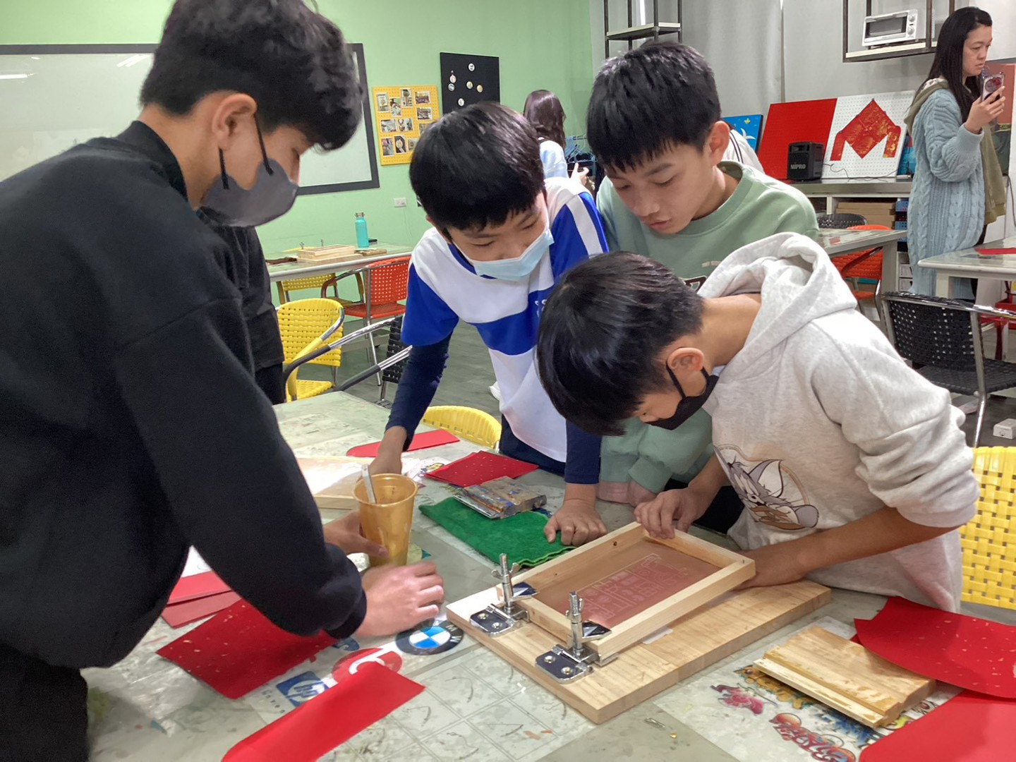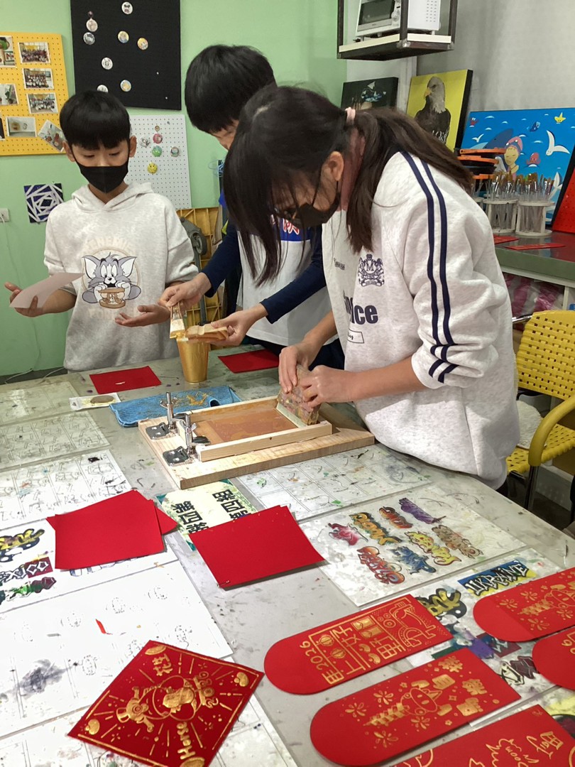 最令學生驚艷的是,印製用的「馬到成功」、「Horse花生」等可愛圖案,全出自香山高中美工科大哥哥、大姊姊的設計巧思。參與學生興奮地操作絹版,親手印製專屬的馬年紅包與春聯,看著亮麗的作品完成,萬分欣喜。這場活動不僅讓孩子大展身手,更在心中種下美感教育的種子。