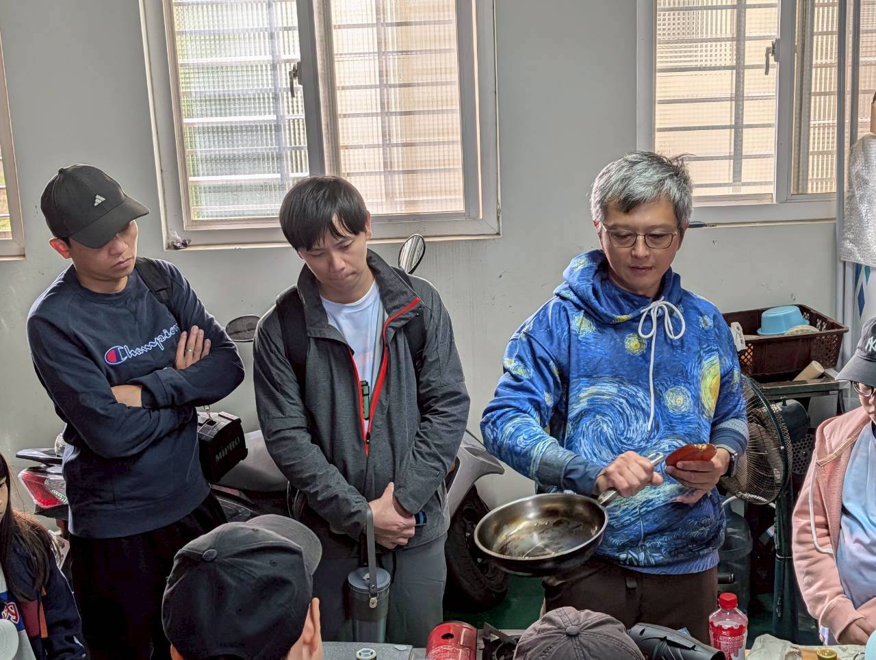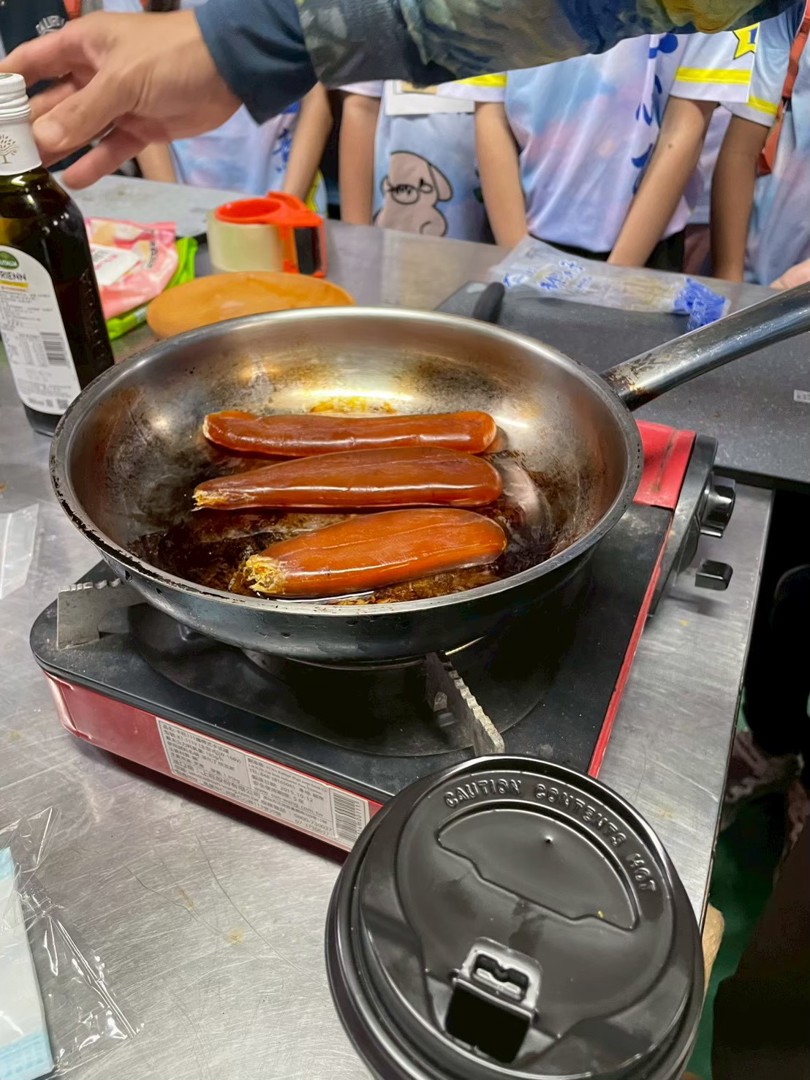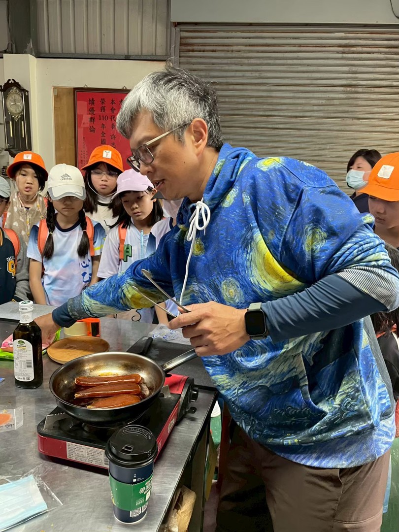 許老闆更進一步指導學生如何料理烏魚子,簡單的油煎或是泡過料理酒以後用噴槍炙燒,使小朋友們對這些經濟價值高的水產生物有了更深入的認識。