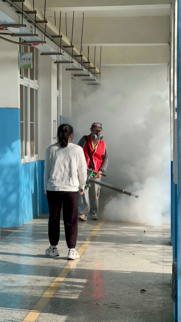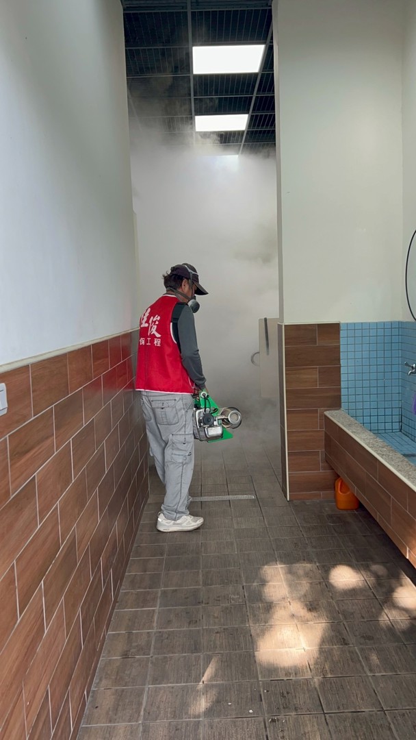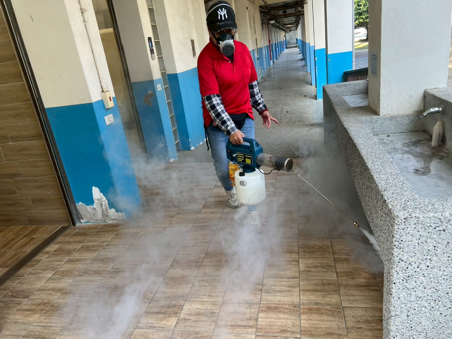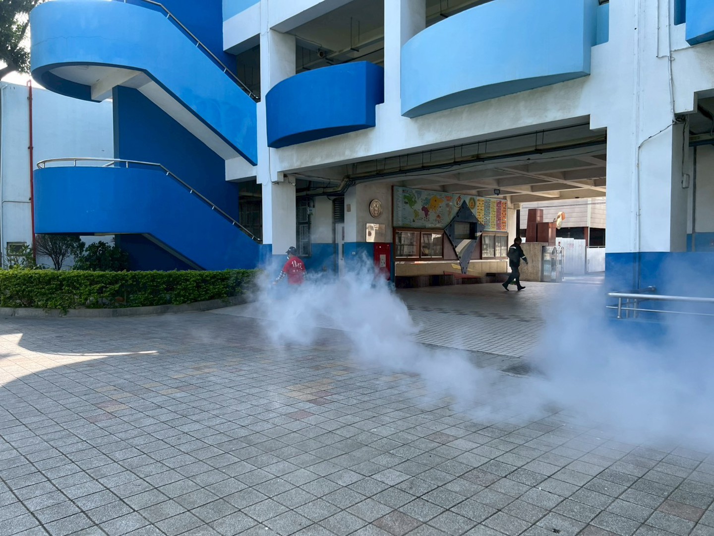 今天下午,校園裡出現了穿著防護口罩的「消毒專家」。團隊人員帶著專業設備,細心地對校園各處進行藥水的噴灑,這次的消毒的重點包括: