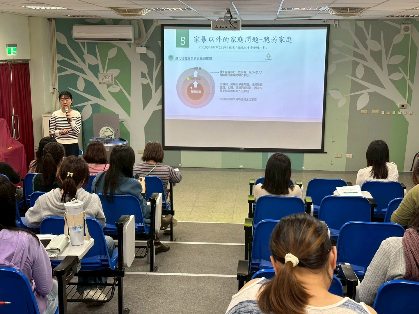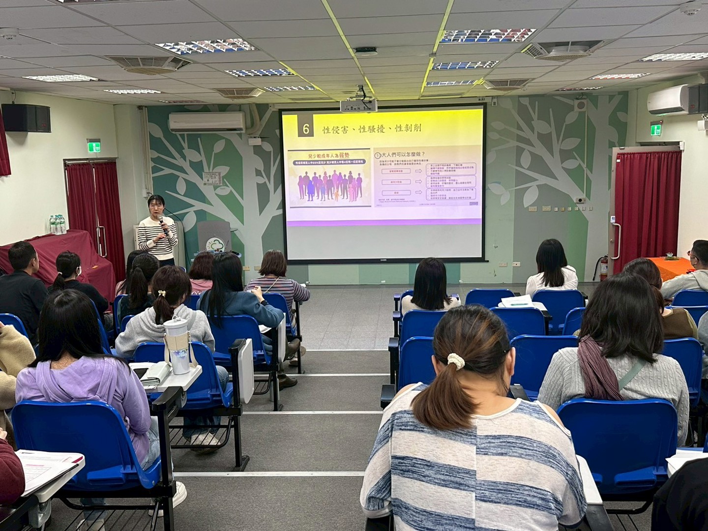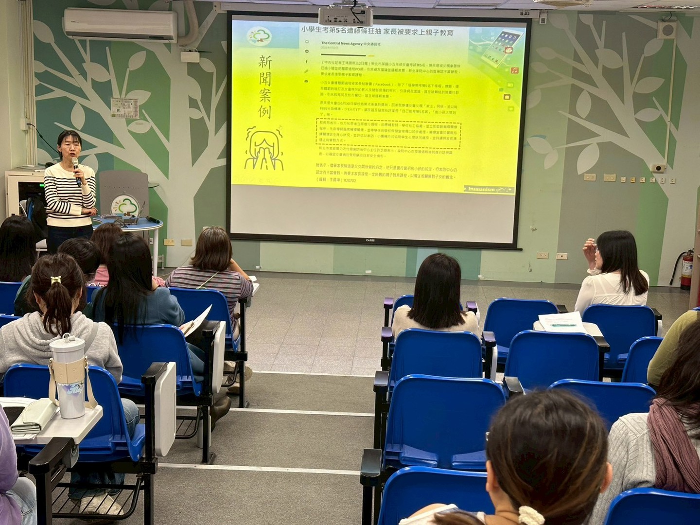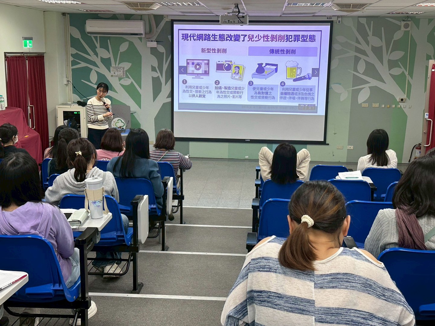 研習第一階段由校長主講,首先針對家庭暴力的定義與常見樣態進行說明,引導教師覺察學生可能隱而未顯的受害訊號,並提醒老師們,除家暴議題外,亦須關注「脆弱家庭」中潛藏的多元風險因素,及早發現、及時介入。校長進一步強調,若教師發現學生疑似遭受性侵害、性騷擾或網路性剝削事件,務必於24小時內完成責任通報並留存通報紀錄,行為人身分為校園中的教師、職員、職工或學生,皆須依法通報。課程中亦蒐集多起實際新聞案例與教師分享,加深老師們對通報責任與實務判斷的理解。