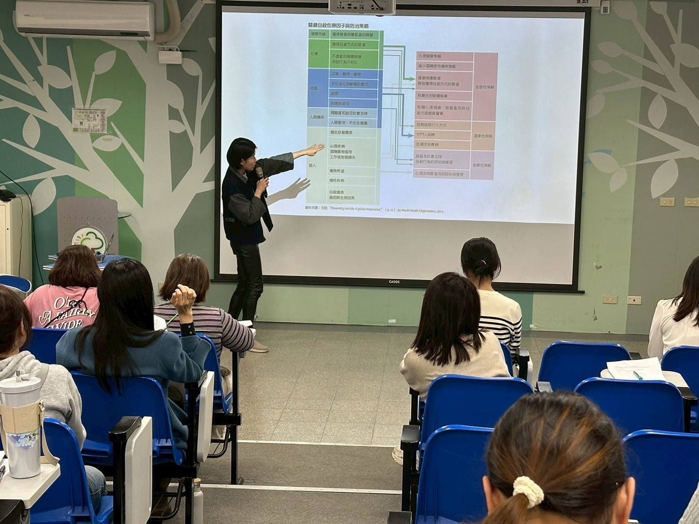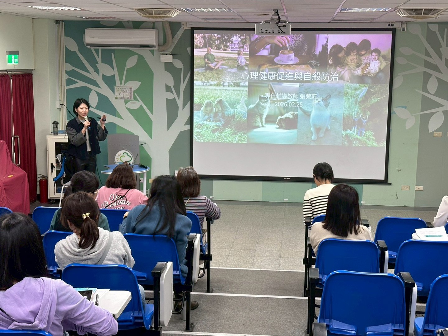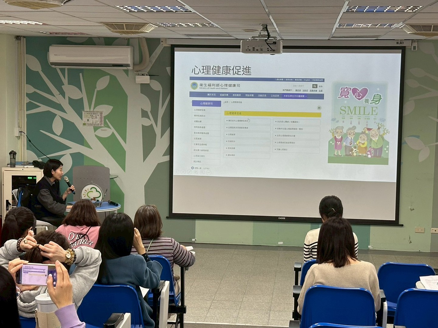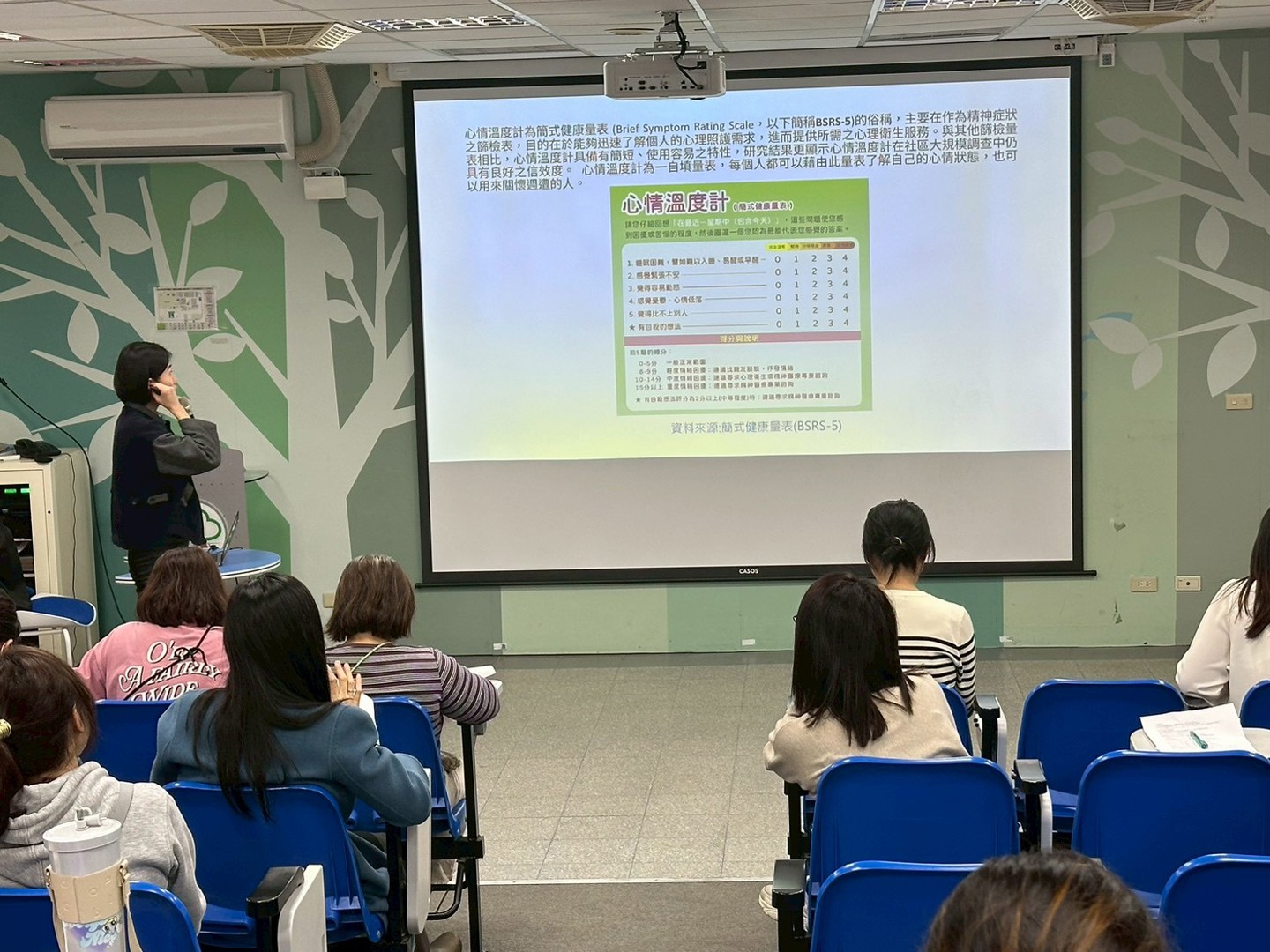 研習第二階段由專任輔導老師接續進行「學生自我傷害辨識與防治」宣導。課程一開始即介紹「衛生福利部心理健康司」官方網站所提供的心理健康資源,鼓勵教師善加運用並分享給家長,作為家庭與個人在需要時的重要支持管道。接著說明「心情溫度計健康量表」,協助教師了解自身心理健康狀態,也能作為關懷學生與周遭他人的重要工具。