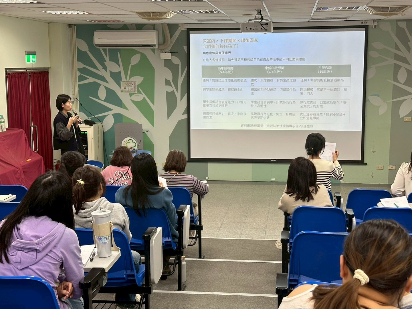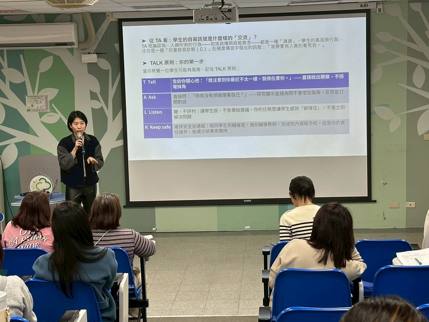 專輔老師進一步說明自我傷害與自殺的危險因子,並依不同年級學生與實際情境,整理出教師在面對學生出現自傷行為或意念時可採取的具體因應策略。最後介紹當察覺學生可能處於高風險狀態時,可在第一時間運用「TALK原則」與學生對話、傾聽與陪伴,先穩定學生情緒、接住孩子,再交由校內外專業團隊接續協助,形成完善的支持系統。