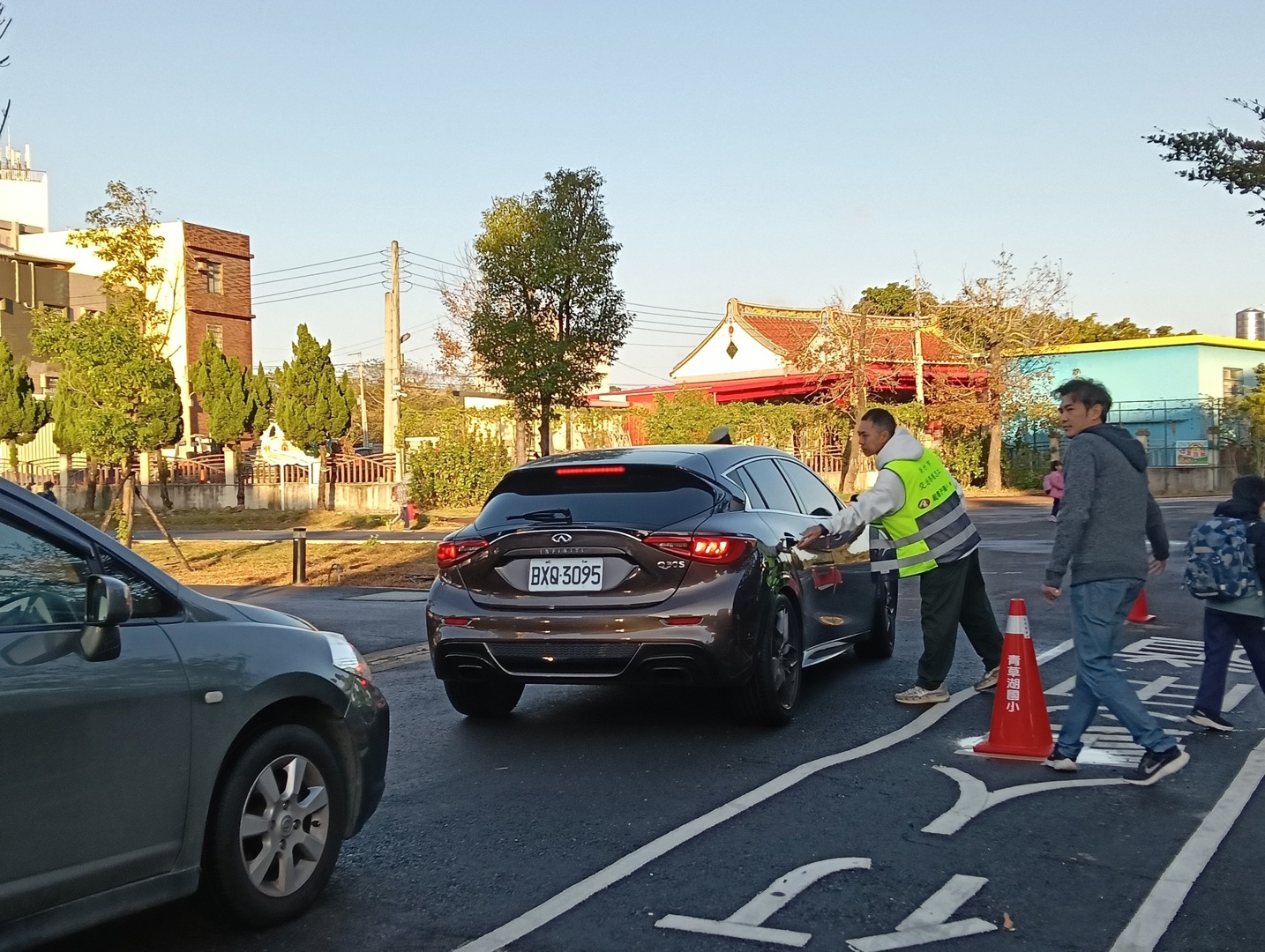 青草湖國小因校園外圍通學步道進行施工,為確保學生上下學安全,學校特別強化導護勤務與安全宣導措施。施工期間,校門口周邊動線調整,車流與人流交織情形較以往複雜,導護工作更顯重要。