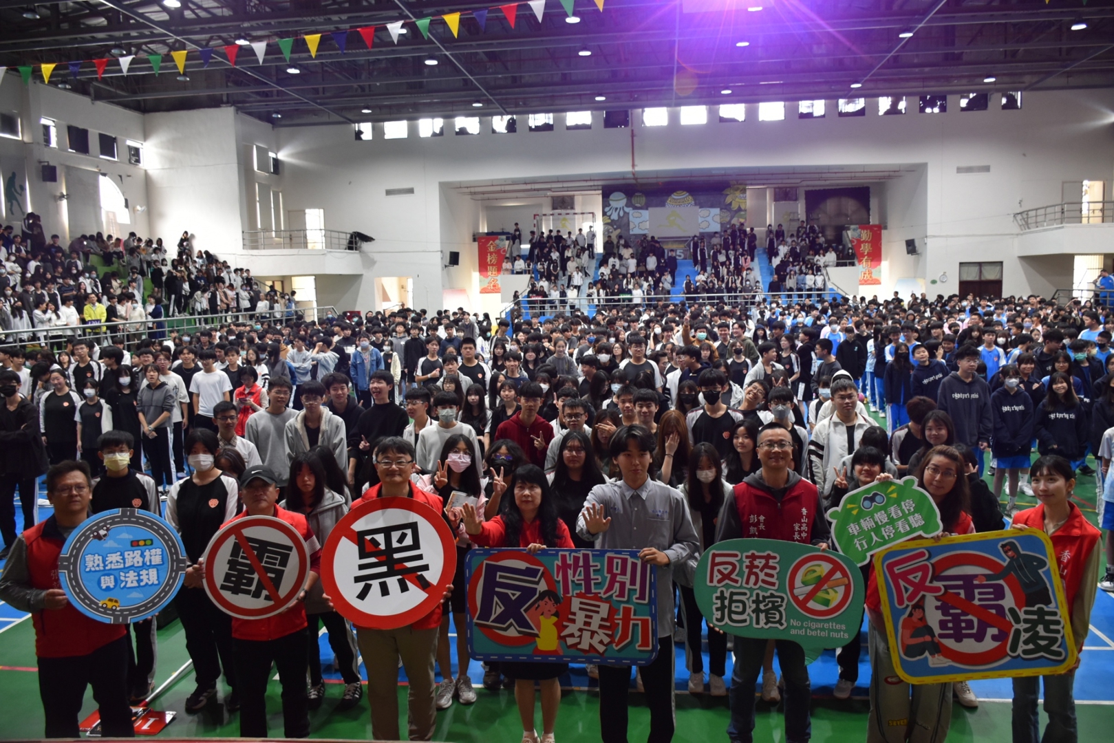 隨後,由學生會會長謝偉正同學代表全體學生,率領全校師生進行友善校園宣誓。在莊嚴而堅定的誓詞聲中,師生共同承諾實踐尊重包容、理性溝通、拒絕霸凌、珍愛生命的核心價值,以具體行動打造溫暖有序的校園環境,展現出全體師生對友善校園理念的高度認同。