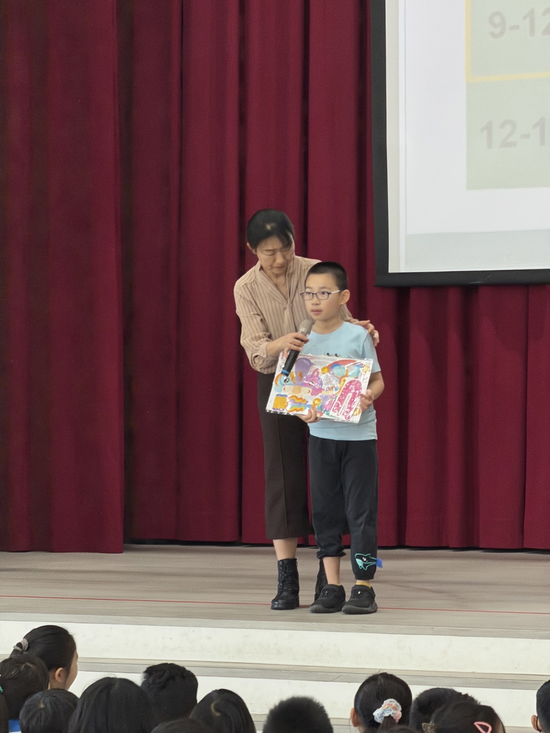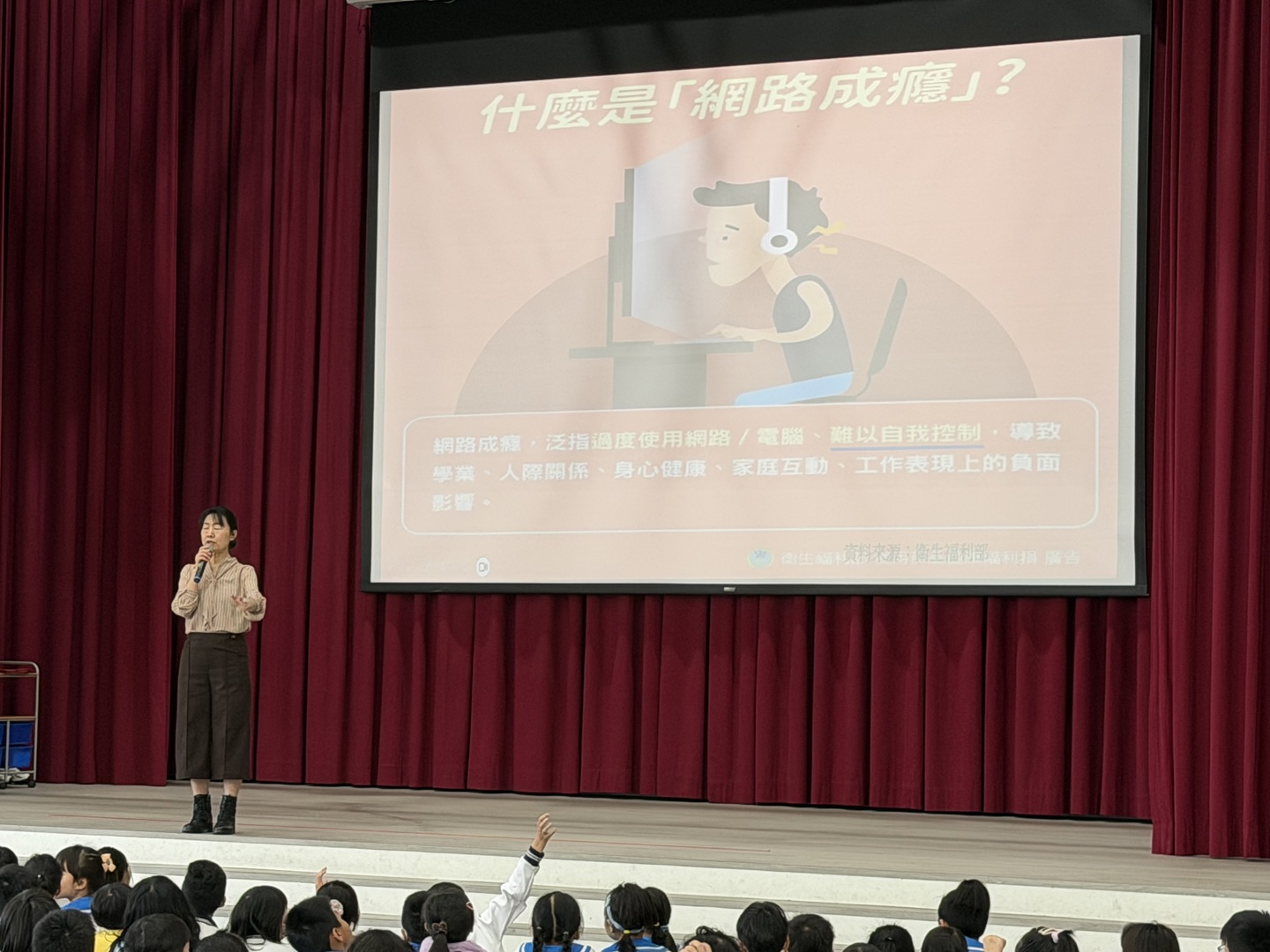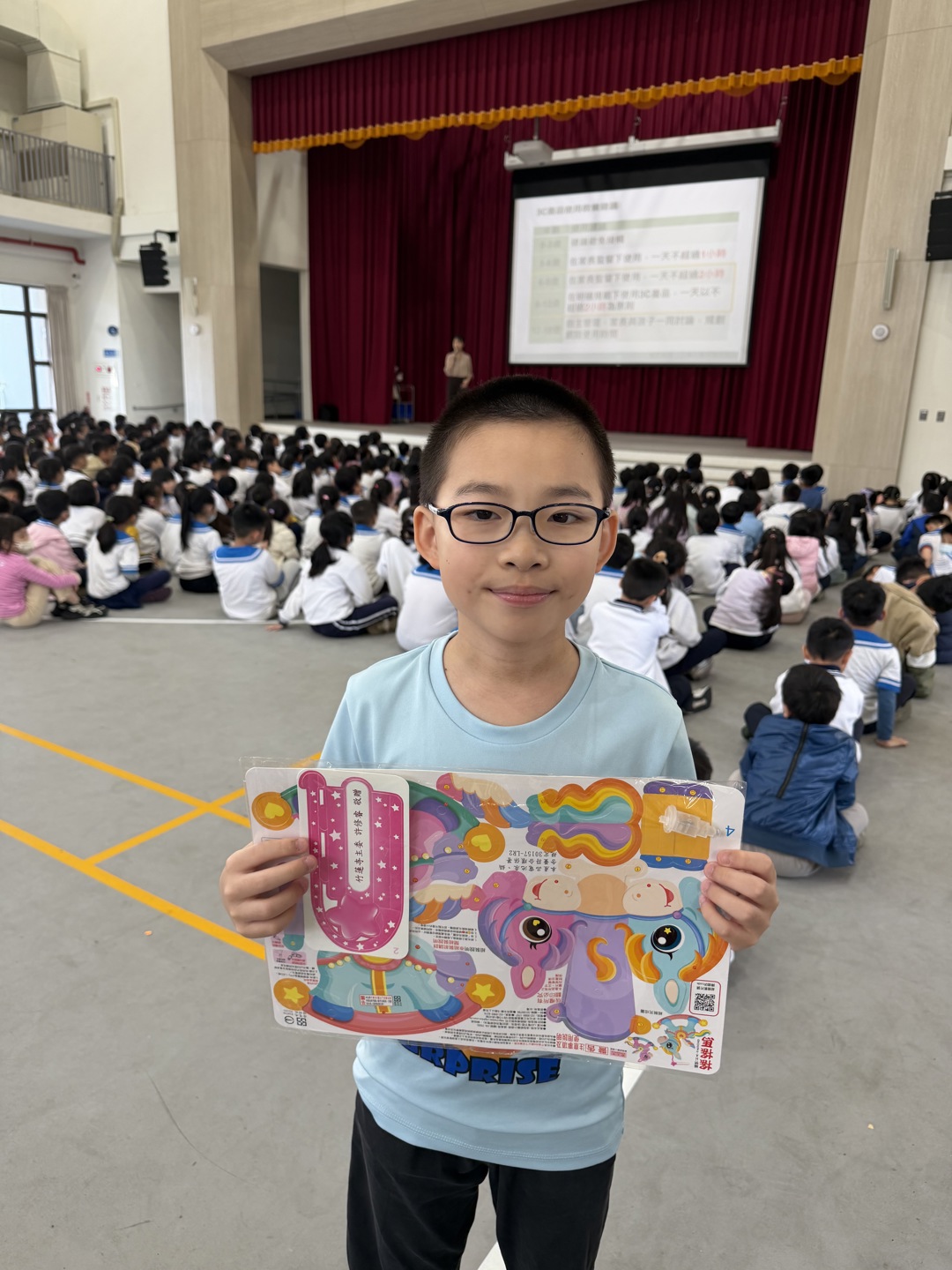 在互動問答環節中,本班的黃仰樂同學表現極為出色!面對校長提出的挑戰,他不僅大方舉手,更勇敢上台清晰地回答網路正確使用方法。仰樂提到:「每天使用網路應不超過一小時」,並對其餘時間的充實安排提出了很棒的見解。仰樂優異且自信的表現,獲得了全場師生的熱烈掌聲,並由校長親自頒發「馬到成功」燈籠組作為獎勵。