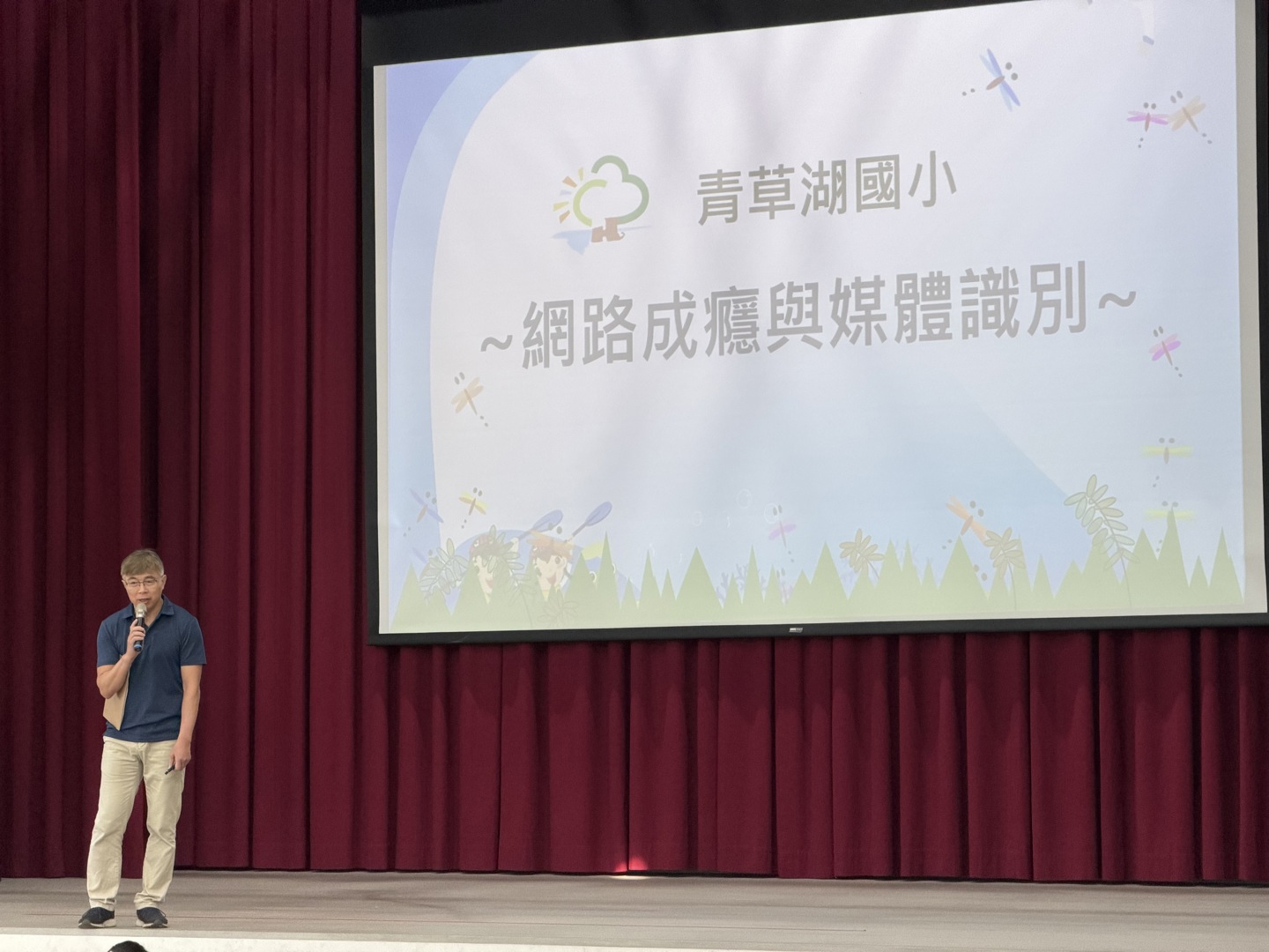 今日青草湖國小舉行兒童朝會,特別針對「網路成癮與媒體識別」進行校園安全宣導。在雯娟校長與各組長的生動講解下,孩子們學習到在虛擬世界中「親眼所見不一定是真」的媒體識讀核心概念,以及培養健康上網習慣的重要性。