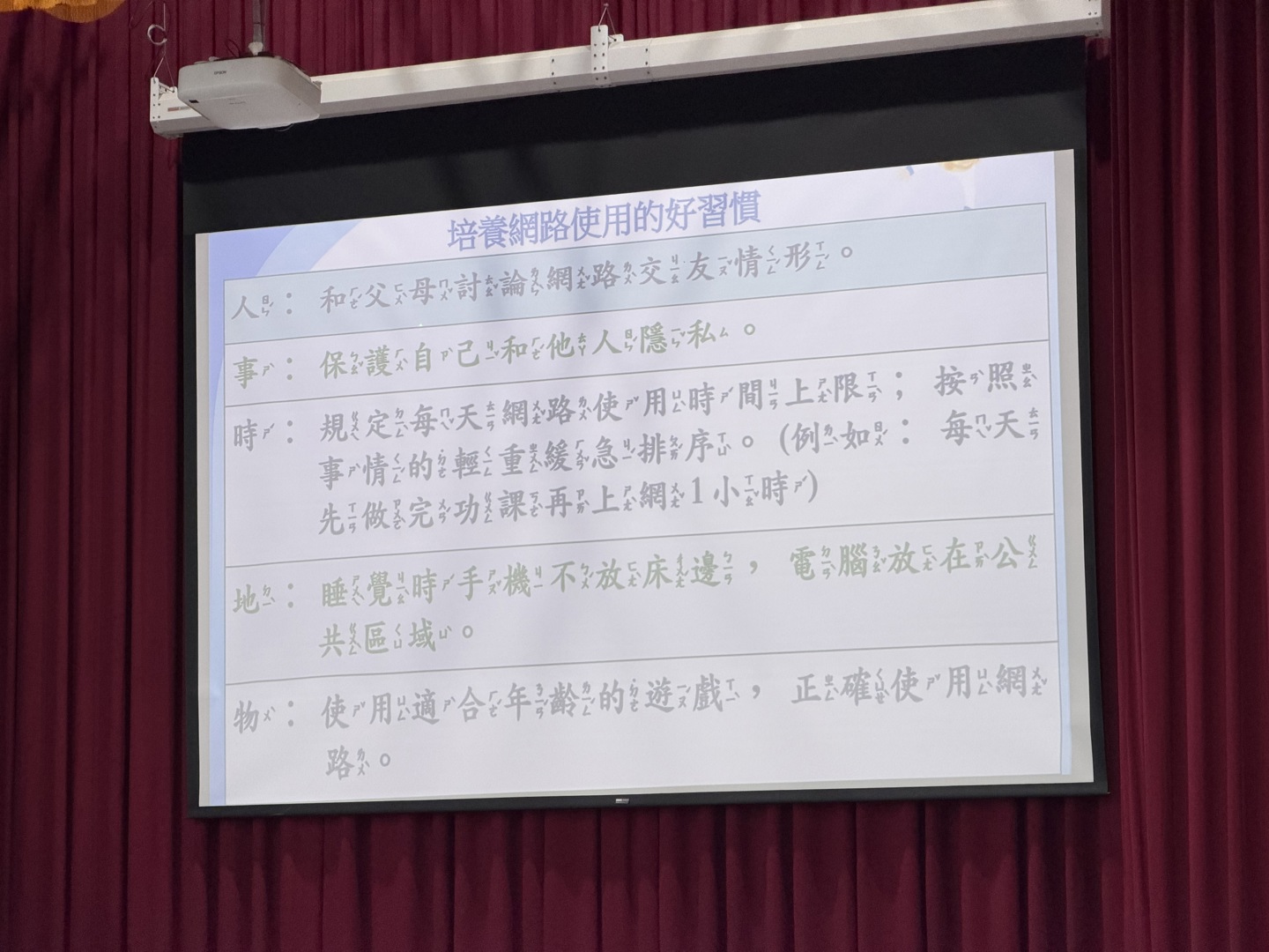 學校也藉此機會提醒家長,建議與孩子共同制定「人、事、時、地、物」的上網守則,例如:睡覺時手機不放床邊、優先完成功課再上網等,讓我們一起守護孩子的數位生活健康。