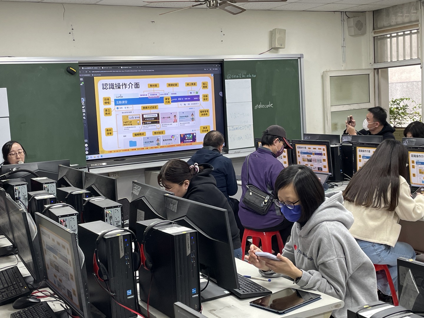 研習過程中,何家鳳老師現場示範了如何將傳統簡報快速導入 Lumio 平台,並透過 AI 助攻功能,實現「一鍵生成」互動遊戲與評量。這項技術大幅減輕了教師備課的負擔,更能即時掌握學生的學習成效。參與研習的教師們紛紛拿起自備的平板,親自體驗基礎操作與教材資源分享,現場互動氣氛熱烈。