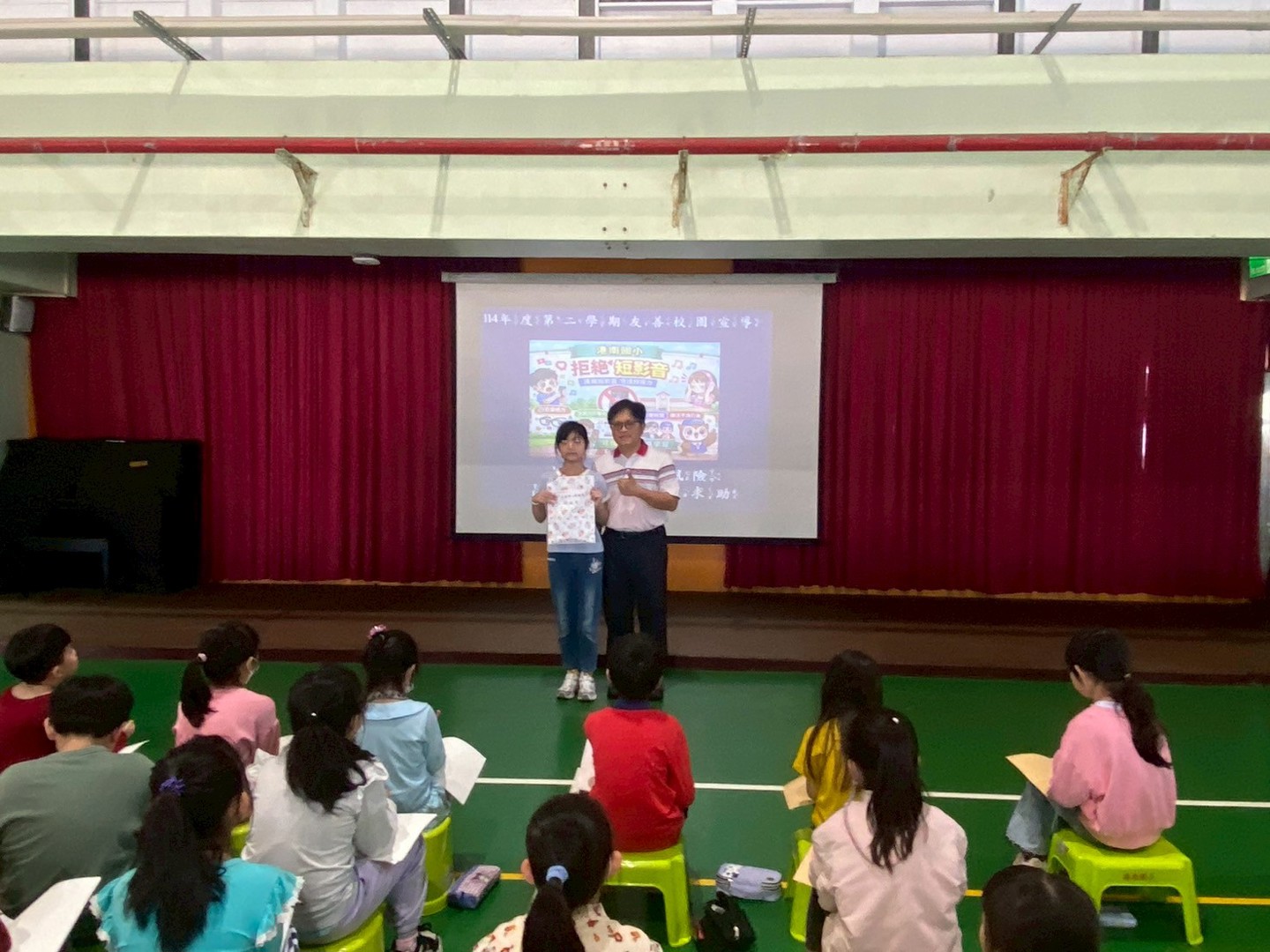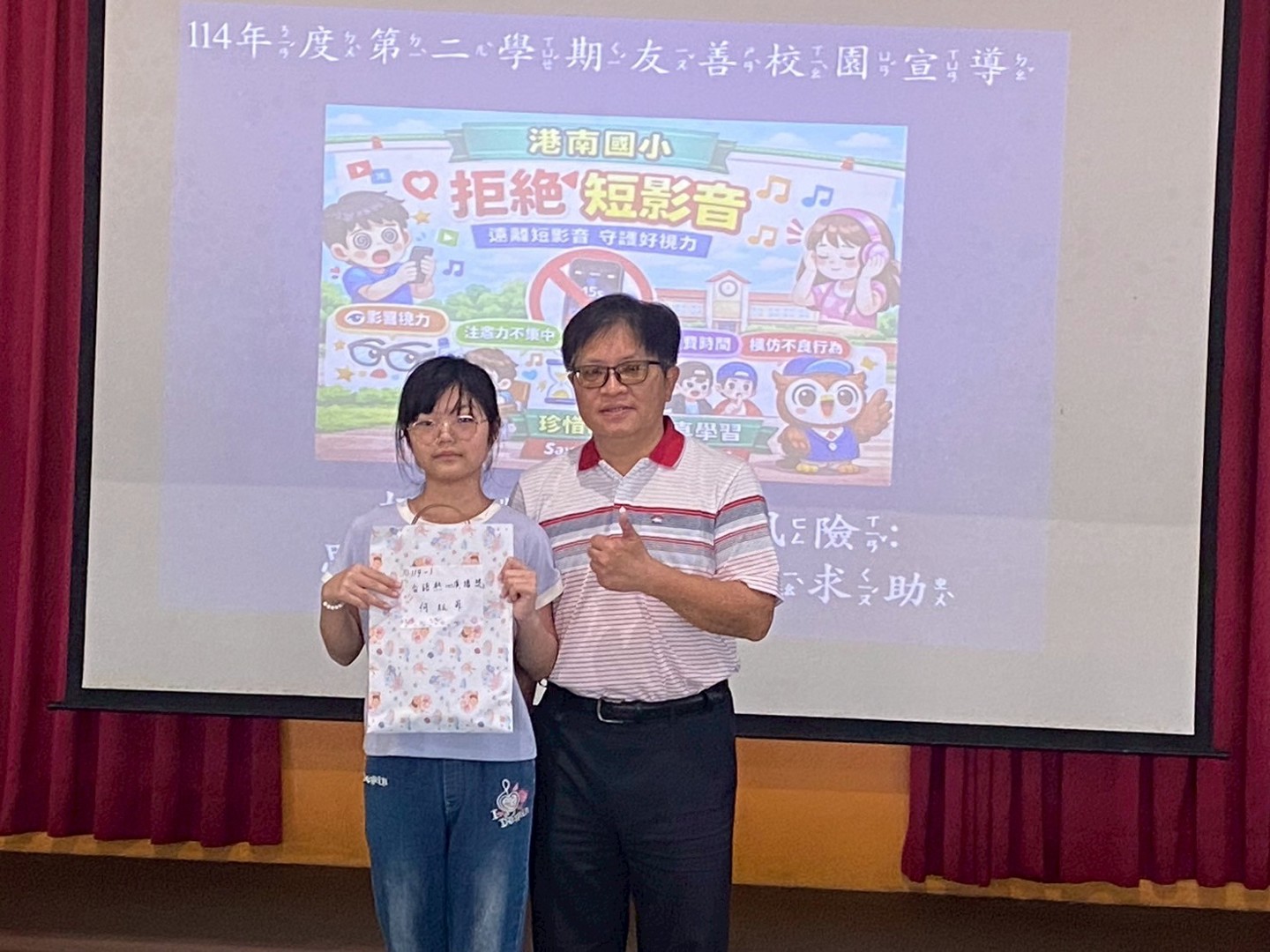 115.03.02 本日學生週會中,教務處怡寧老師頒發114學年度第一學期「晨間廣播小主播獎」,並由兆寅校長親自頒發獎項與獎狀,肯定孩子的優異表現。