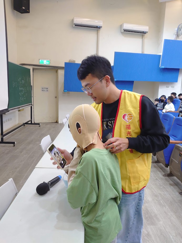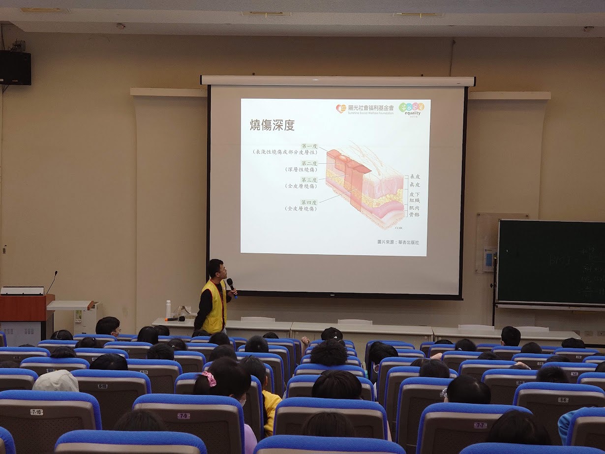 活動一開始,基金會的講師向同學介紹陽光基金會平時服務的對象,包括因燒傷、顏面損傷或先天外貌差異而需要協助的人。透過簡單的故事分享與互動提問,讓大家了解這些人日常生活中可能面對的困難,也提醒同學不要因為外表而對他人產生刻板印象。