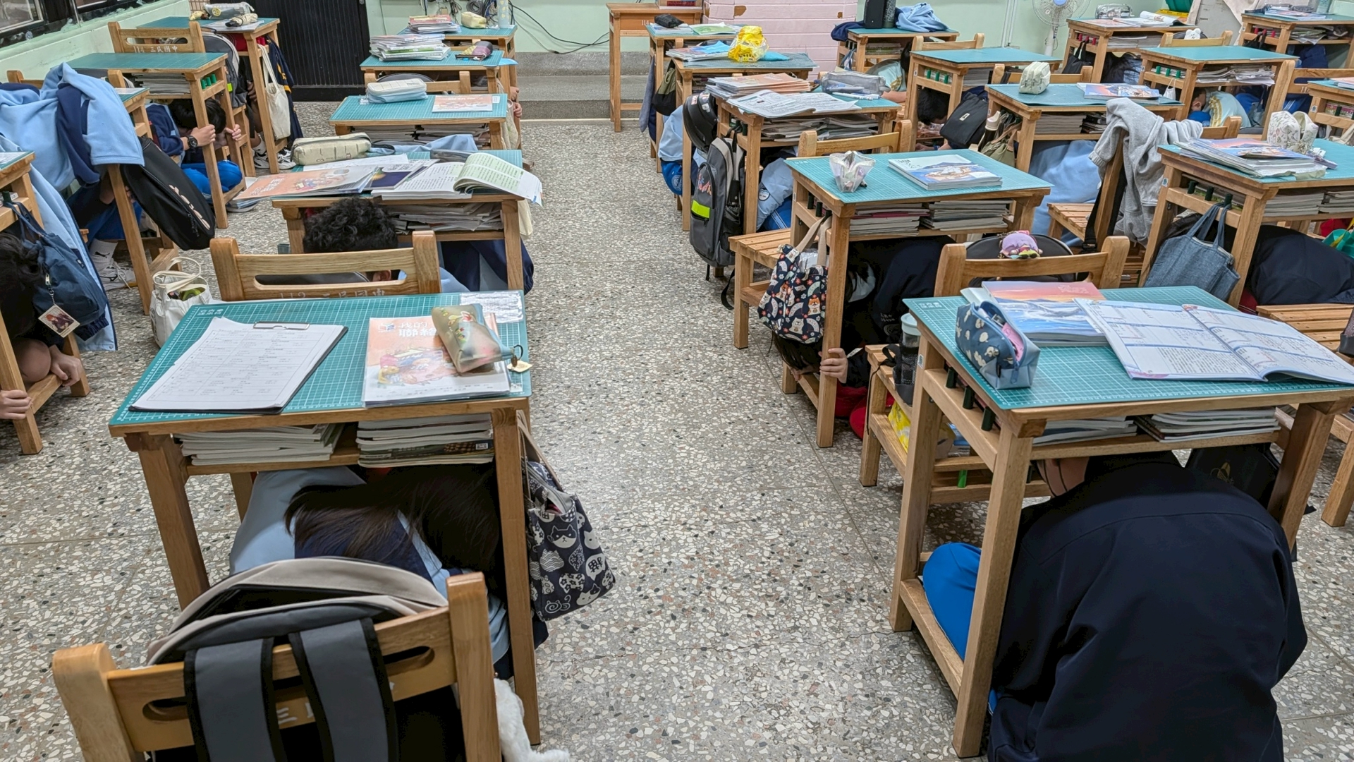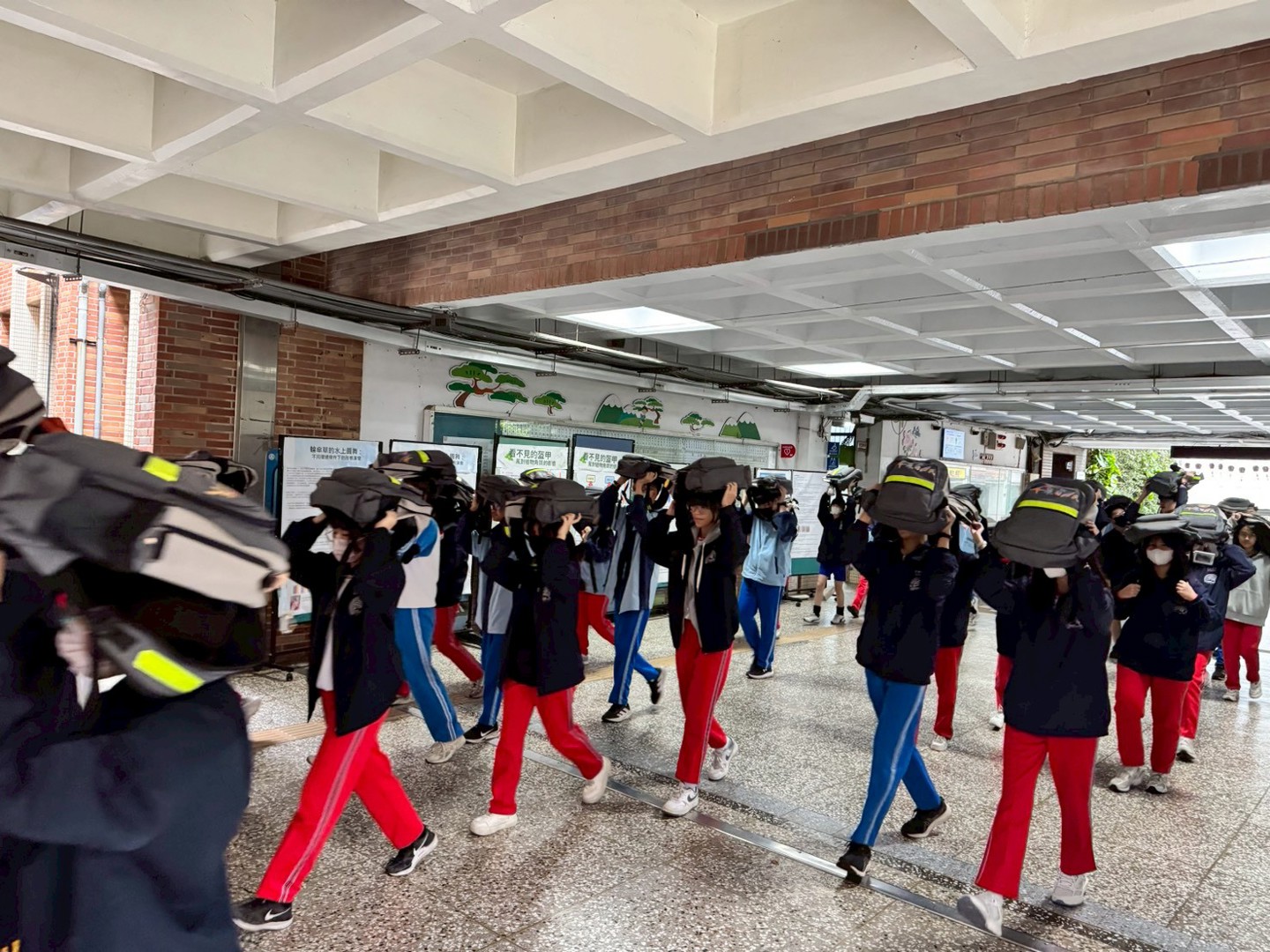 本次演練模擬地震發生情境,首先進行地震避難動作演練,各班學生依指示迅速完成「趴下、掩護、穩住」的防護動作,確保頭部與身體安全。隨後在老師引導下,依照既定疏散動線有秩序地撤離教室,前往操場集合地點,過程中全體學生保持冷靜、不推擠、不奔跑,展現良好的防災紀律。
