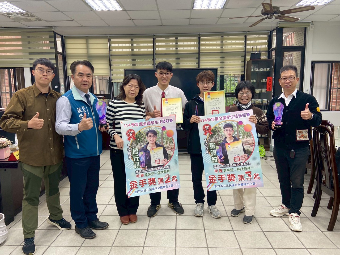 本校就讀苗栗農工的曾元祺、羅翊銨兩位校友,在114學年度的全國高中技藝競賽中,勇奪森林職種第一、二名,3/6由苗栗農工張世波校長及師長親自帶領回母校報喜。兩位校友在國中時都選讀技藝課程,對手作課程具高度興趣,展現明確的技職傾向,在技藝競賽中也有亮眼的表現,在升學時,忠於自己興趣,勇敢跨出熟悉的舒適圈,毅然選擇了遠在苗栗的學校,且並非一般人熟悉的職科,苗農廣闊而美麗的校園,若加上實習林地有數十公頃,讓他們的學習更加如魚得水,秉持著一貫的學習熱忱和認真的態度,果然三年有成,在全國性的大賽中奪得最高榮譽,也都取得國立大學的保送資格。本校丁淑觀校長表示:三民雖是都會型學校,升學成績亮眼,但一直也都兼顧各類不同學生的需求,引進各項資源,希望讓學生都能適性發展,各展長才,像寒暑假開辦的水電達人、餐飲達人等營隊,廣受好評,也開展了孩子們對技藝學習的興趣。此次兩位校友親自帶回好消息,更證明生涯發展的多元開放,技職領域在未來的前途也是不可限量。