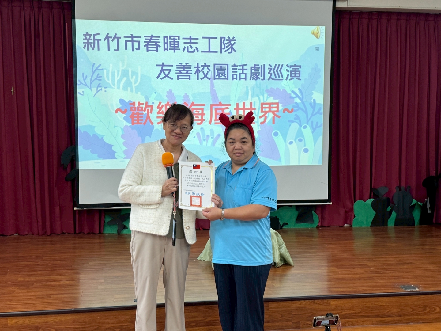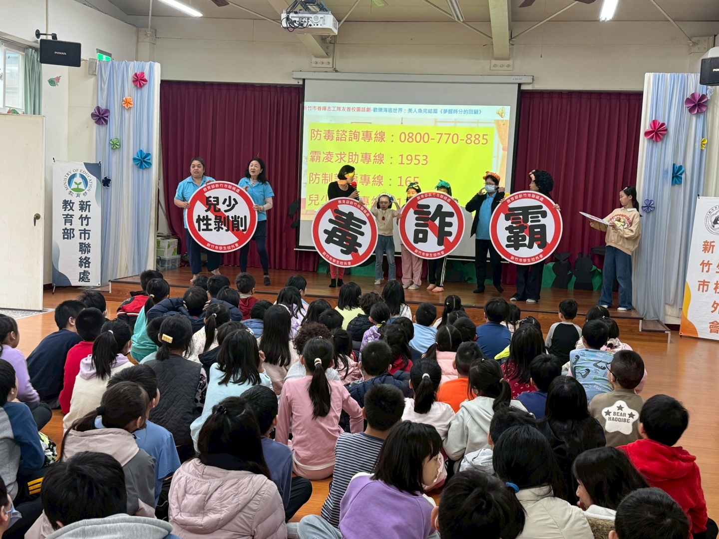 為提升學生對於校園安全與自我保護的意識,新竹市校外會結合春暉志工隊,到本校進行「友善校園」宣導活動。本次活動以生動有趣的話劇方式呈現,宣導主題包含反詐騙、反毒品、反霸凌及防制兒少性剝削等重要議題,希望透過活潑的演出,讓學生在輕鬆的氛圍中學習正確觀念。