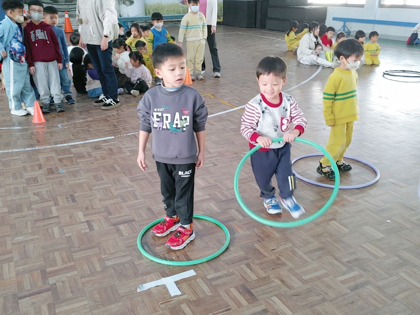 今天帶領全園幼兒認識健康飲食,並且學習青菜、肉和水果的母語,除此之外我們一起進行動感的律動以及呼拉圈體能遊戲,大家一起共度美好的週三時光。