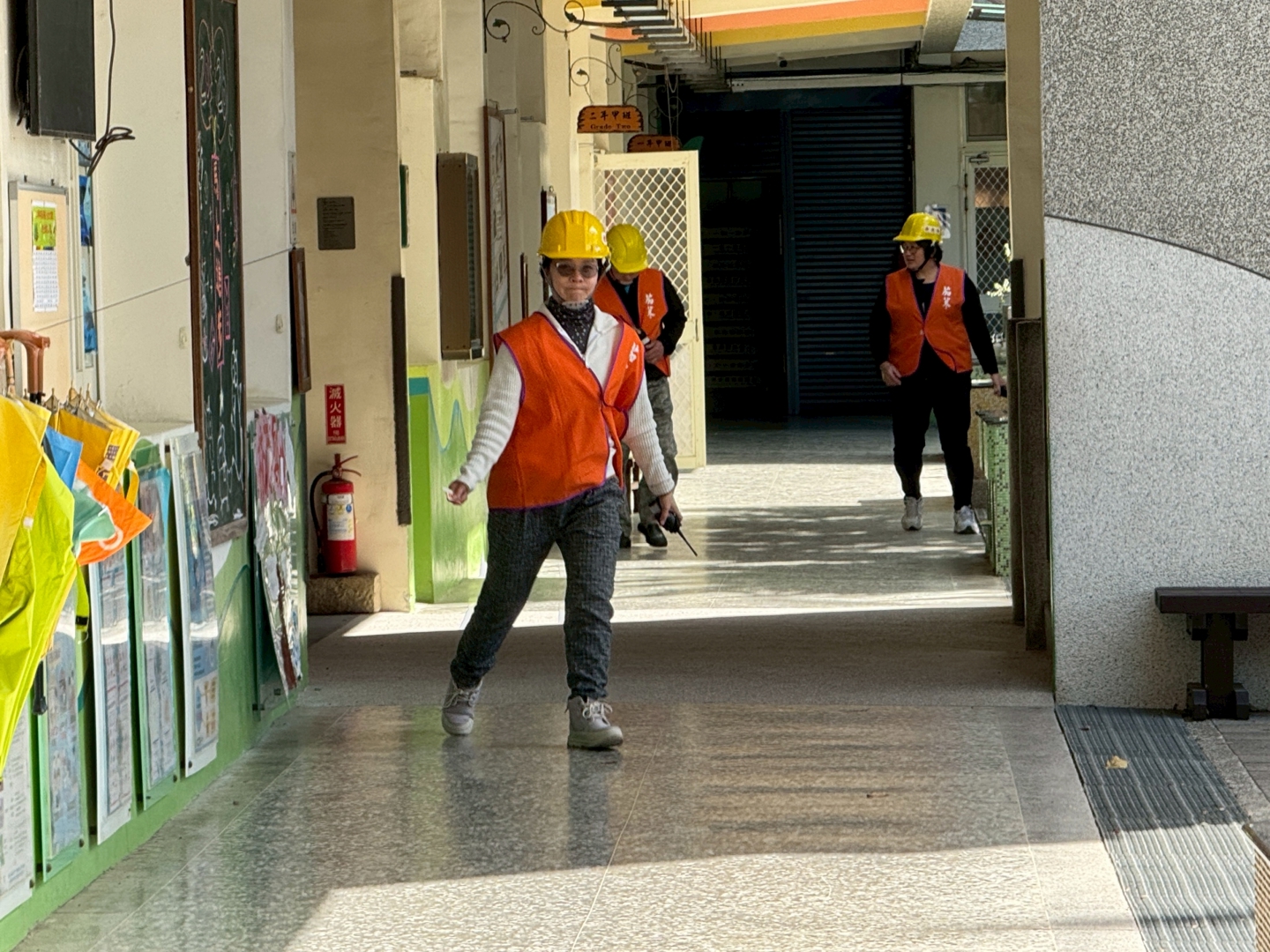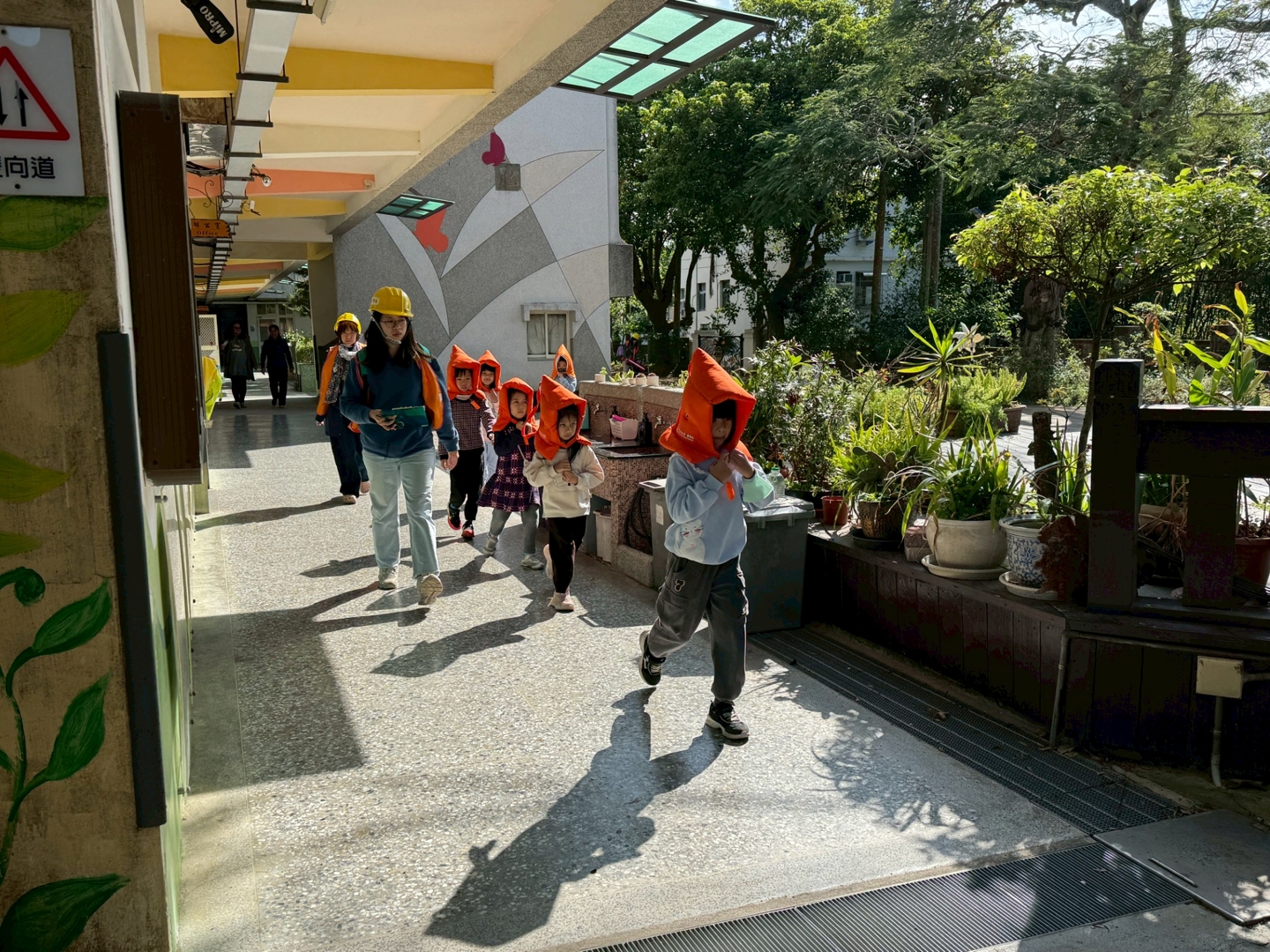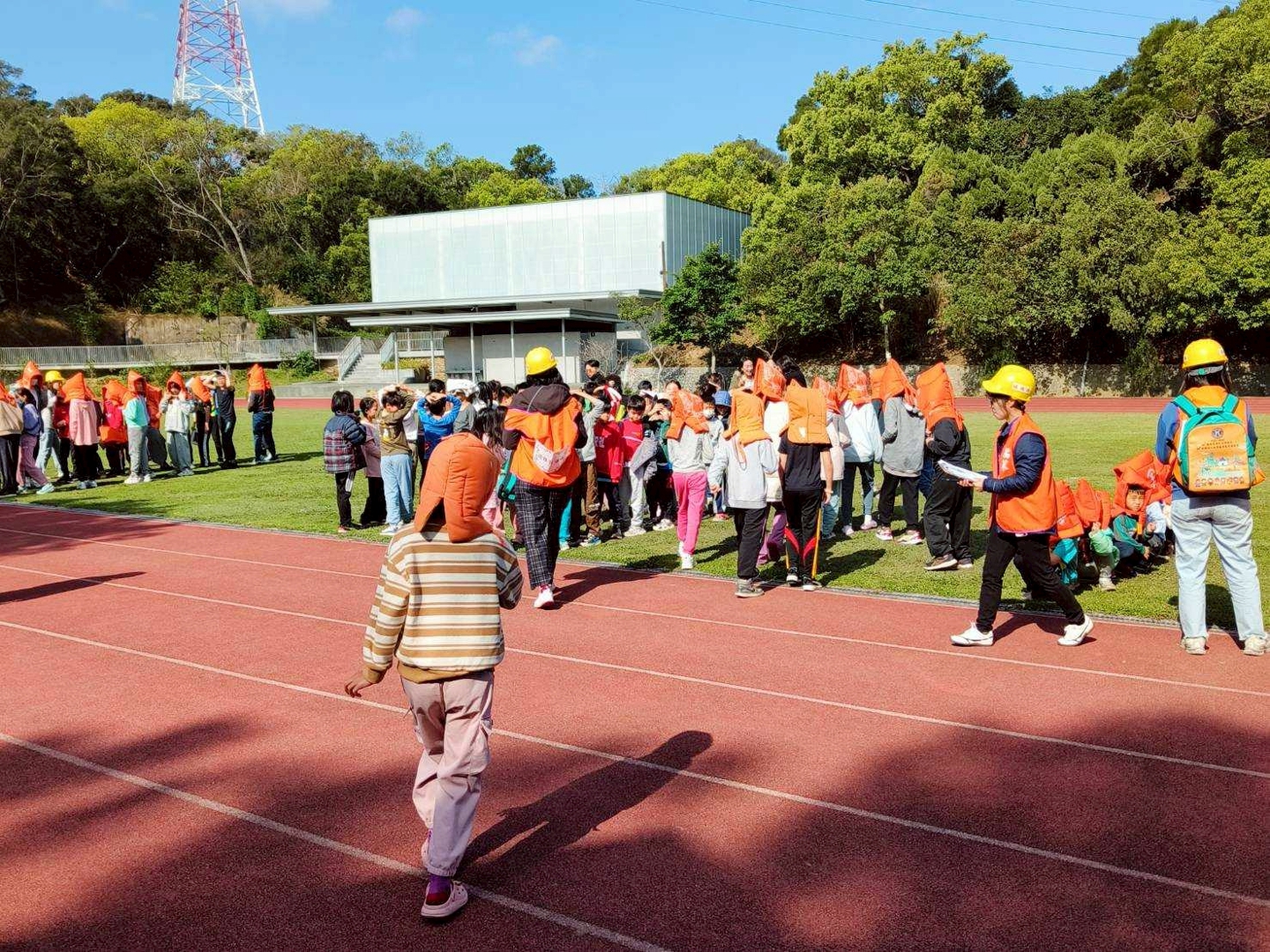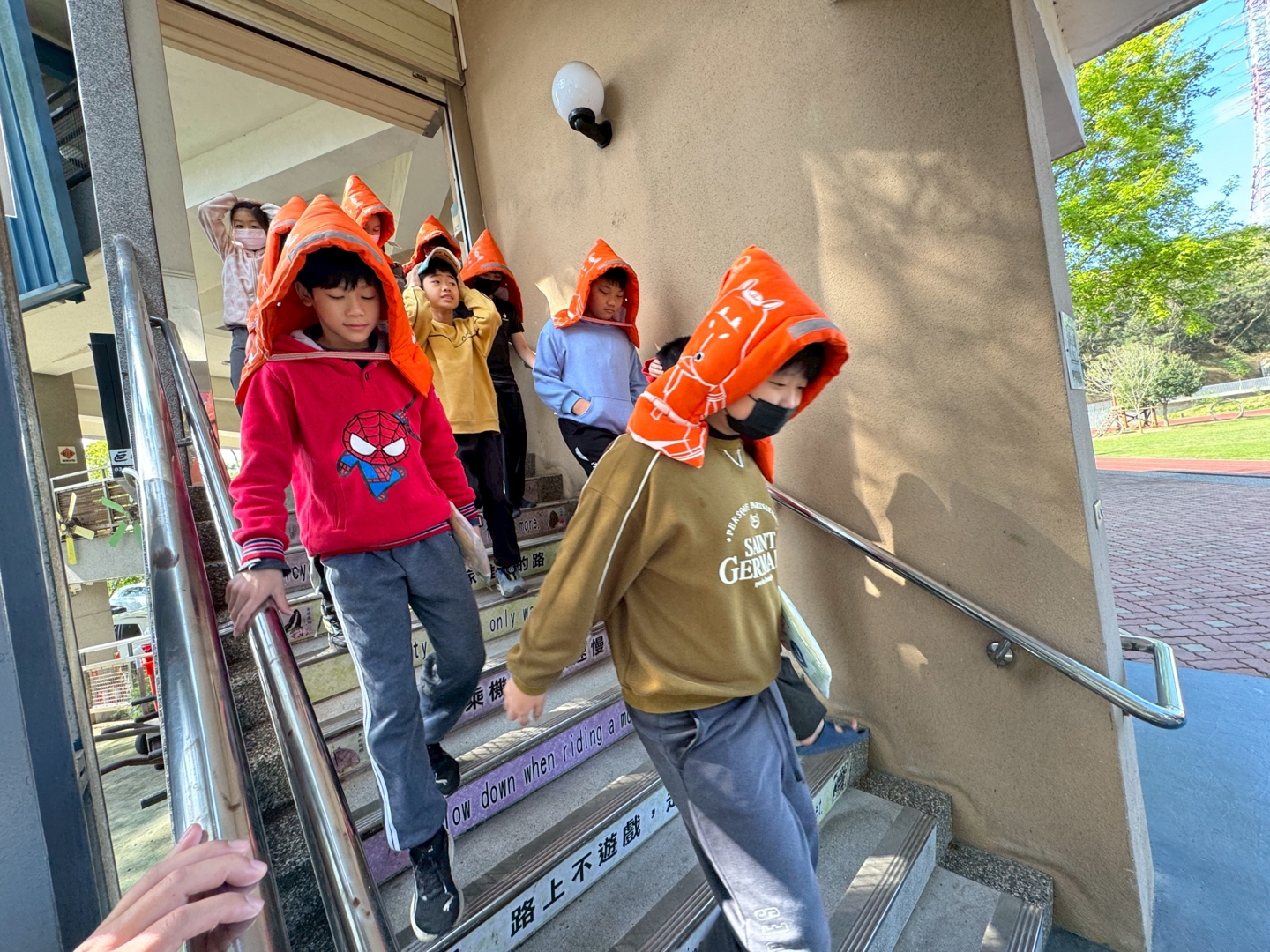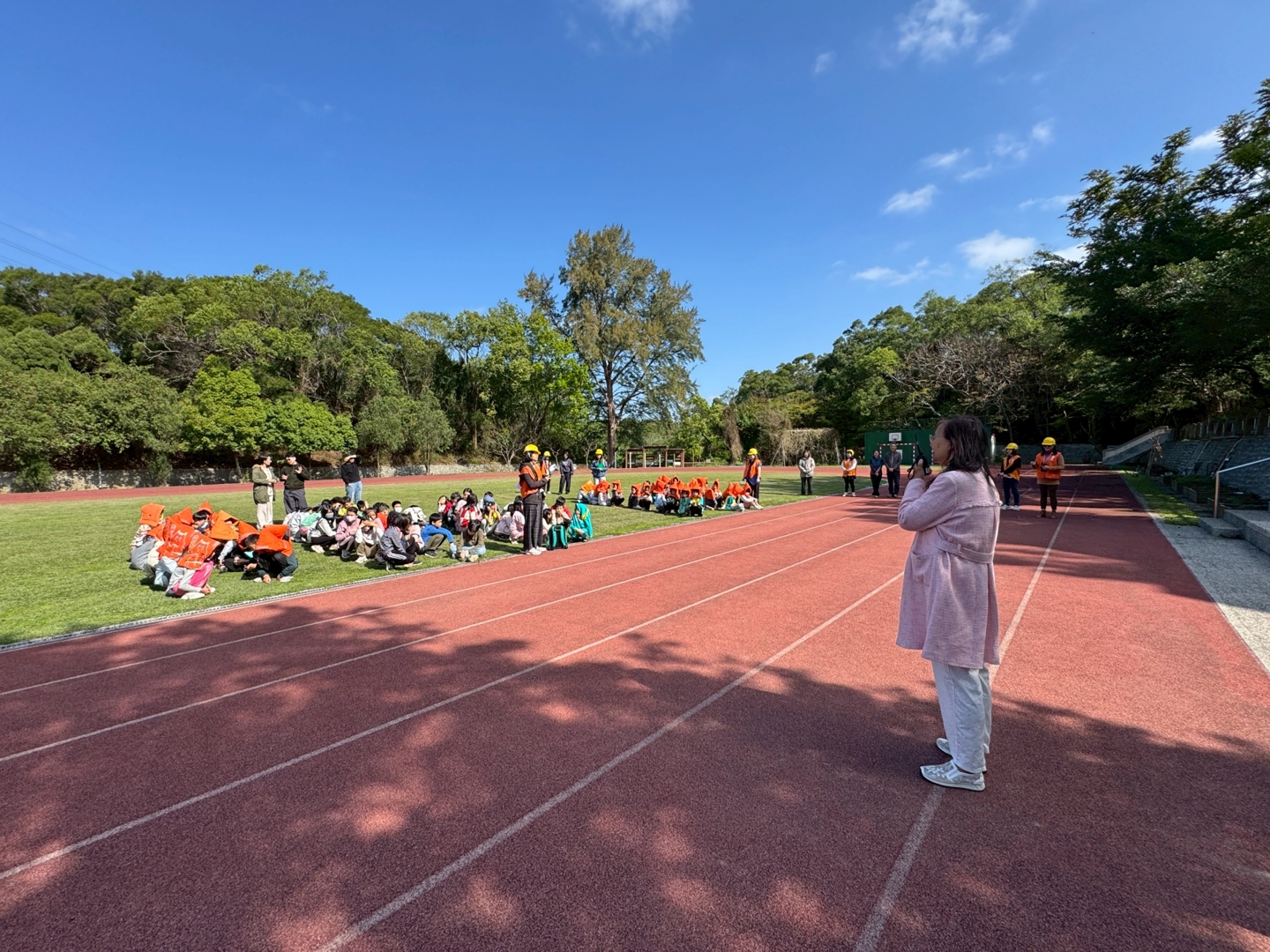 防災避難演練,模擬地震發生時的應變情境。當警報聲響起時,各班學生在老師的指導下立即採取「趴下、掩護、穩住」的防震動作,就地進行安全防護。待警報解除後,師生依照既定疏散路線,有秩序地前往操場集合避難。過程中,各班導師迅速清點人數並回報,確保所有學生皆安全到達集合地點,整體疏散過程迅速且有條不紊。
