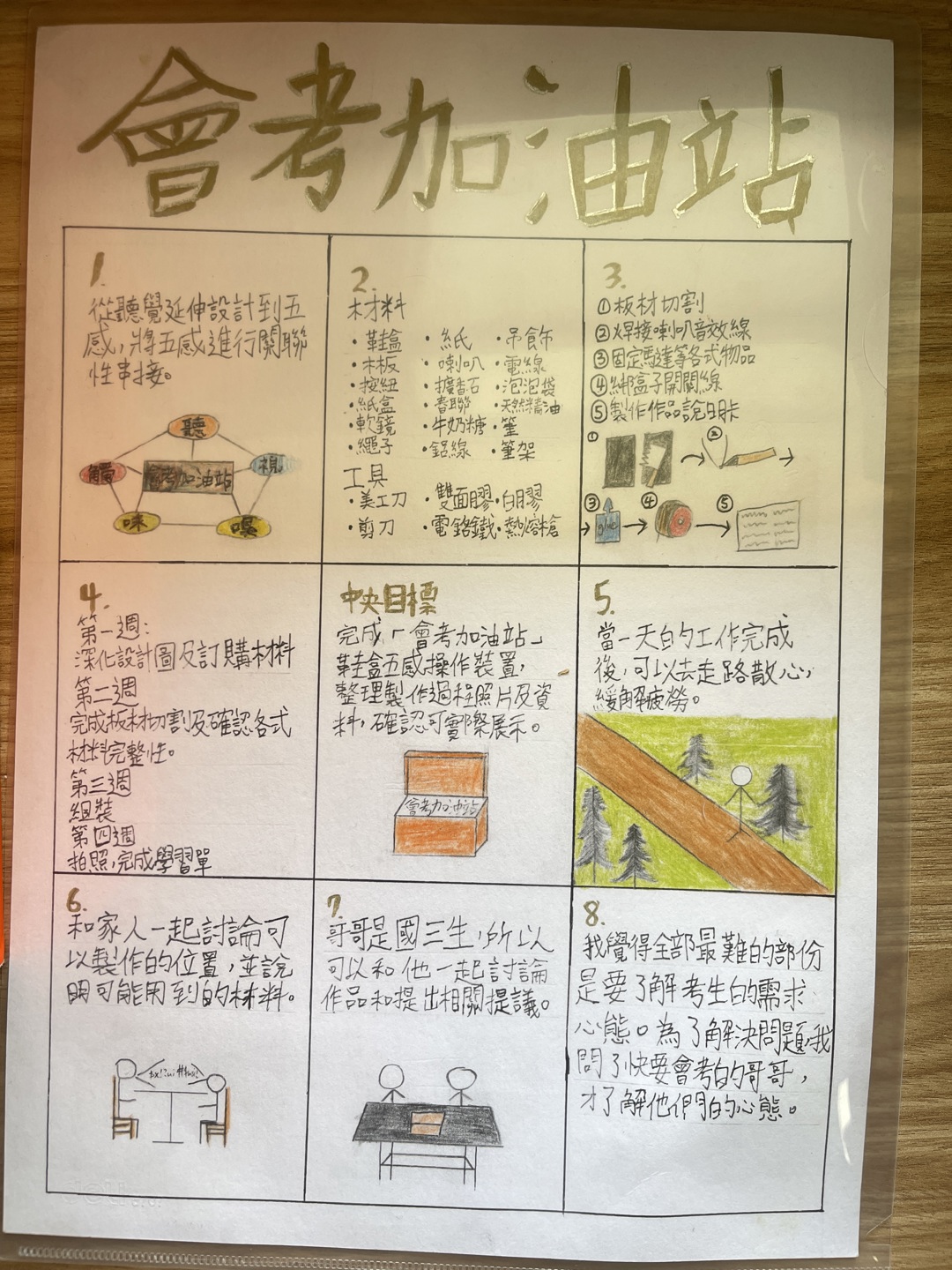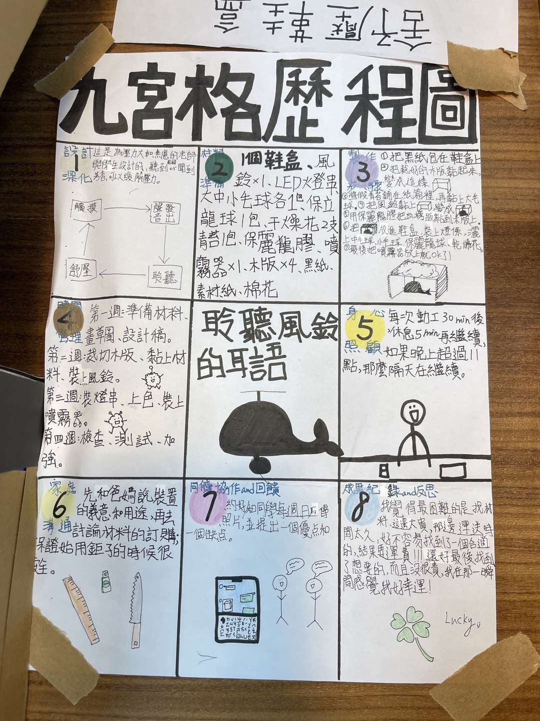 最具特色的「共感五感裝置」設計,要求學生在限制的「鞋盒尺寸」內,運用視、聽、嗅、觸、味覺元素,為特定情緒困境(如考試焦慮或孤立感)設計療癒方案 。寒假期間,學生更運用「大谷翔平九宮格」進行自主管理與行動規劃 。開學後的公開展示,則透過 Padlet 互動技術收集全校師生回饋,讓學生在「設計—實作—反思—再設計」的循環中,體現從自我中心向他者覺察的視角轉移 。