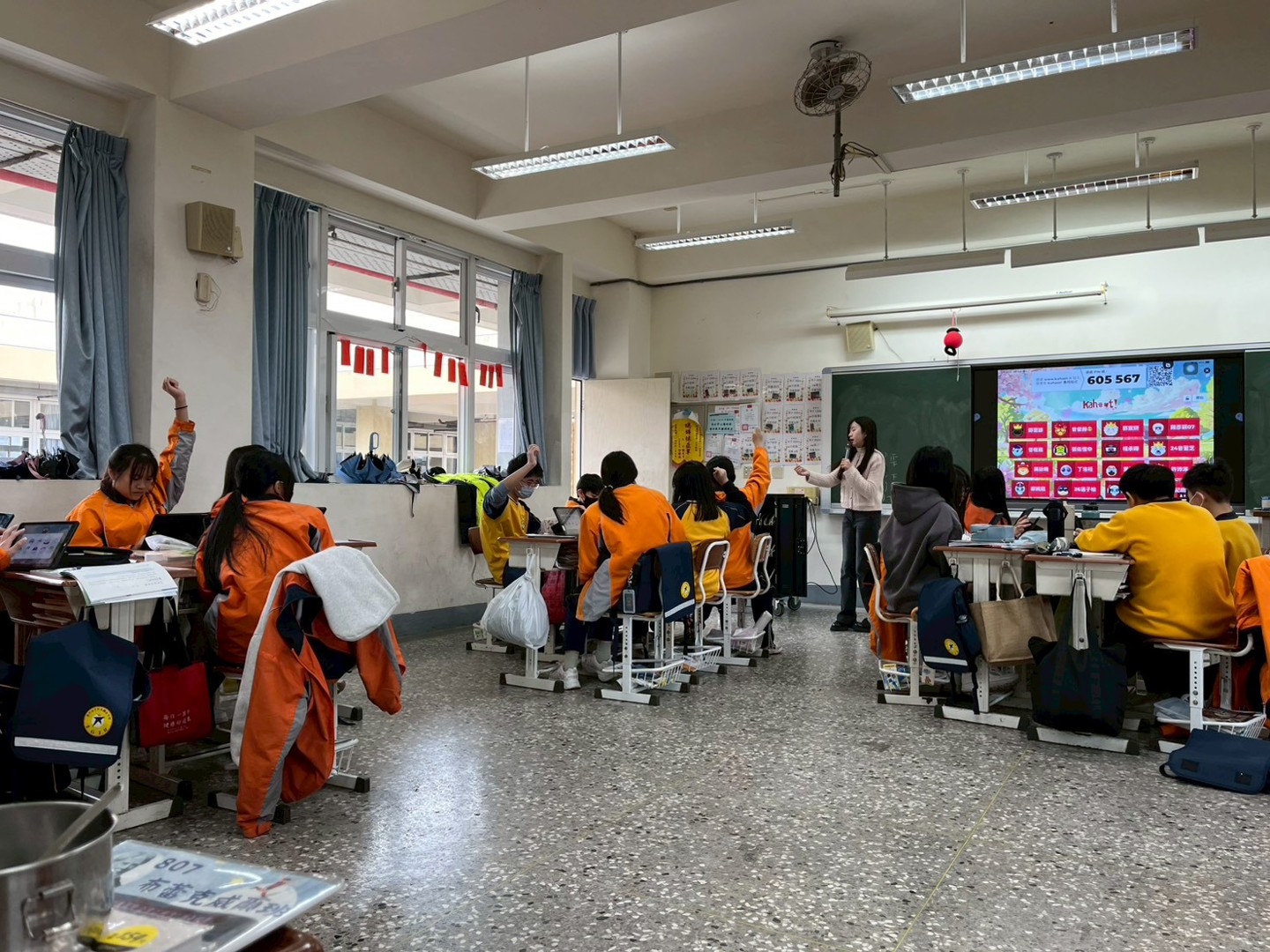 題目收集完畢後,全班進入Kahoot搶答平臺,一場緊張刺激的知識競技正式開打。老師說明規則:「比的就是正確率,還有誰越快答出來,你的分數就會越高」,前三名更可獲得獎勵並為組別加分,現場氣氛頓時沸騰。最精彩的環節,莫過於各組代表輪流上臺擔任小老師,向全班解析自己設計的題目。第一組代表針對〈靜夜思〉的題目,清楚說明:「裡面的詩並沒有說明旅途行路,所以選項不能選。」獲得老師讚賞:「很好,第一組非常好,考到大家了。」第四組則針對〈早發白帝城〉精準解析詩意:「猿聲還沒停,船就已經過很多山了。」並能進一步辨析選項中雖含「誇飾」修辭,但其用意並非凸顯遙遠,展現出超越文本表面的深度理解。