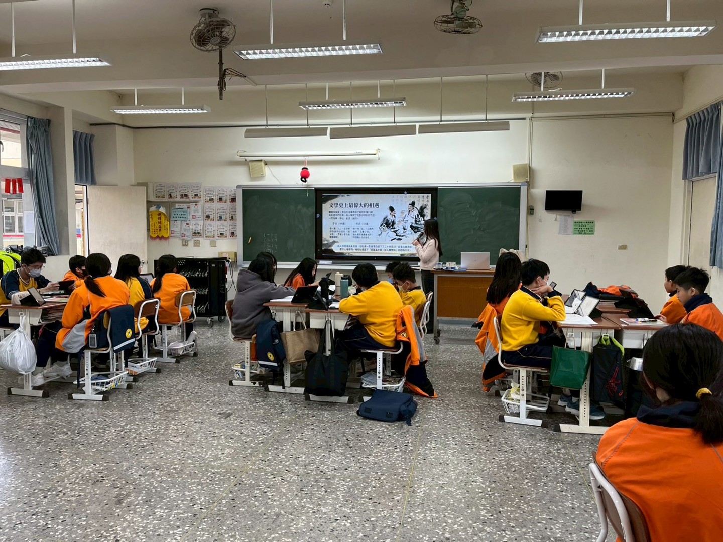 課堂開始,李老師並未急著帶領學生逐字逐句解析詩文,而是以說書人的姿態,娓娓道來李白跌宕起伏的一生。從宮廷歲月、與杜甫的相遇,到安史之亂的烽火離亂,再到晚年流放與孤寂,老師將五首絕句的創作背景一一嵌入李白的生命脈絡之中。課堂中,老師引導學生回憶歷史:「這時候整個國家遇到了一場很嚴重的動亂,請問造成的那個人是誰?」學生們隨即精準回答出「安史之亂」與「安祿山」,師生之間的問答互動自然流暢,課堂氛圍熱絡而專注。在講解〈獨坐敬亭山〉時,老師更以深情的語調詮釋詩中孤寂:「雲還有鳥都離他而去,只剩他自己一人,這個世界之間很難再找到一個懂他的人了。」這樣的情境營造,讓學生在進入文本之前,便已在心中為李白的詩歌鋪墊了豐厚的情感底色。