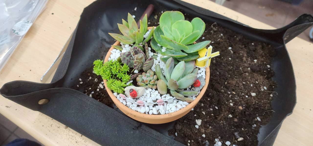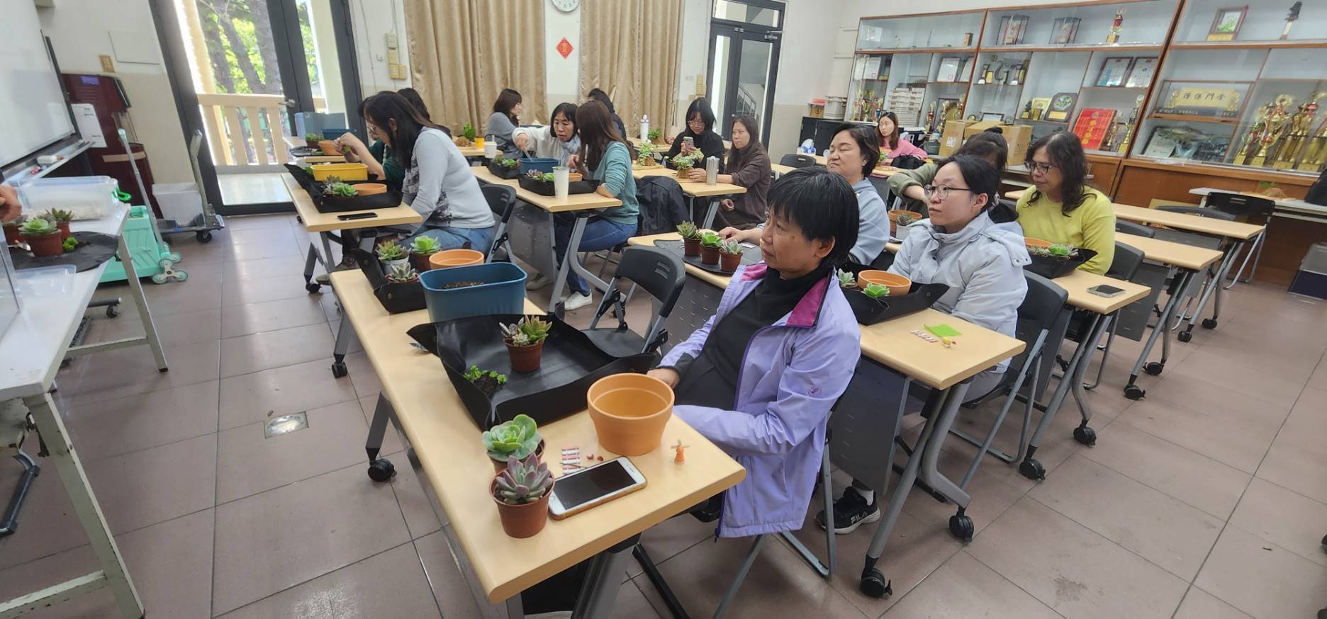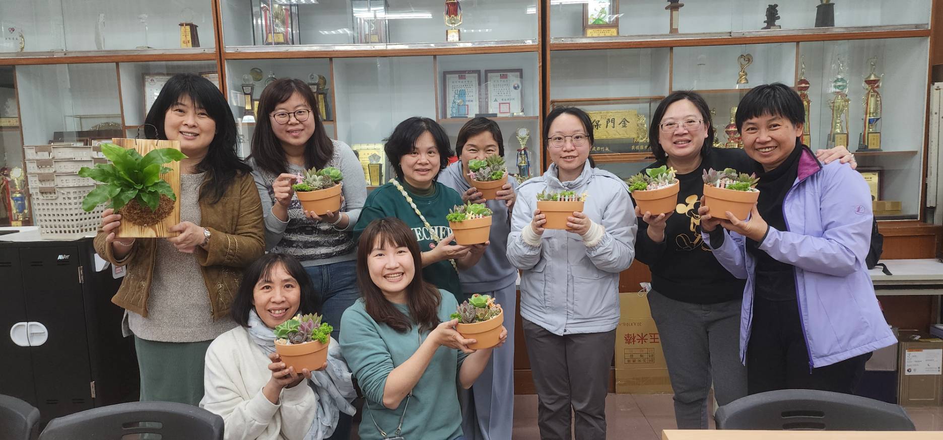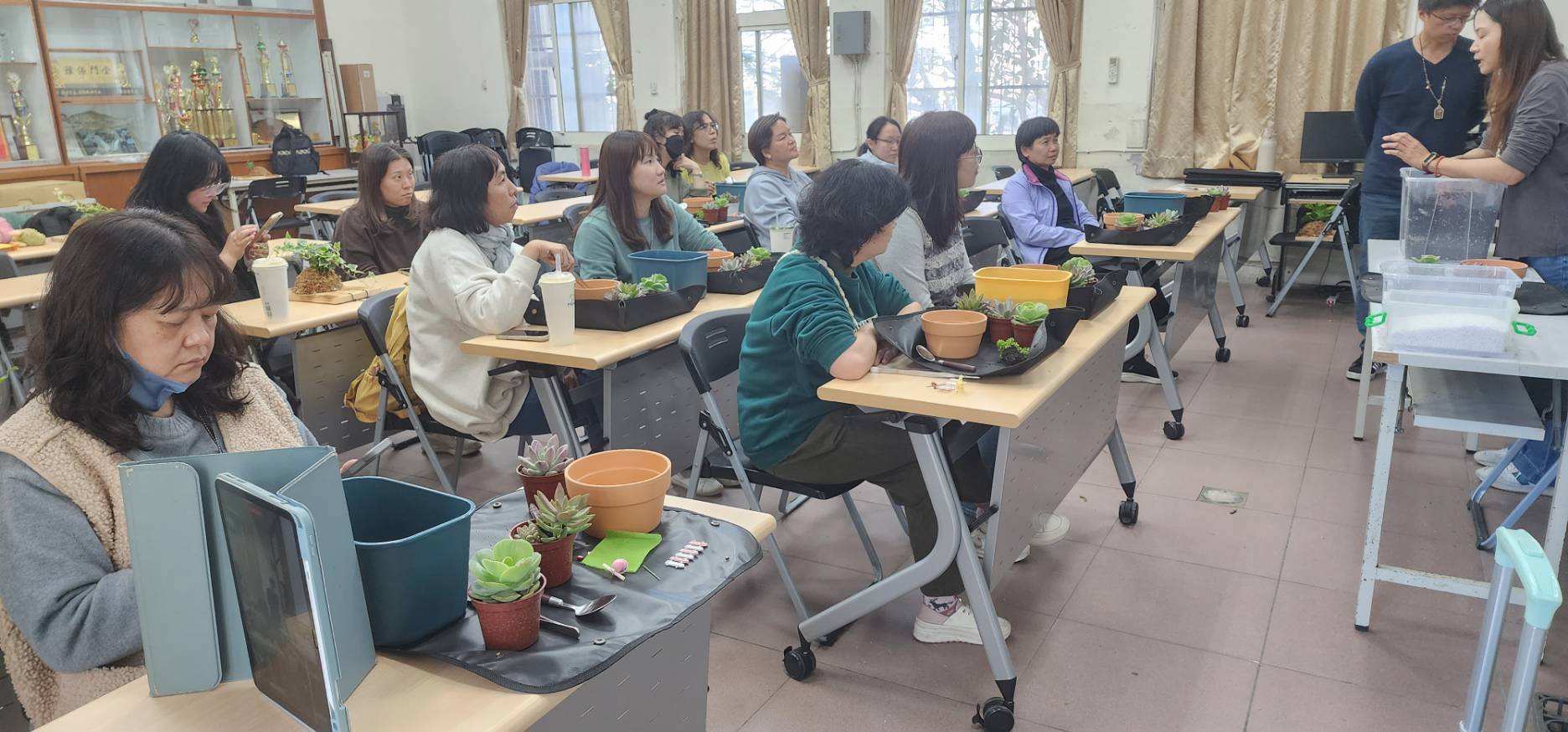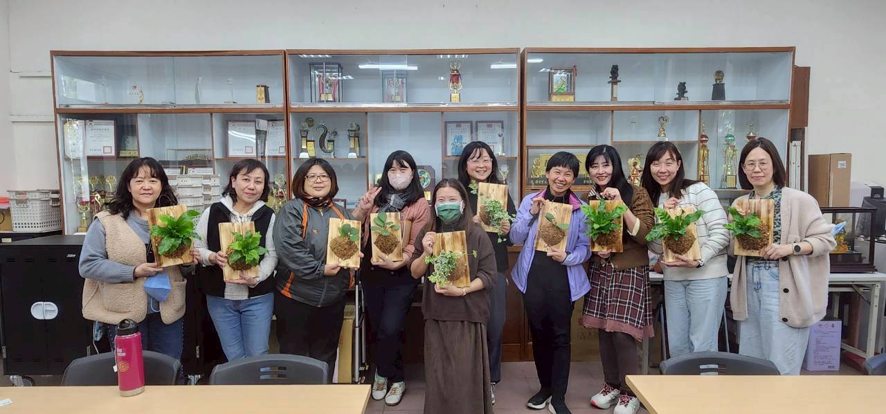 115年3月11日(星期三)下午本校與新竹市北區北門國小合辦一場115年度推動員工協助方案「慢下來的綠時光—療癒植栽手作研習」,邀請到邱利洲老師和歐莉娟老師蒞臨本校,向大家介紹如何照顧植栽,哪些植物需要較強的日照、哪些植物需要通風的環境,透過上板植物與多肉植物的實作體驗,增進對植物的認識。課程中學員們專注聽講,在木板上固定螺絲,用棉線將植物固定於木板上,一步一步跟著老師講解的步驟,漸漸完成專屬於個人獨一無二的上板植物。各具特色的多肉植物,將他們一起放入大盆栽內,各自展露頭角,透過擺放角度的差異,堆疊深淺層次,形成一幅和諧的畫面。最後,大家露出心滿意足的笑容,帶著自己手作植栽回家,收穫滿滿,度過了一個療癒的午後時光。