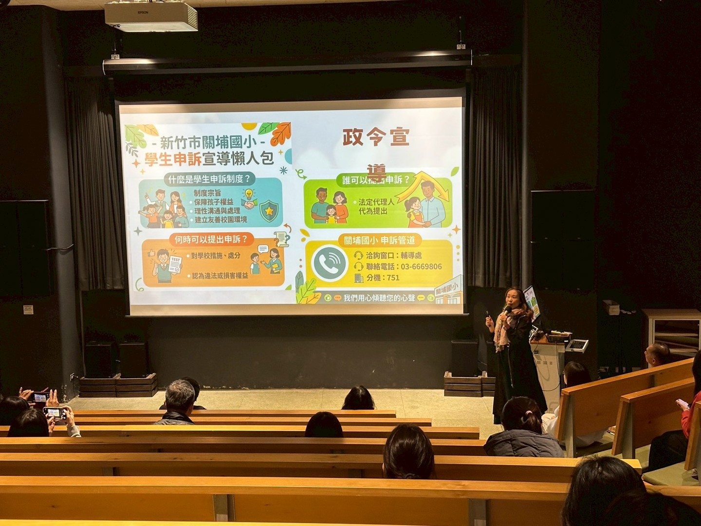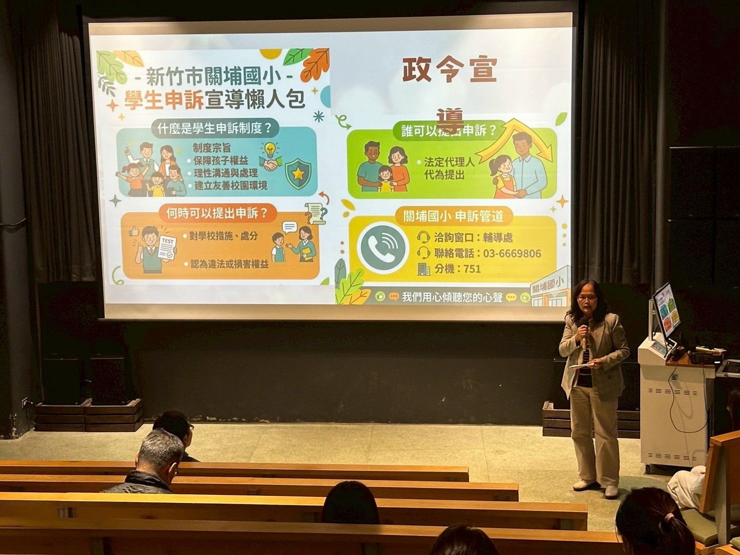 為落實友善校園目標並保障學生受教權,新竹市東區關埔國民小學於本月13日利用家長代表大會,進行「學生申訴制度與管道」專題宣導活動。