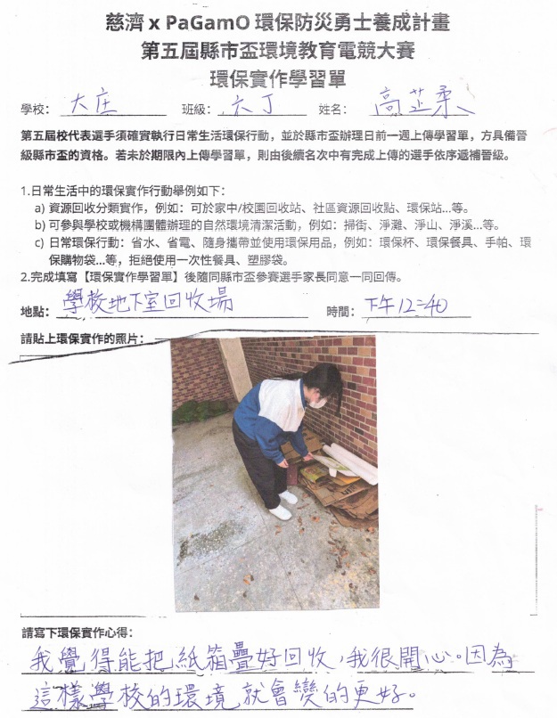 恭喜六年丁班高芷柔同學參加114學年度慈濟PAGAMO環保防災勇士PK賽榮獲第五名