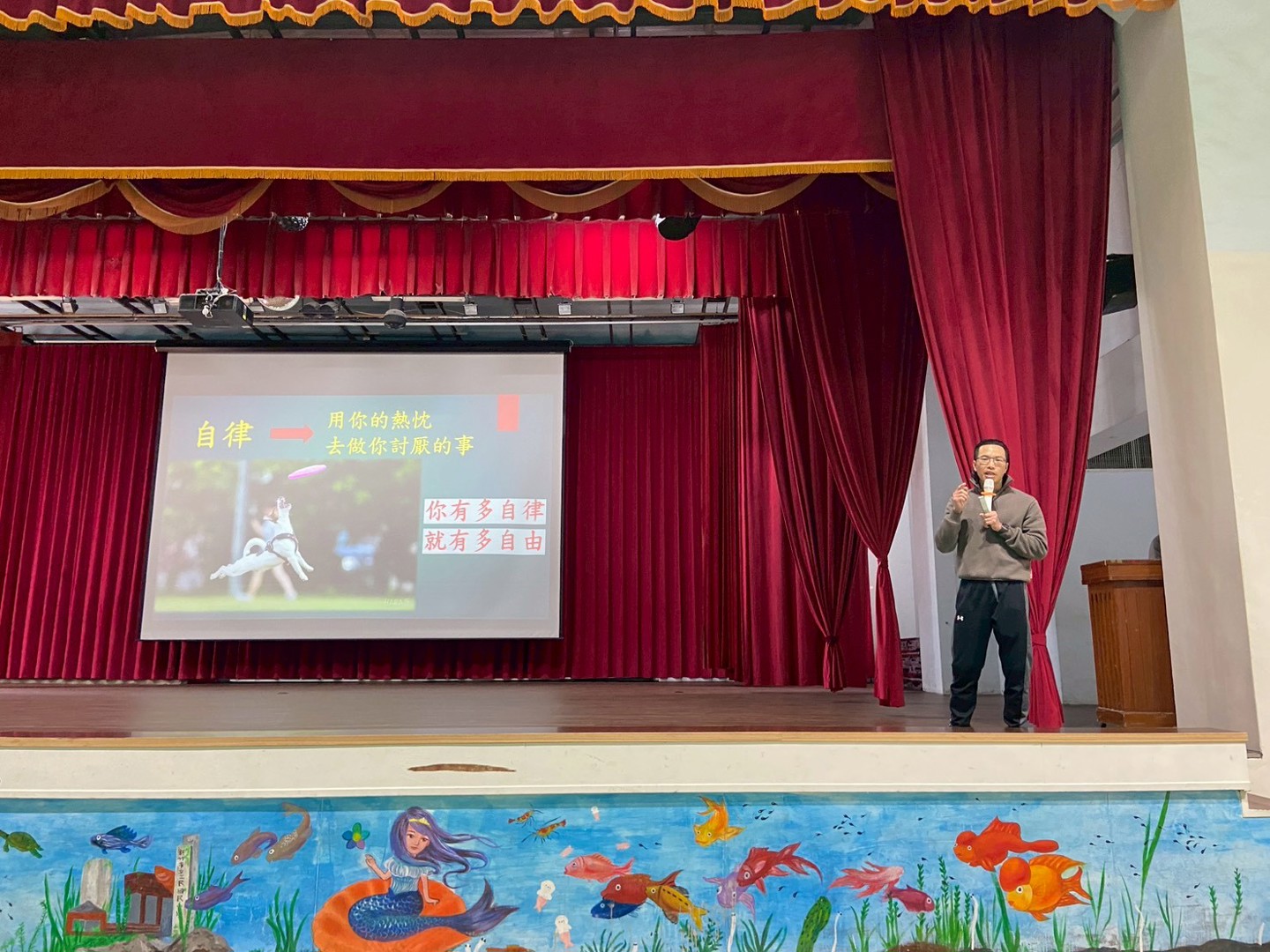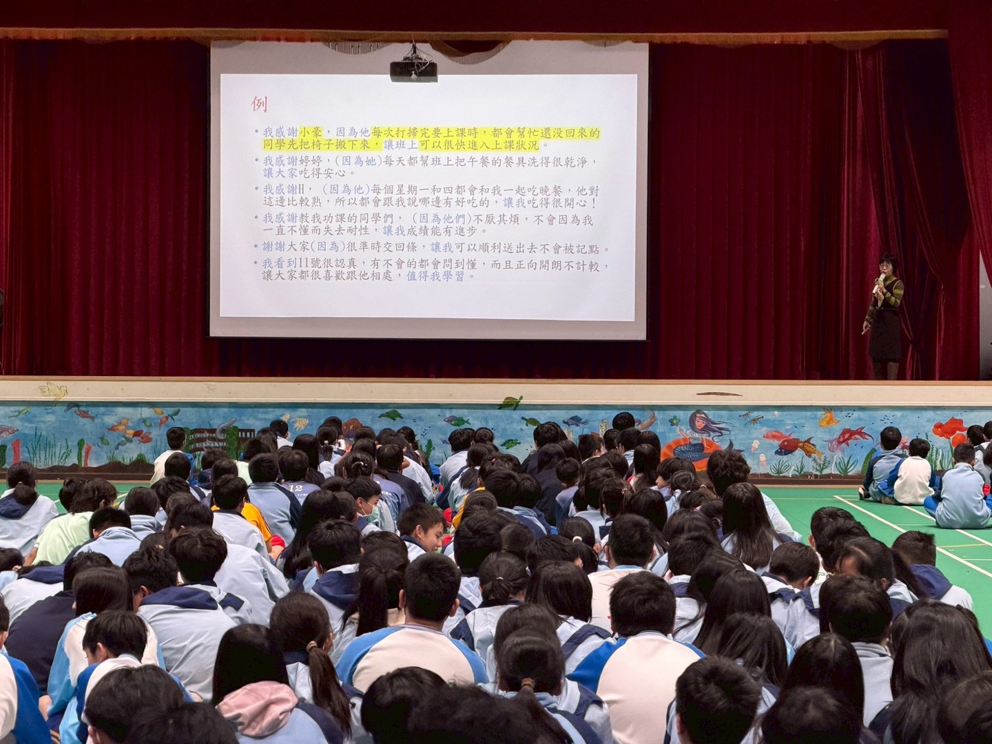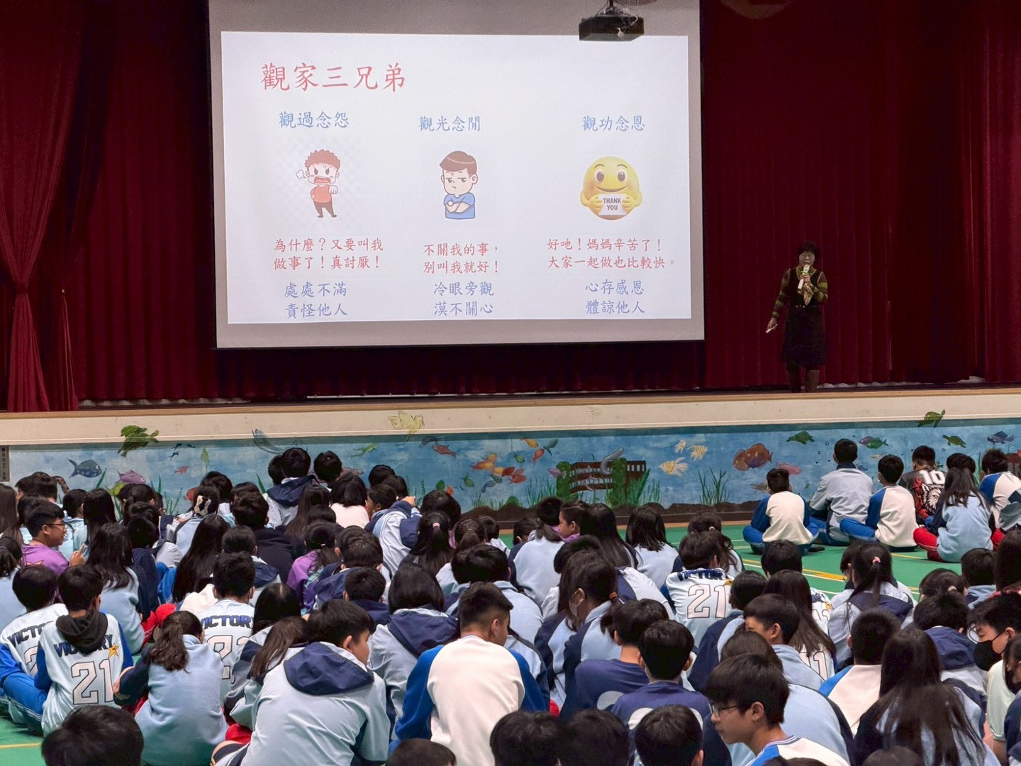 3/12七年級民師講堂時間,輔導處安排了一場觀功念恩講座,由輔導處張玉玲組長為大家介紹"觀功念恩"這個快樂的祕訣、"觀功",就是看到他人的亮點,"念恩"則是感謝他人為我所做的。透由簡單的公式句型,可以很容易操作練習,會發現日常生活中很多看似平常的小事,都可以看有人為我們用心的付出, 進而形成正向思考的習慣,在平日的人際互動中,感受到更多幸福;在遇到不如意的情境時,也較能找到男一個思考角度,幫助自己跳出煩惱的黑洞。接著由學務處郭福鈞組長現身說法,分享自己成長的故事,從大人口中的"猴囝仔",到年少輕狂,一直到今天成為受尊敬的師長,以及金牌選手,他看到了父母撐持家務的不易、師長對他的包容和協助、家人的溫暖支持,以及伙伴們的全力相挺,生命中許多貴人,造就了他的成功,同時也給同學一個重要的概念--自律,高度自律才能有高度的自由。同學們對老師的提問都很樂於舉手回應,甚至願意上台發表心得或給老師回饋,而且台下同學們對同學的回答也都自動報以掌聲,看來已經在往觀功念恩的方向前進了,願大家都能領納於心,緊緊握住這快樂的祕訣,讓自己和身邊的人都更加幸福!