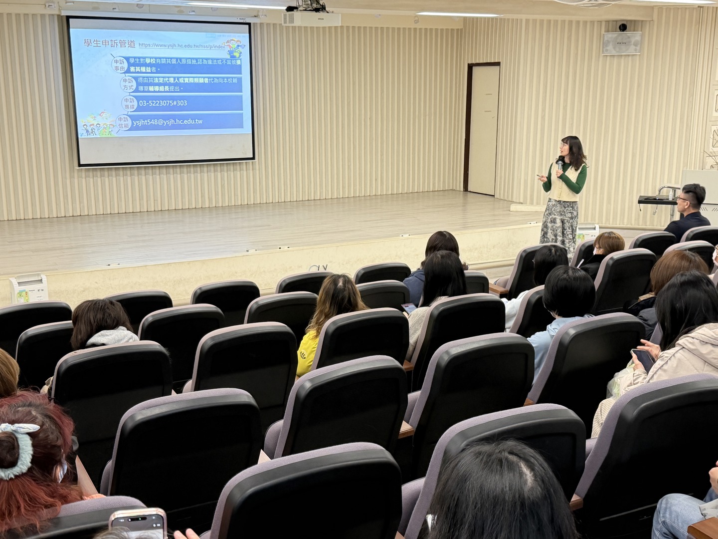 育賢國中於家長會日,向家長說明:為保障學生權益,本校依規設有「學生申訴評議委員會」。若學生對學校之懲處或行政處分認為違法或不當,致損害其權益者,家長可於期限內代為提出申訴 。