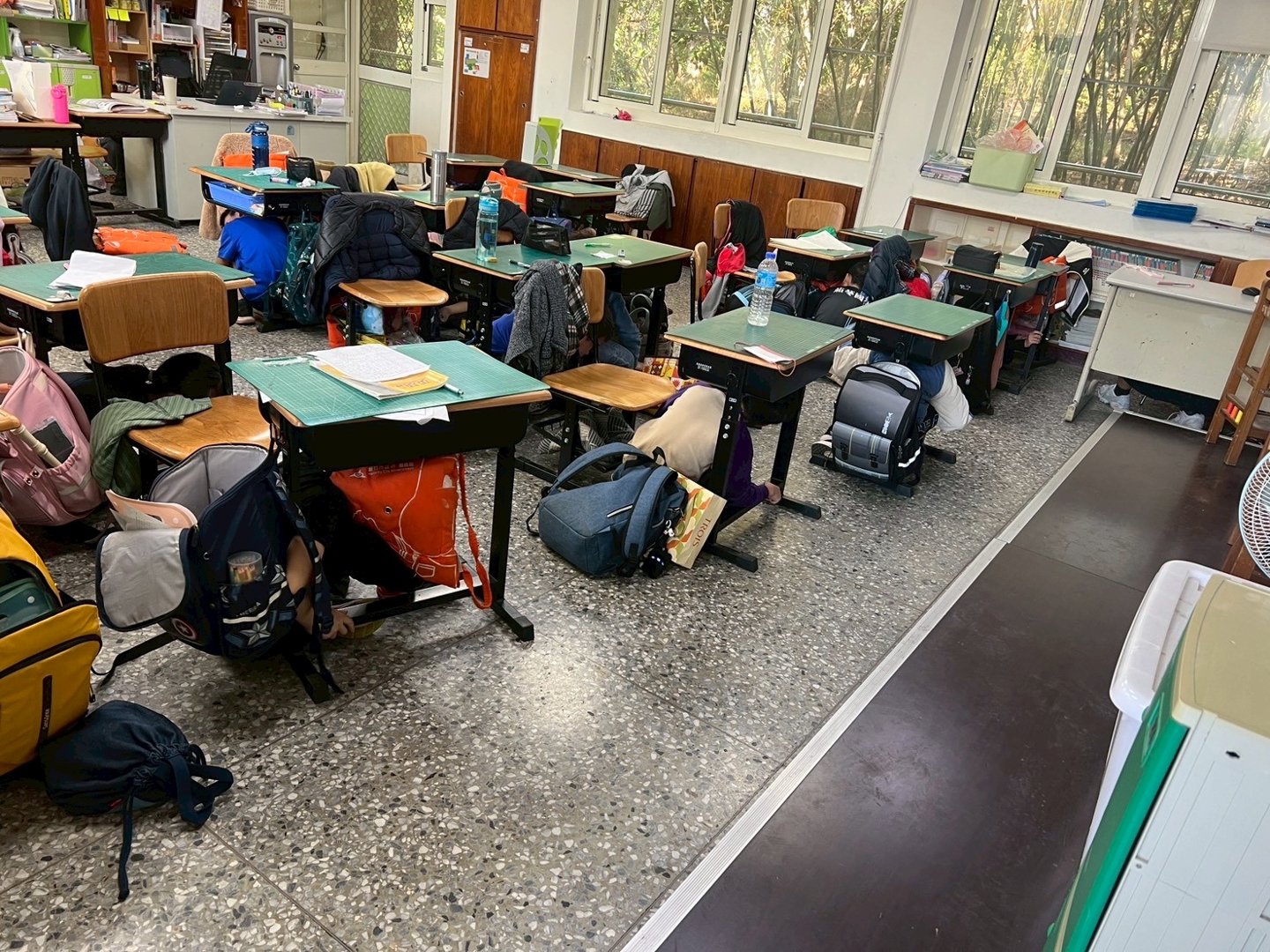 為提升師生面對地震災害的應變能力,今日辦理全校性地震防災演練,透過實際操作與情境模擬,加強學生防災意識與自我保護能力。演練當天,隨著警報聲響起,各班級立即依照「趴下、掩護、穩住」的防震三步驟進行避難,學生迅速躲至課桌下方,以書包保護頭部,展現平時訓練的成果。