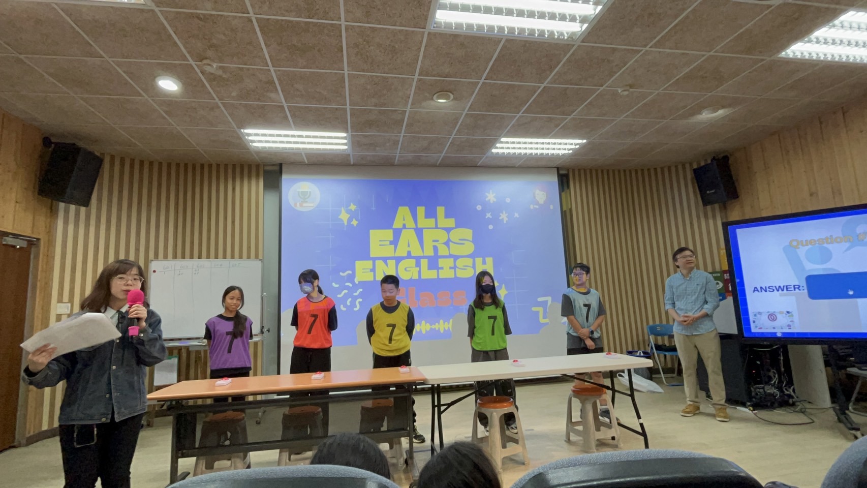 這次比賽各班都選出了 20 位英聽小高手代表班級出賽。比賽總共分兩關,大家都要一個人上場挑戰: