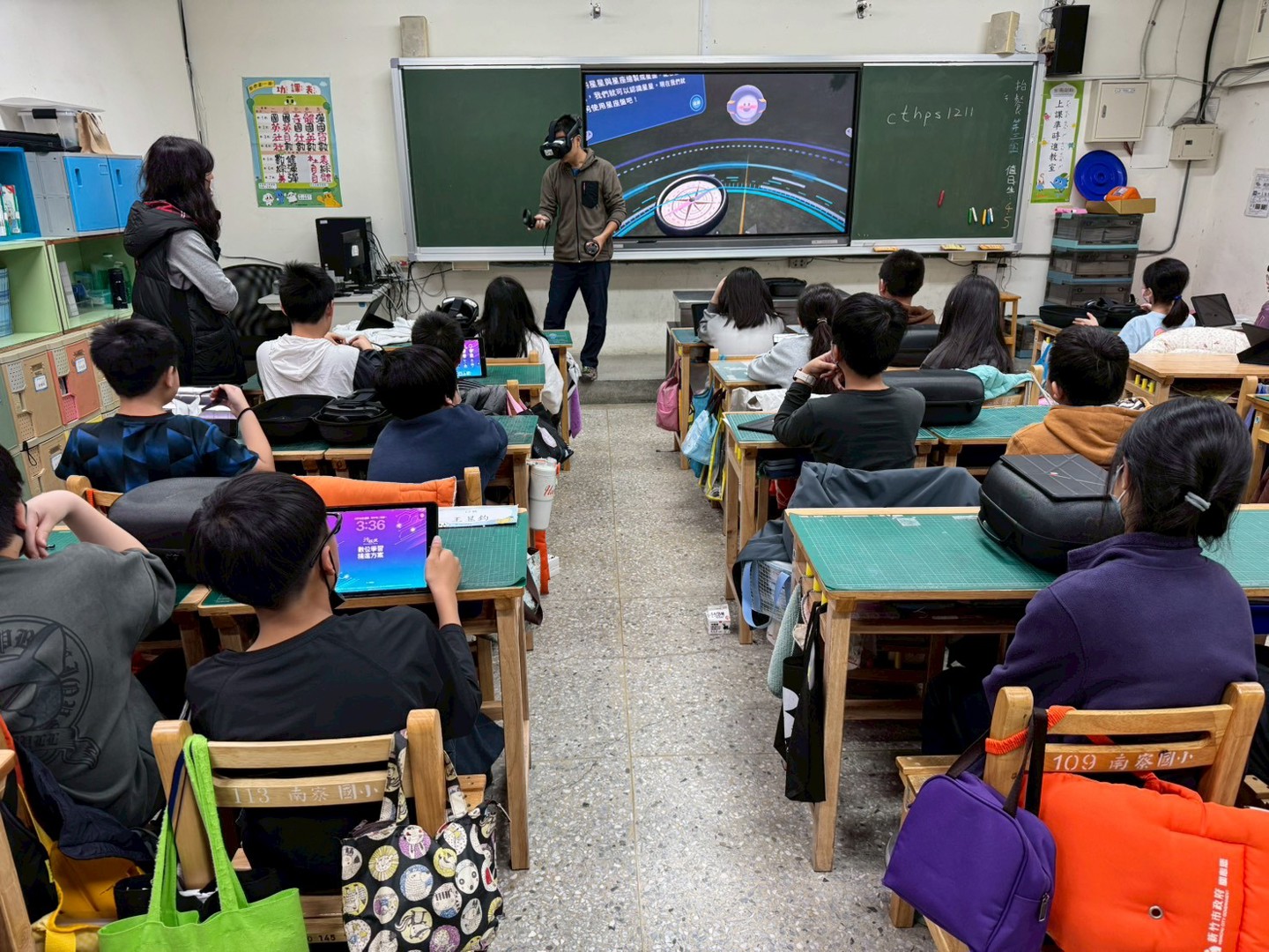 今日南寮國小邀請青草湖國小江至正老師到校進行5G智慧VR教學示範,由本校自然專長鍾秀施老師與資訊專長張惟婷老師協同教學,配合五年級自然課程中「星空與星座」的學習進度,帶領學生展開一場既新奇又貼近課程內容的星空之旅。
