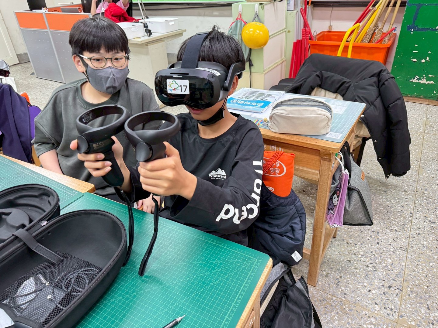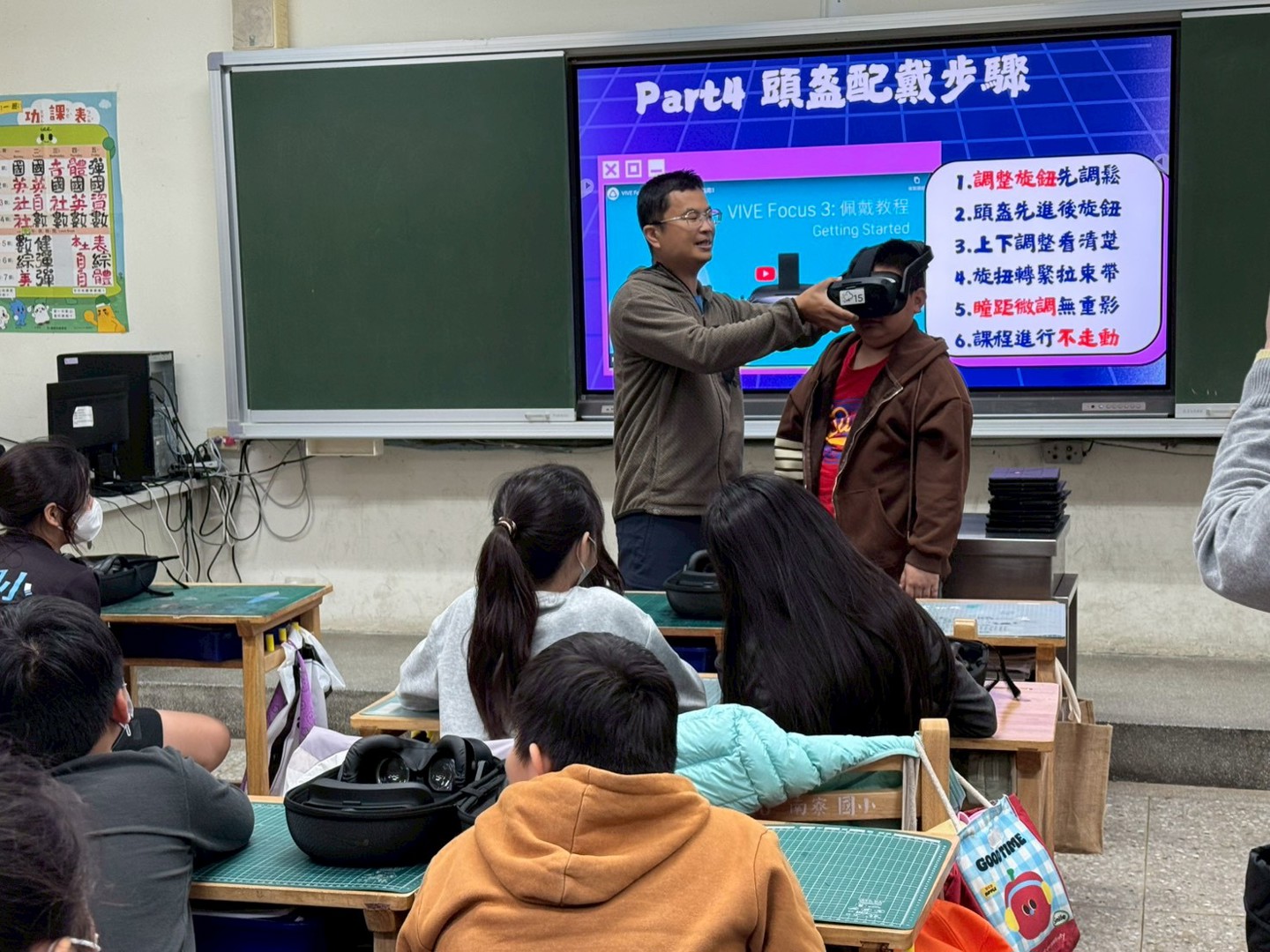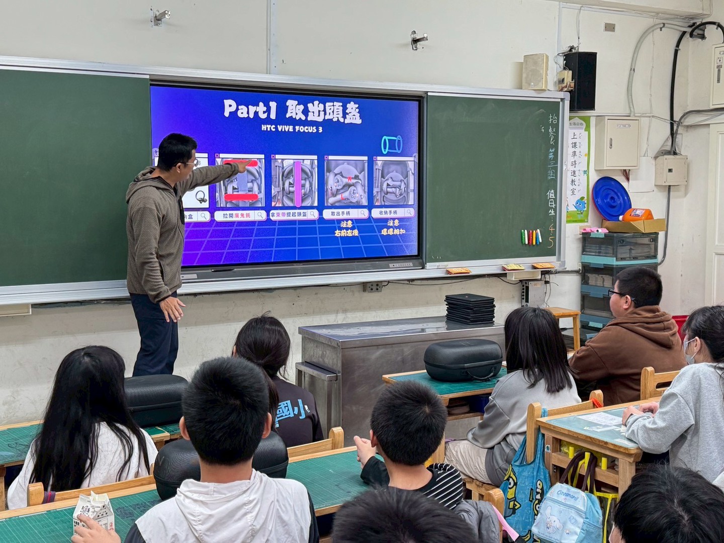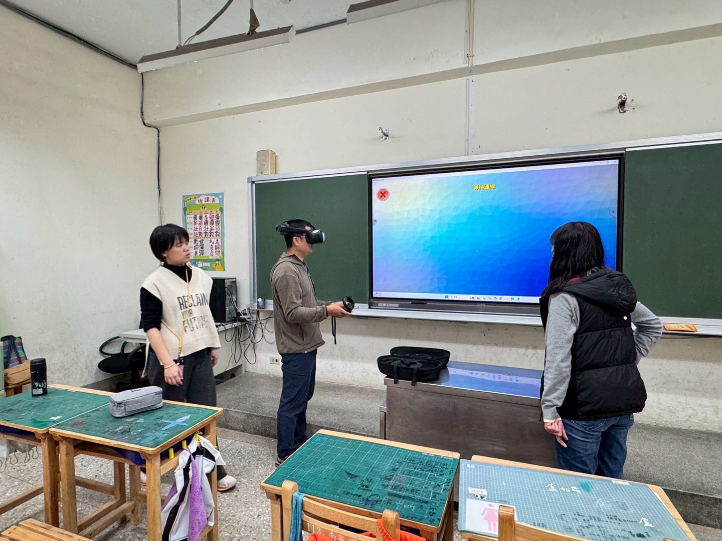 課程分成兩節進行。第一節課,至正老師先從最基本的VR操作開始教起,怎麼戴頭盔、怎麼調整清晰度、怎麼使用控制器。學生一開始還有點小心翼翼,但很快就進入狀況,有人一戴上就忍不住轉頭東看西看,有人伸手想去「抓」畫面裡的東西,整個教室充滿笑聲與驚喜。