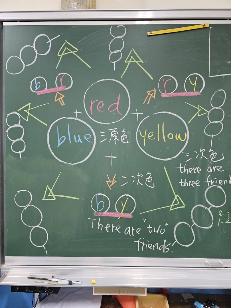 我們學習了三原色,顏色的家族、顏色的朋友,水彩可以混色與調色,蠟筆也可以。我們找了好多的相似色,他們是二次色與三次色﹗